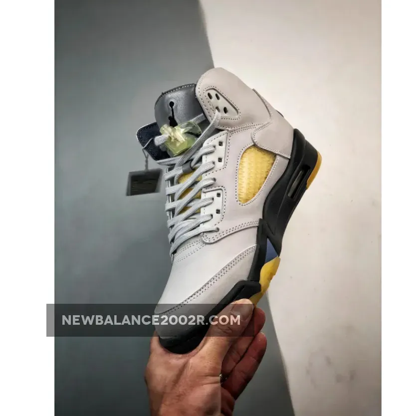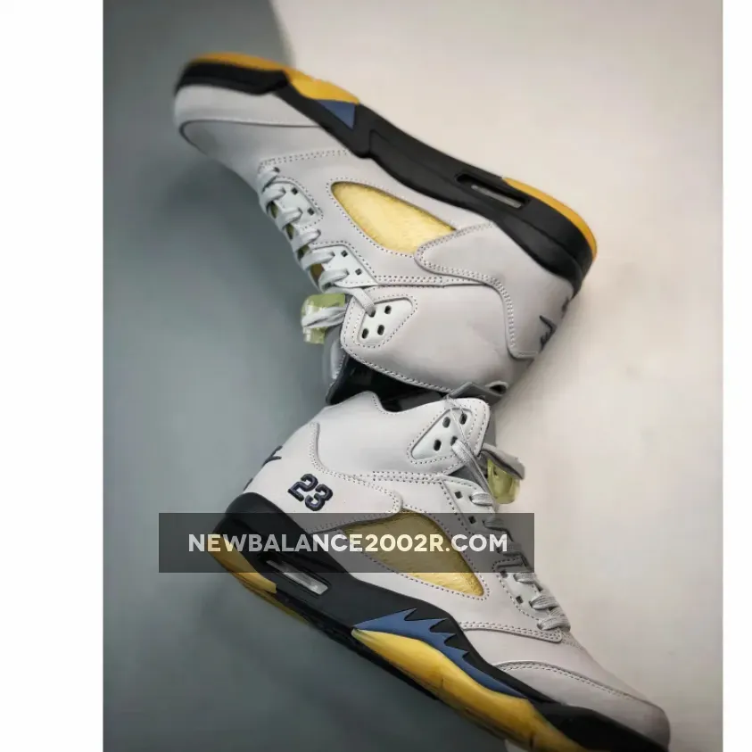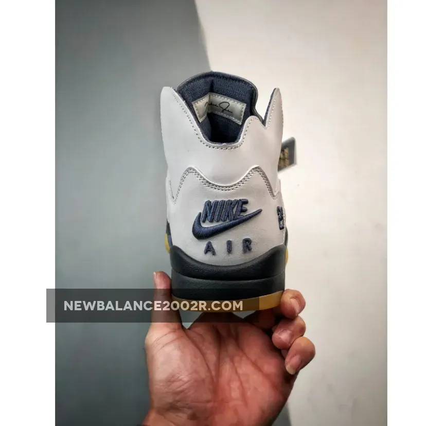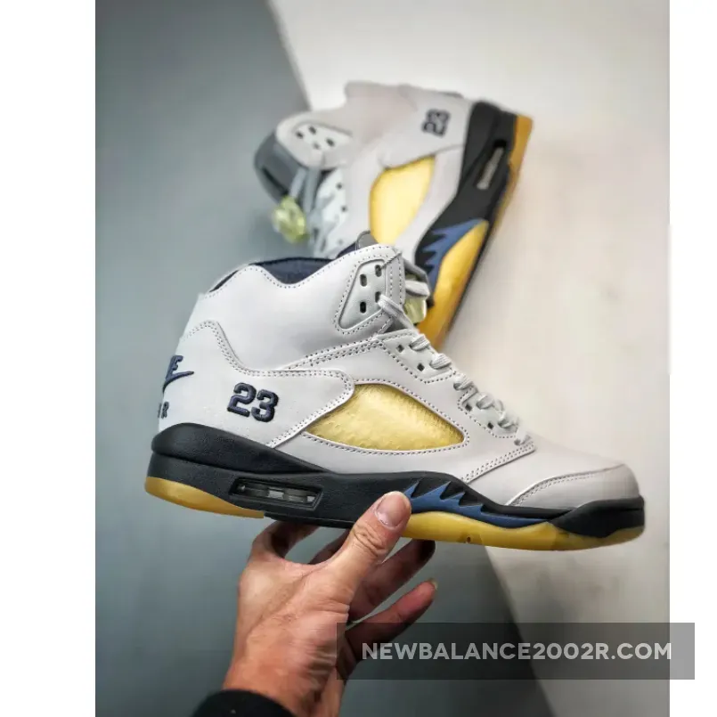 A grey ‘Photon Dust’ leather upper with ‘Diffused Blue’ accenting makes up the upper, with iconic AJ5 design features including the 23 branding on the lateral heel, Nike Air branding on the heel, and the P-51-inspired flames on the midsole.