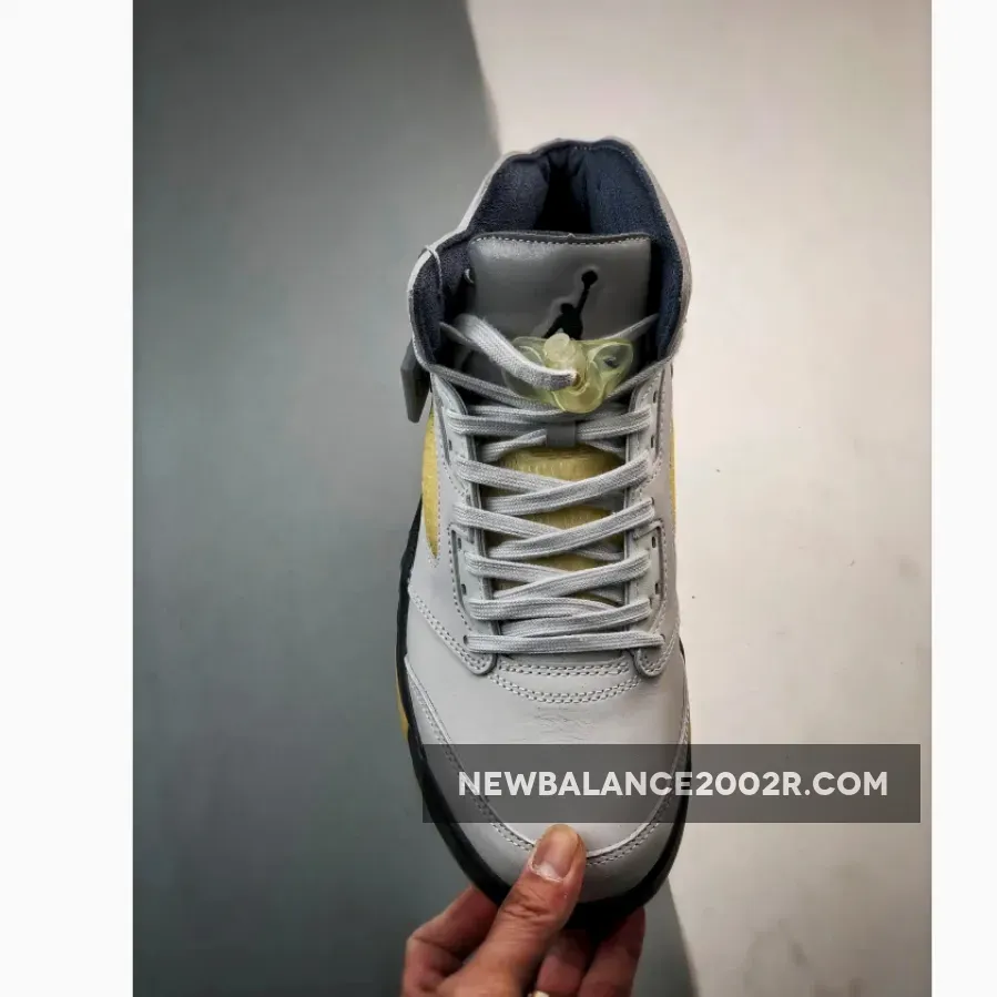 The design features pre-yellowed netting on the tongue and quarter panels, which look to be in a repeating pattern featuring A Ma Maniére’s ‘A’ logo. As the AJ5 is known to be a bit chunky, they’ve slimmed the sneaker down on the ankle collar and tongue, with the latter featuring A Ma Maniére branding and the Jumpman on the respective left and right reflective tongues.