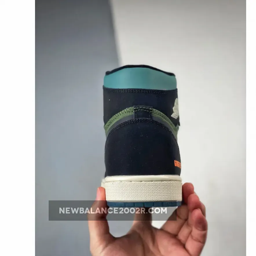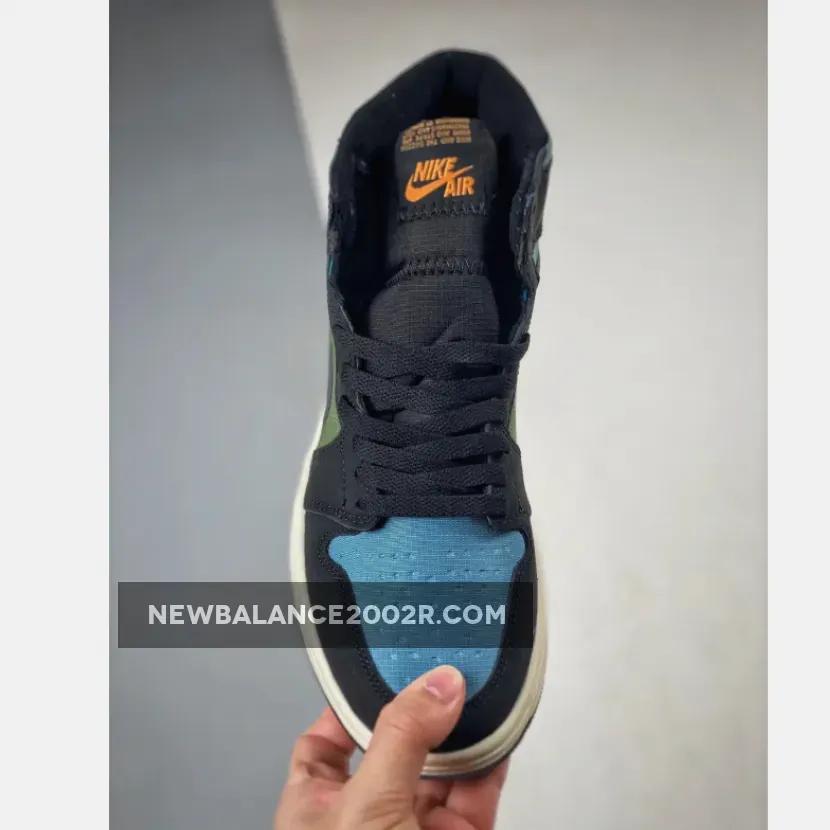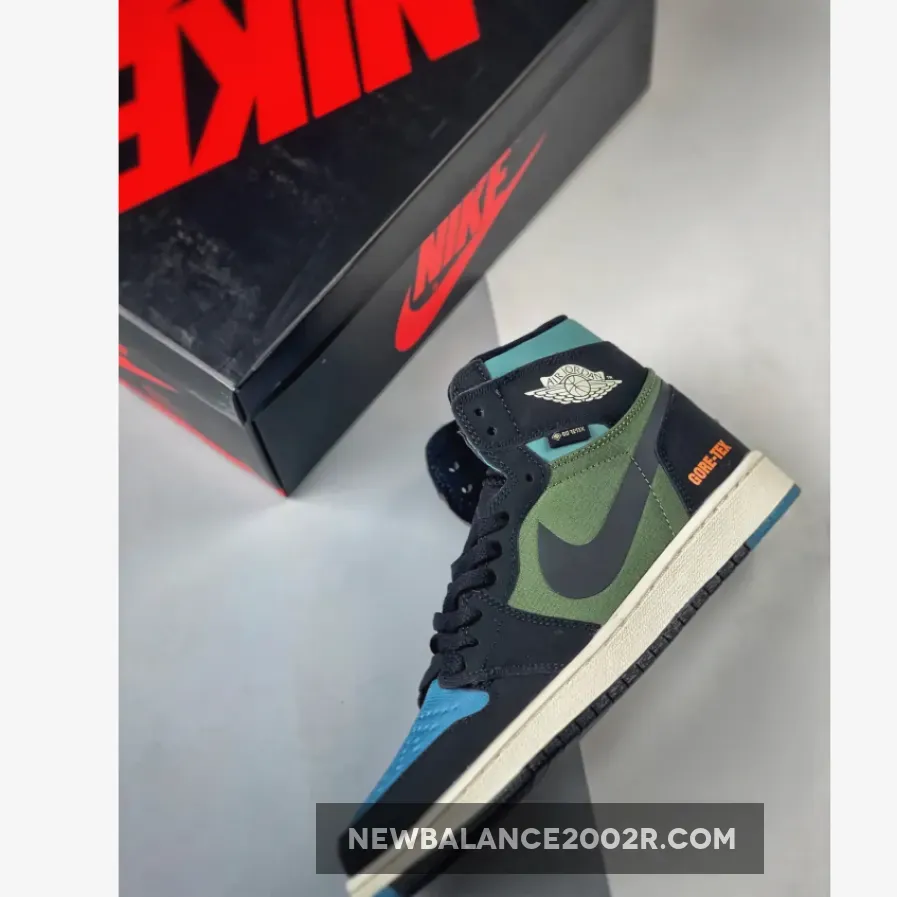 The winterised Jordan 1 starts with a blue ripstop mesh vamp with olive green ripstop fabrics encompassing the quarter panels. Nubuck and nylon materials come together across Peter Moore’s design in a familiar, but updated way. Meanwhile, black nubuck leather overlays wrap most of the upper, juxtaposed with a blue nubuck collar and a white Jordan Wings symbol on the lateral. “GORE-TEX” text are stamped onto the lateral heel, marking the sneaker’s protection against the elements. Bright orange accents illuminate the Nike Air labels on the tongue, while co-branding on the sockliners arranges a complementing blue and orange hue. The sail white midsole adds a touch of vintage that harkens back to the silhouette’s ‘80s origins. The pair also features an experimental, “deconstructed” aesthetic that works well with the toughness of the Element GORE-TEX makeover. Underfoot, the outsole opts for a partly transparent finish that increases grip in tough conditions.