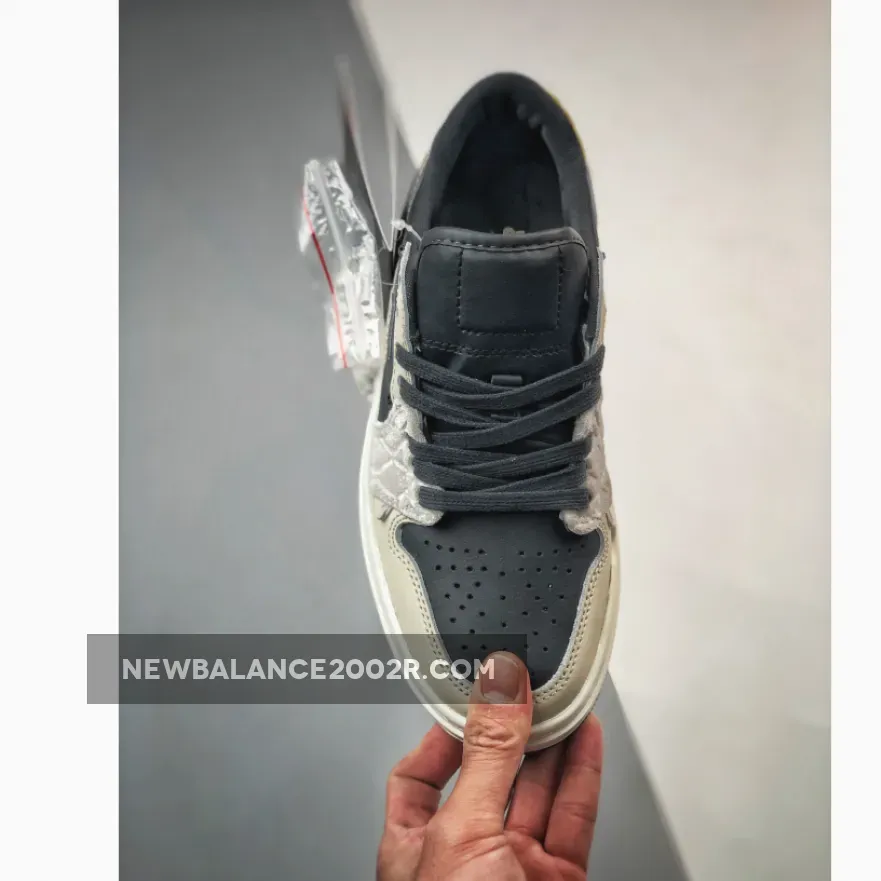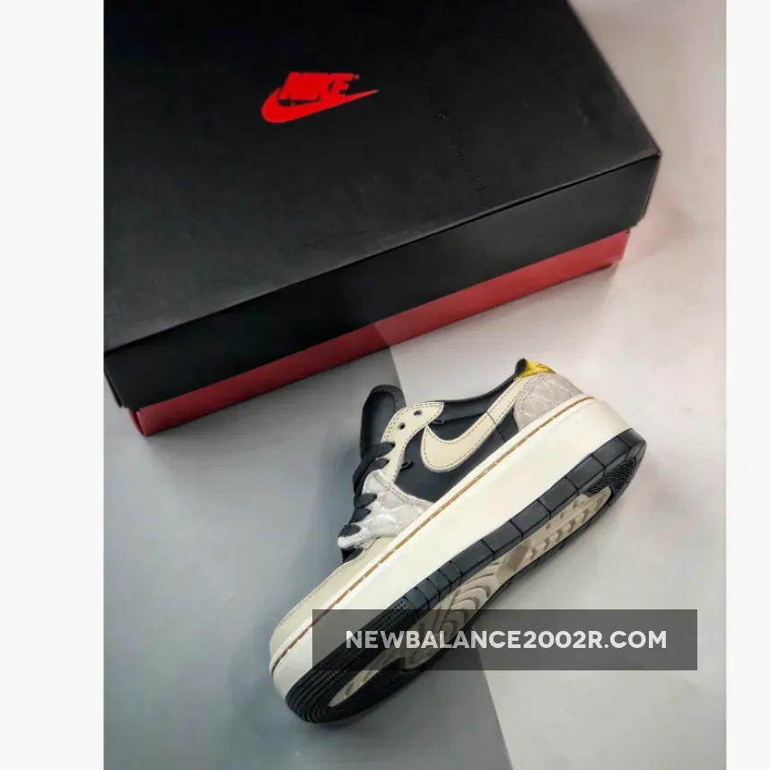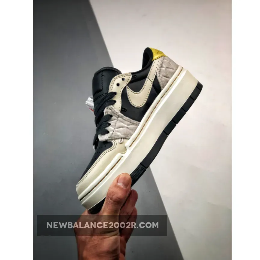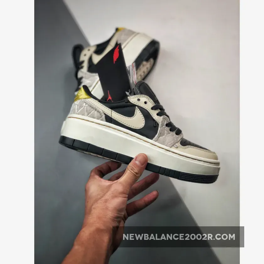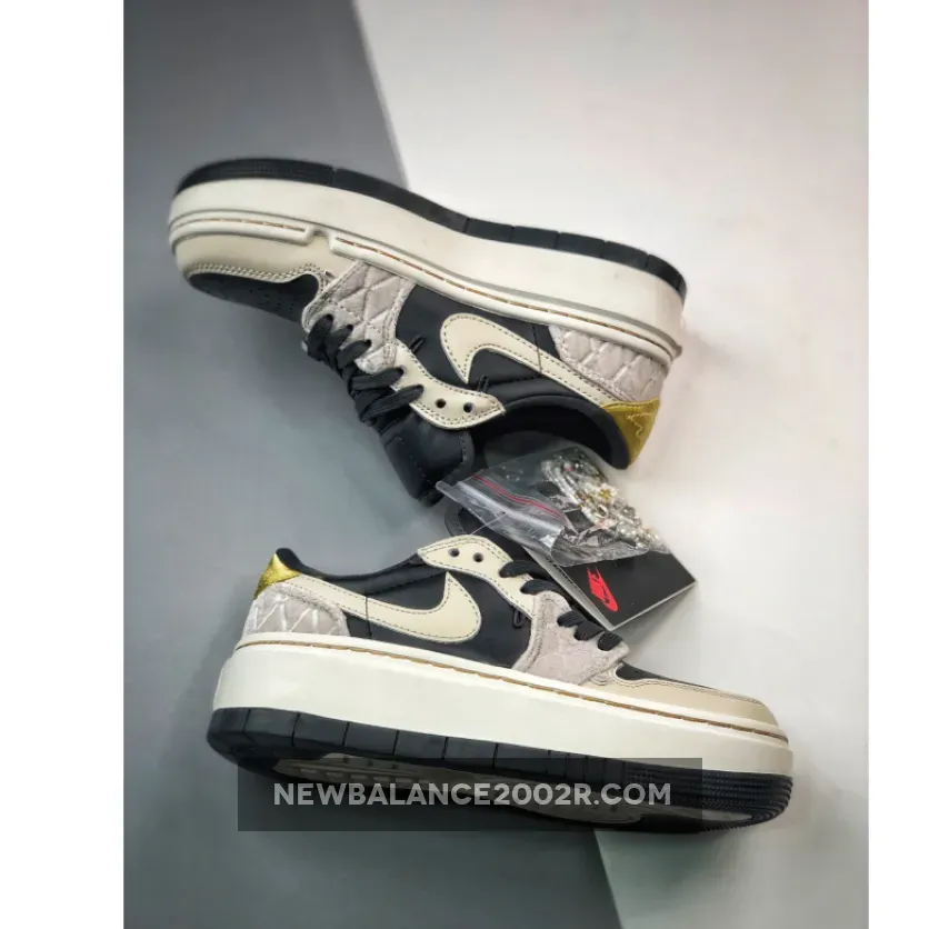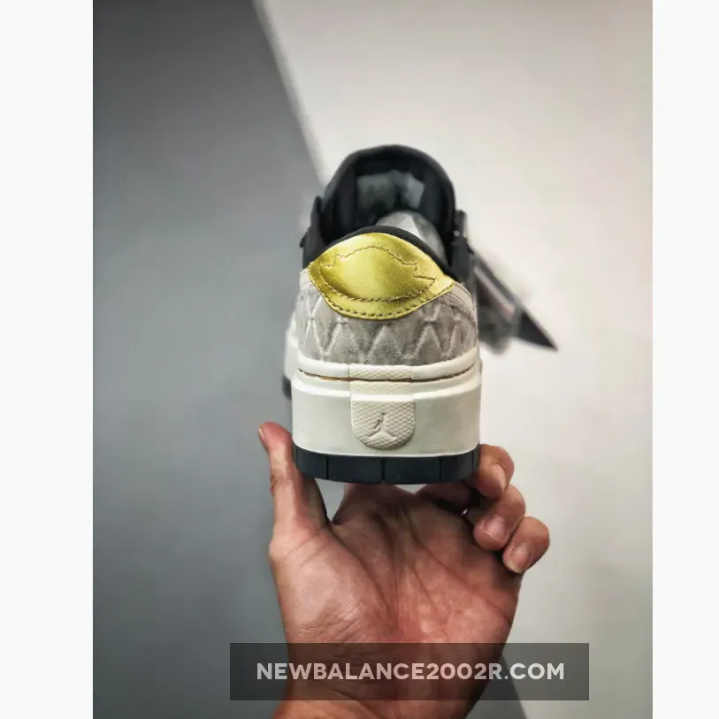 This women’s rendition of the Air Jordan 1 Low comes constructed in a mix of leather and plush suede materials dressed in Black, Grey, and Gold tones. Other details includes loops to add its removable beaded bracelets along is lacing system.