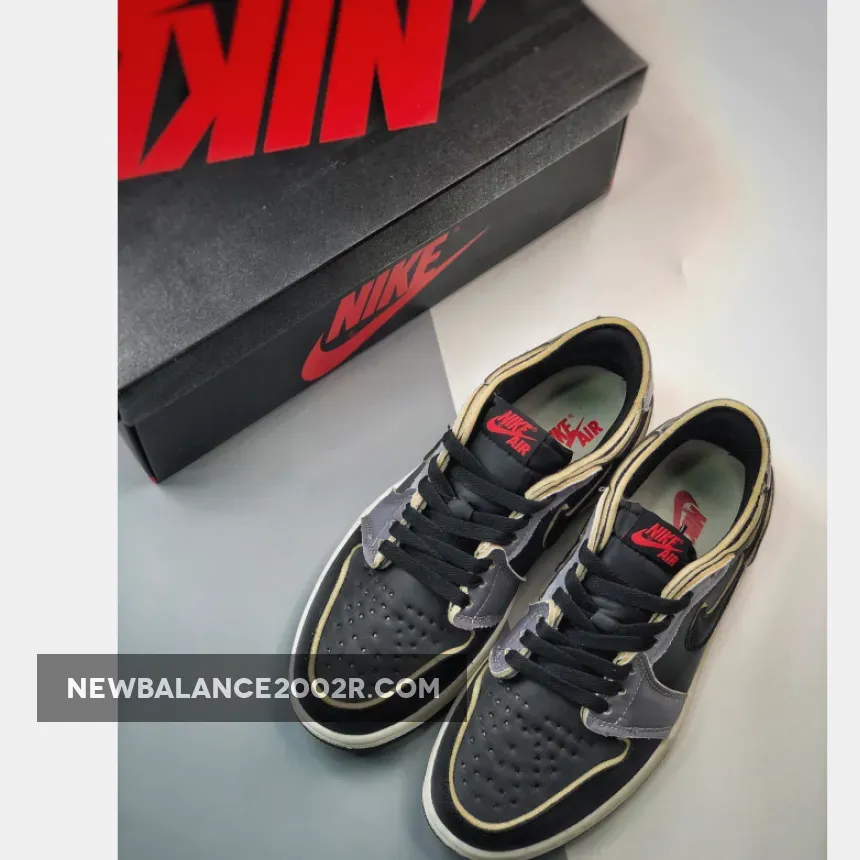 It’s been a long time since 1985 but the Air Jordan 1 continues to innovate. One of its recent iterations experiments with a deconstructed look. Introducing the Air Jordan 1 Retro Low Ex Black Smoke Grey. The base of this AJ1 is black ballistic nylon. The dissected aesthetic of this shoe comes in the form of exposed foam overlays in black on the toe cap and Smoke Grey on the eye stay panel, the heel counter and the collar edge of the heel tab. Even the black nylon profile Swooshes on both sides of the shoe are distinguishable because of their purposely unfinished edges. Nike Air branding in bright, contrasting red stand out on the nylon tongue and the black insole.