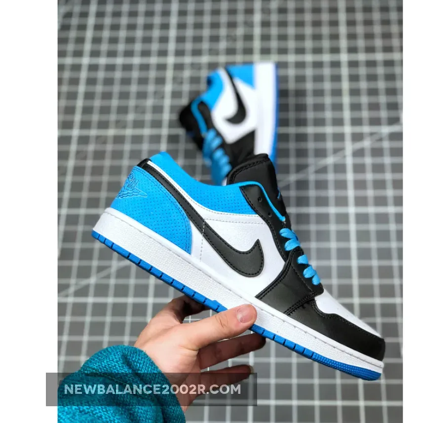The blue accents that give the shoe its name are present on the perforated suede heel and collar — an interesting alternate material choice, as the AJ1 Low usually uses leather or nubuck — plus the laces and outsole. The rest of the upper is dressed in black or white, with the former appearing on overlays, mudguards, tongues and Swooshes, while the latter graces toeboxes and quarter panels. Although the colorblocking is not identical, the overarching palette bears a noticeable resemblance to artist Todd Bratrud‘s Nike SB Dunk High “Send Help” from 2006. What’s more is that the coloring and perforations also resemble 2009’s skateboarding-ready Air Jordan 1 Phat Low “Laser Blue.” Non OG-style Air Jordan 1 Lows also add a substantial dose of extra branding, all of which is present and accounted for here. Tonal ball-and-wings graphics hit the heel, and tongues offer a small blue Jumpman on the top plus Michael Jordan‘s #23 in blue on the lace keeper. White midsoles and the aforementioned blue outsoles round things off, with blue flat laces and black rope laces allowing the wearer to add a personal touch.