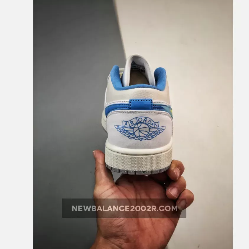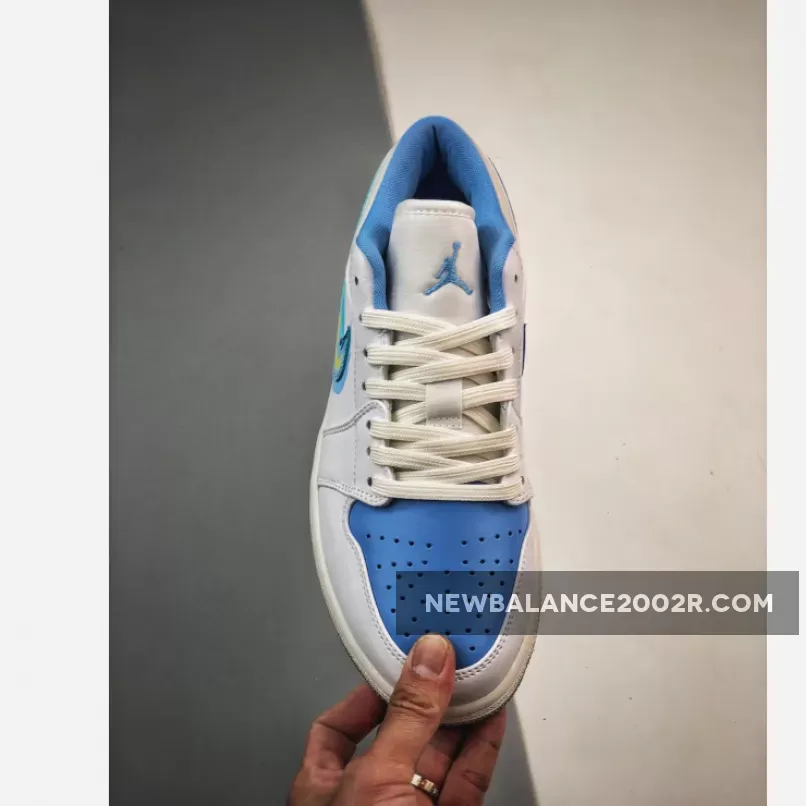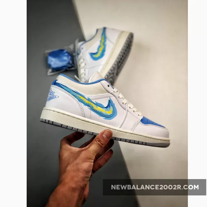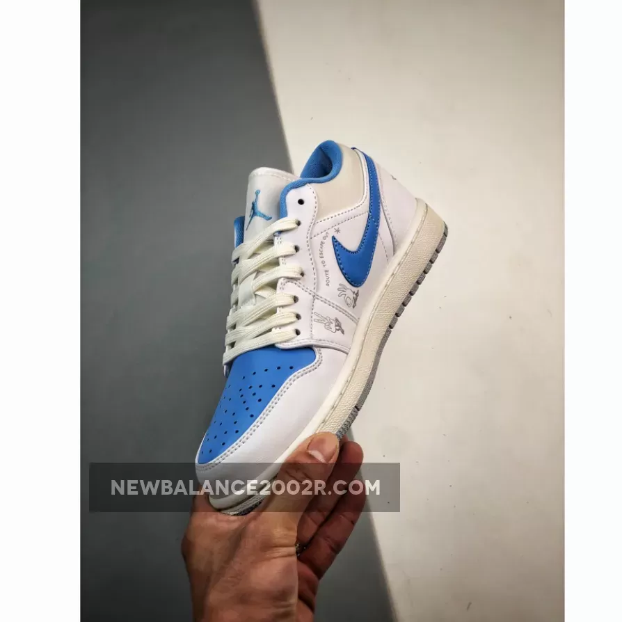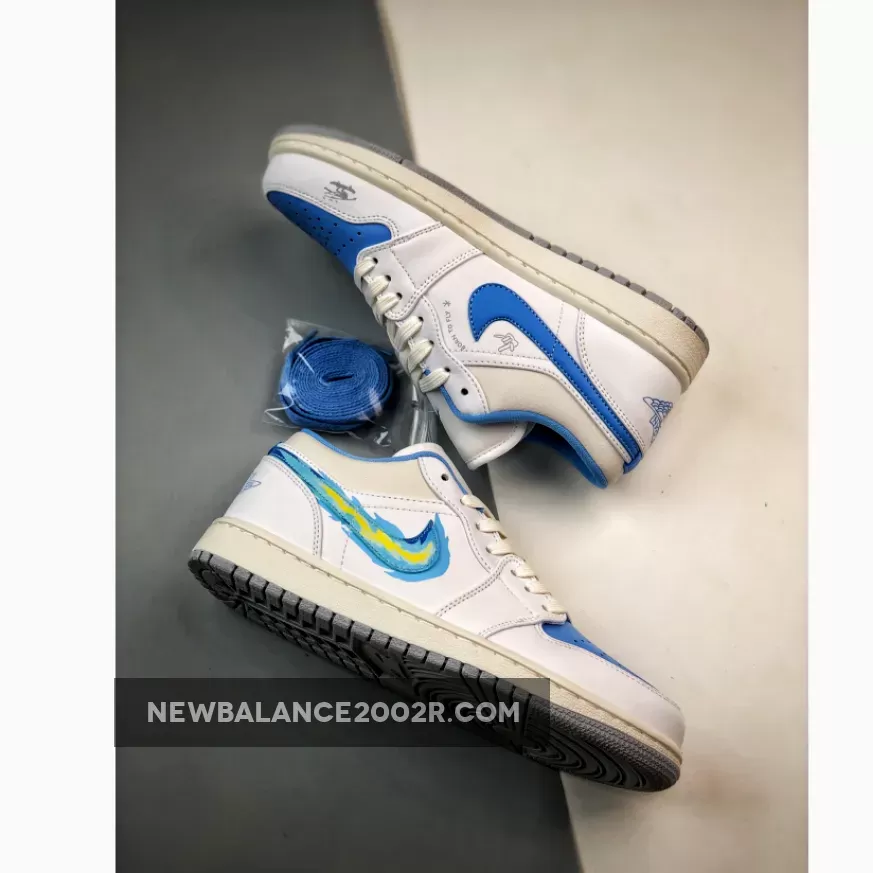 Seen here in an all-leather upper, the model features hits of cream/white with accenting university blue shades seen throughout. This blue hue takes over the toebox, Jordan branding, and sockliner, while all panels (minus the collar’s creamy hit) take on a stark white finish. Along the midfoot, the Swoosh logo gets covered in a blue flame graphic on the lateral side, while the medial side features a solid university blue Swoosh. Although this medial side forgoes the custom graphic, there are unique details like “Born To Fly” text and skate-friendly graphics in a grey hue. Back on the heel, the Jordan Wings logo appears drawn on the upper in university blue. Finishing the custom graphics are the nods to skateboarding on the reverse of the tongue, with the left sneaker showcasing an on-fire skateboard and the right hosting a book titled “Just Skate.