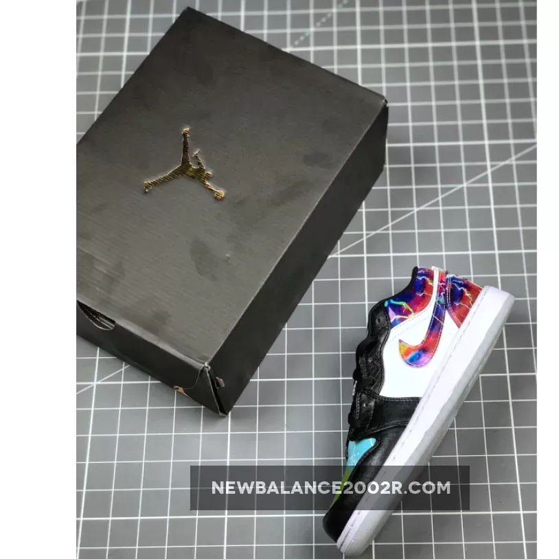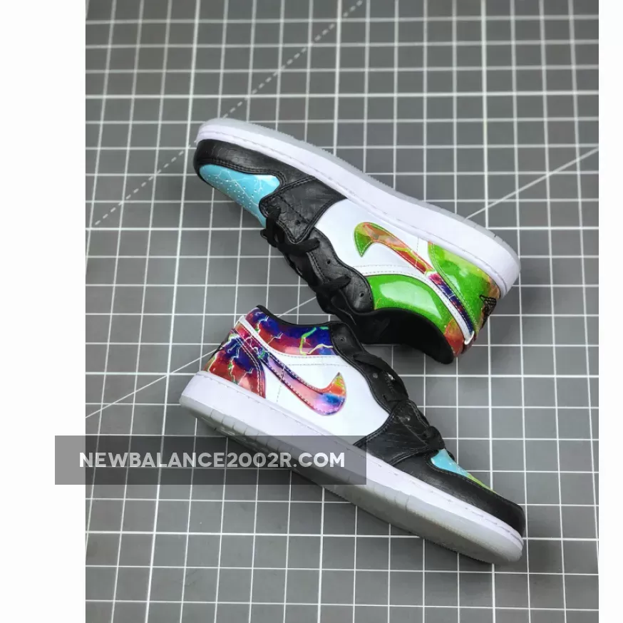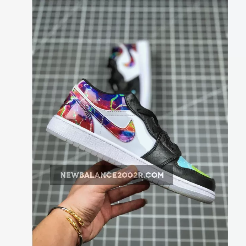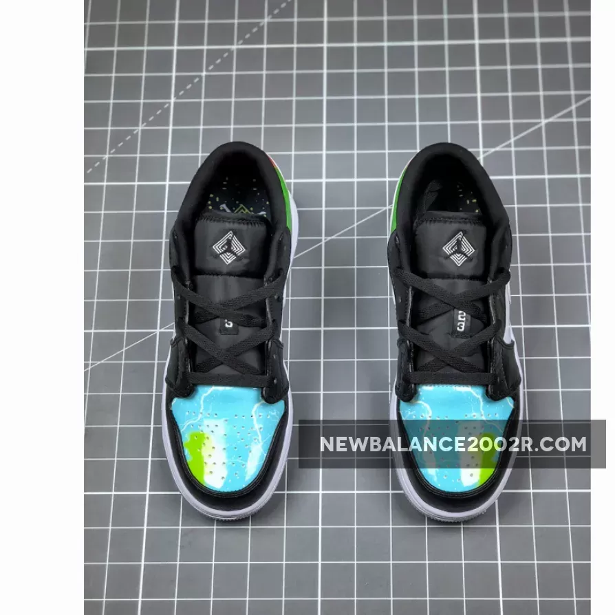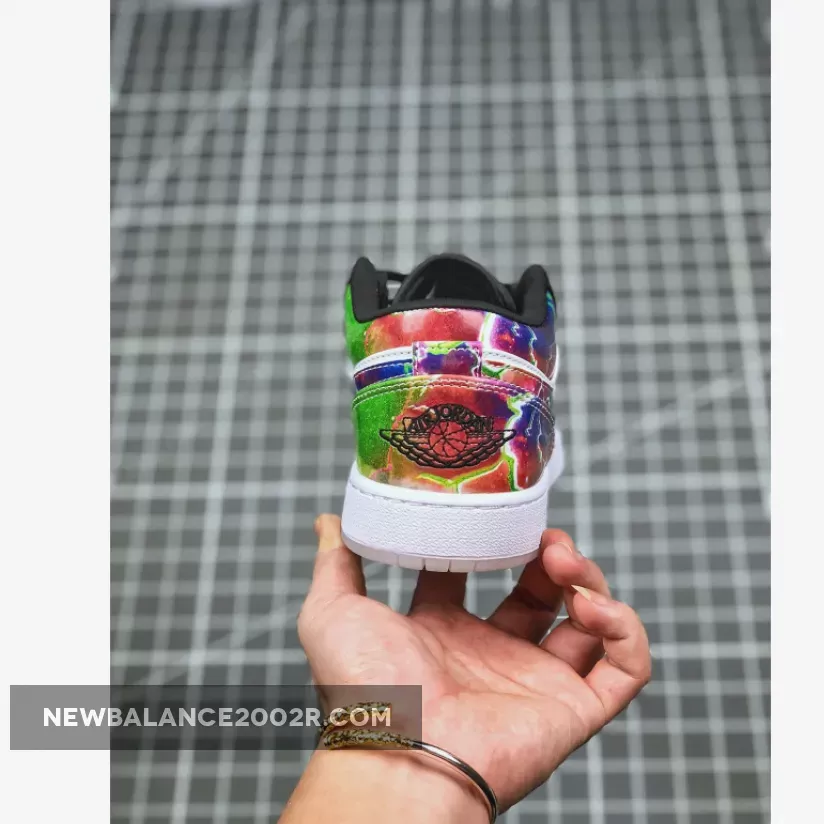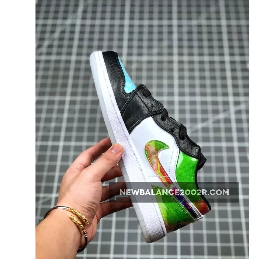 The Air Jordan 1 Low “Galaxy” is constructed from mismatched panels featuring faux black snakeskin leather, hi-gloss galaxy prints, colorful palates, and glow-in-the-dark soles. The black snakeskin dresses the toe and eyelets, while black nylon crafts the tongue and liners. “Galaxy” prints highlight the Swoosh insignia, heel overlay, and collar, while the perforated toe box is dressed in blue watercolor. To finish it all off, special branding marks the tongue tab and insoles, while glow-in-the-dark materials make up the outsole.