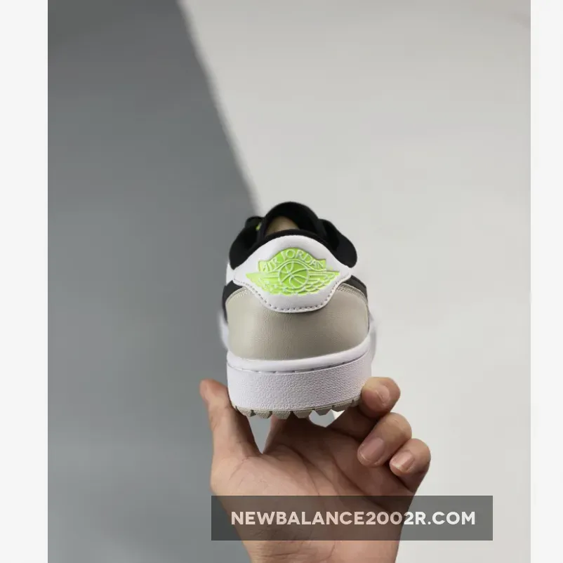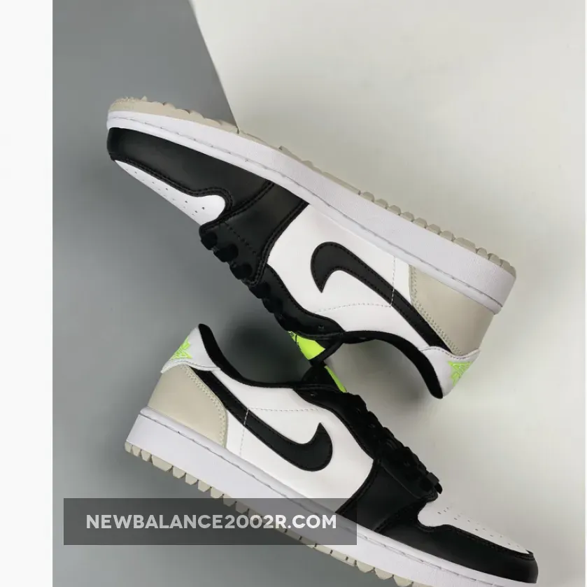 The Jordan Brand’s special golf line for its Michael Jordan tribute shoe, the Air Jordan 1 Golf, has a new iteration in minimalist hues and a burst of neon green. Presenting the Air Jordan 1 Low Golf “Black Phantom Volt”. This low-cut AJ1’s full leather upper is mostly composed of neutrals.The toe cap, mudguard, eye stay panels and signature profile Swooshes on both the medial and lateral mid-panels are all in Black, matching the laces, nylon tongues and mesh sock liner. The toe box and mid-panels are all in pure contrasting white. The heel counters, on the other hand, are in Phantom grey. The tongue tabs, insoles and “Wings” logos on the heel counters are all in eye-catching Volt green.