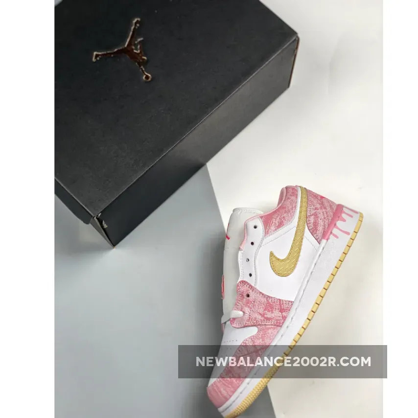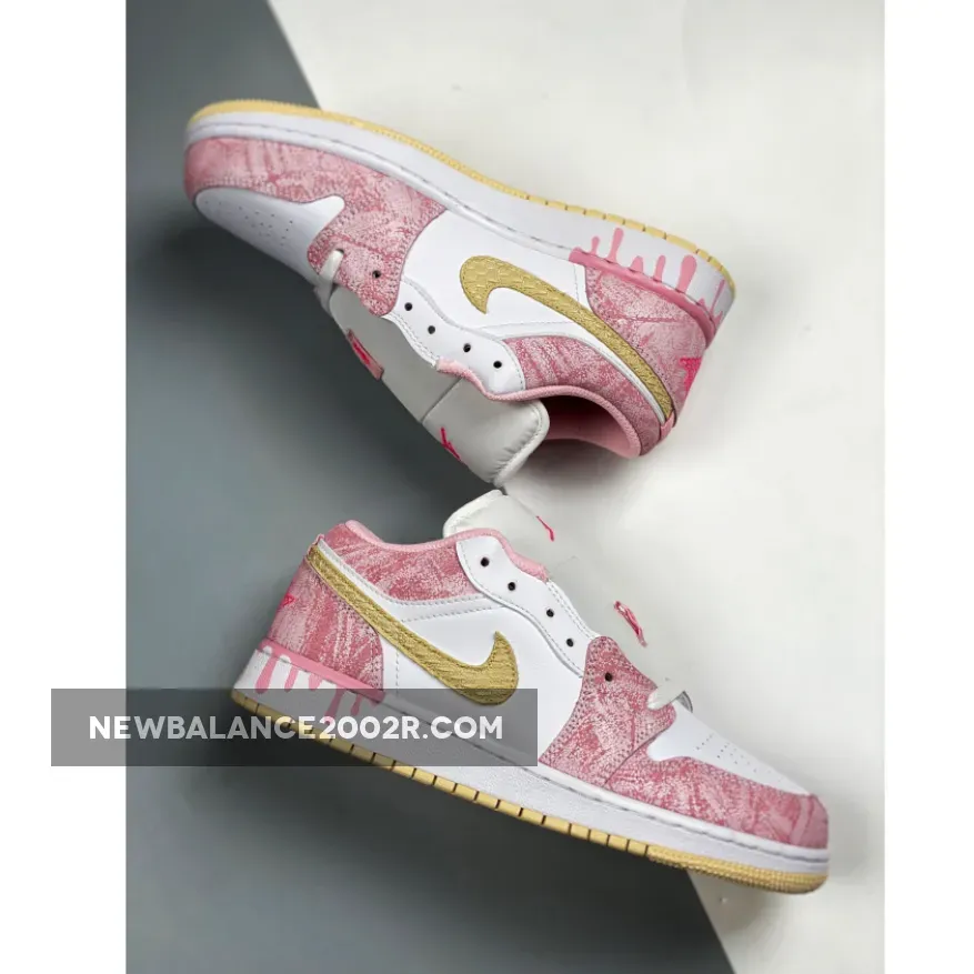 This low-top iteration of the Air Jordan 1 comes dressed in an Arctic Punch, Pale Vanilla, and White color combination. First, the pair features White leather on the base while pink drips onto the midsole along with a washed textured Pink adorns the base that resembles ice cream. Next, we have a waffle weave pattern on the Swoosh logos representing cones. A vibrant shade of Pink hits the embroidered Jumpman on the tongue, 23 on the lace overlay, Jumpman on the insoles, and embroidered Wings on the heel. Finally, a White midsole and Pale Vanilla rubber outsole finish the look.