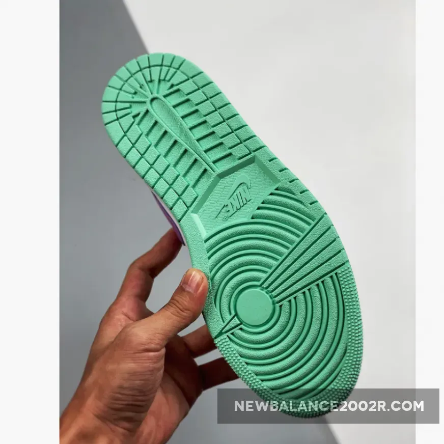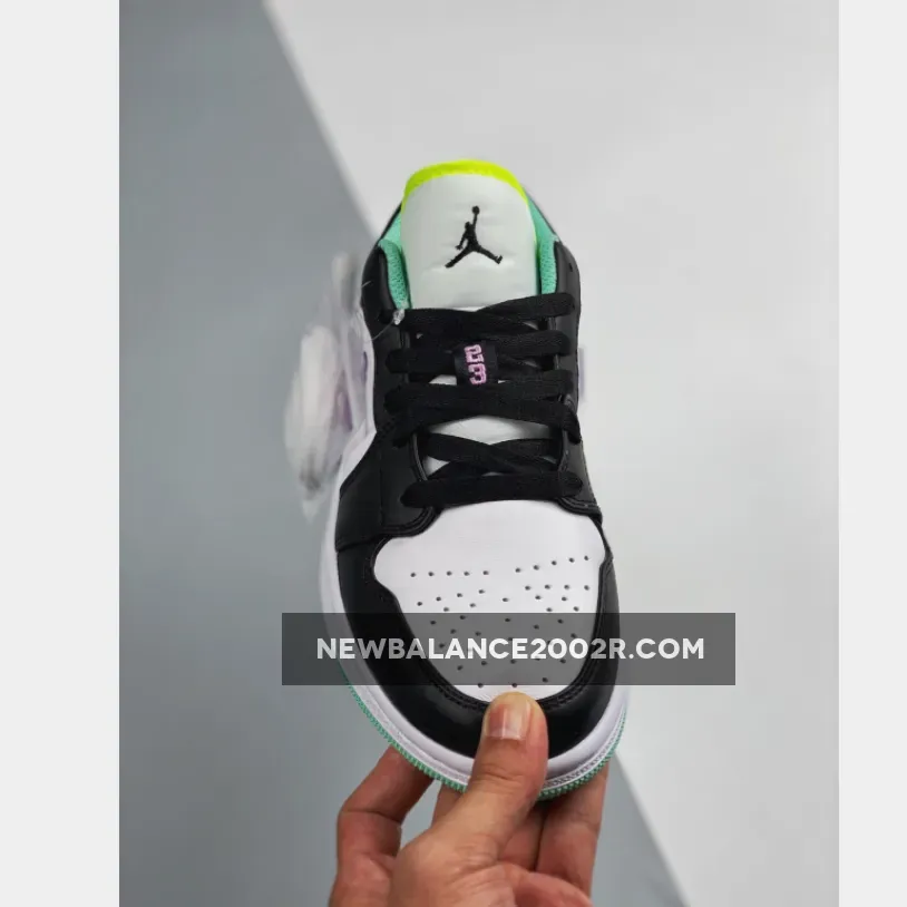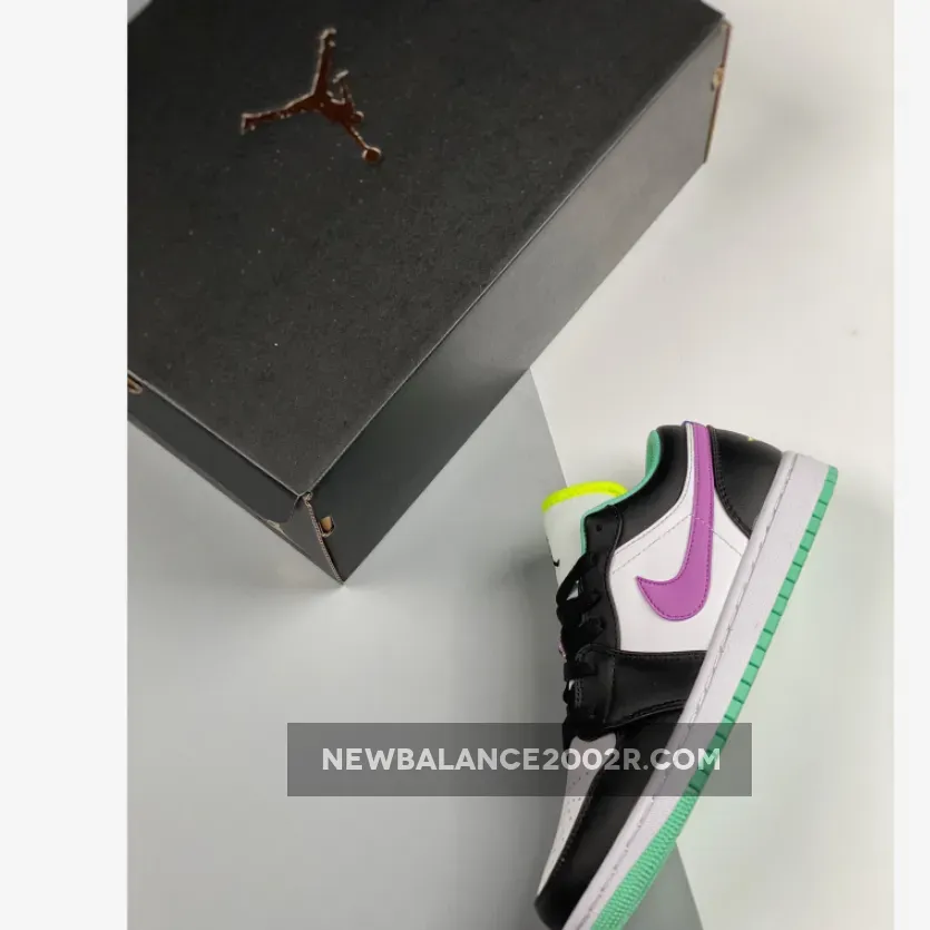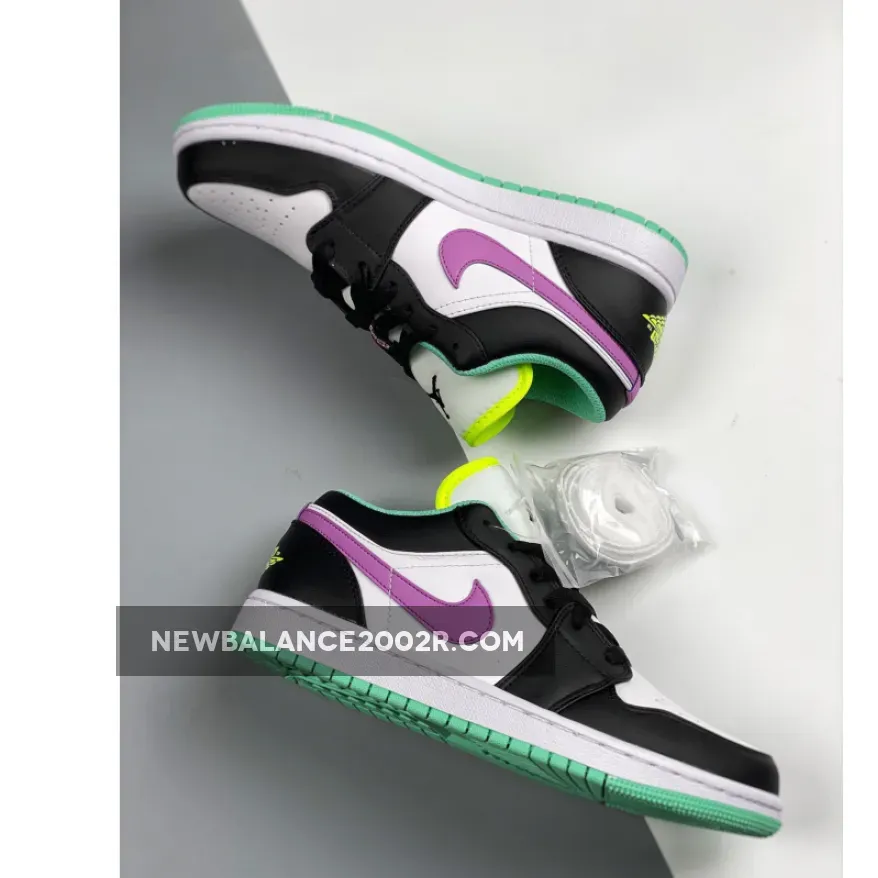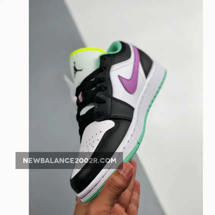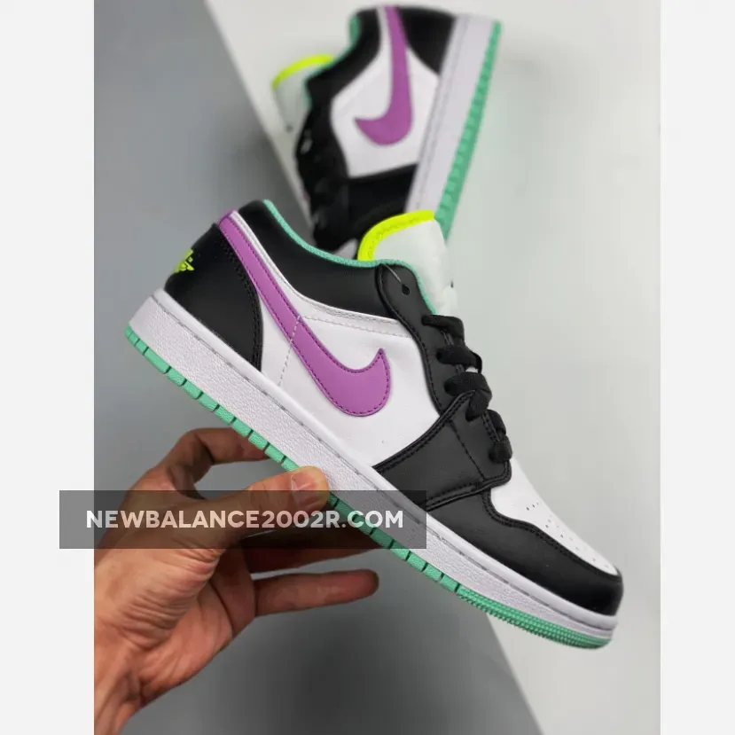 This low-top Air Jordan 1 comes dressed in a White, Black, and Green Glow color combination. First, we have White leather on the upper while Black nubuck and leather lands on the overlays. A Purple double-layered Swoosh lands on the panels, allowing it to look larger than usual. Finally, Green accents land on the liner, Wings logo, and rubber outsole.