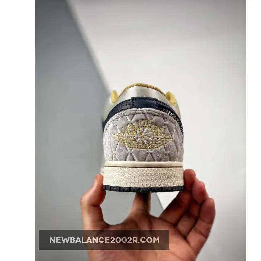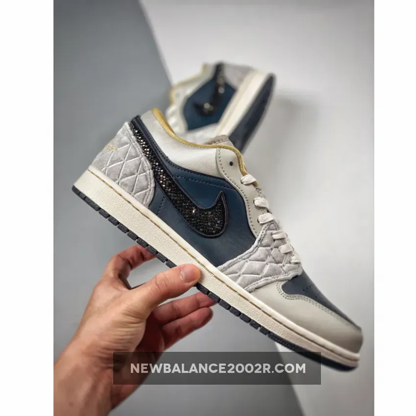 Starting with the obvious, the pair’s Swoosh overlays are dressed with small, iridescent bead detailing that plays into an overarching theme of decadence. From there, an atypical black base is paired with bone leather and satin overlays, the latter prepared in smooth finishes at the collar, and quilted argyle at the forefoot and heel. Tongues and laces follow in color, before golden threadwork at the tongue, heel, and midsole marry up with the liners for extra elegance. The pair is then completed by sail and black sole units, and a set of golden insoles.