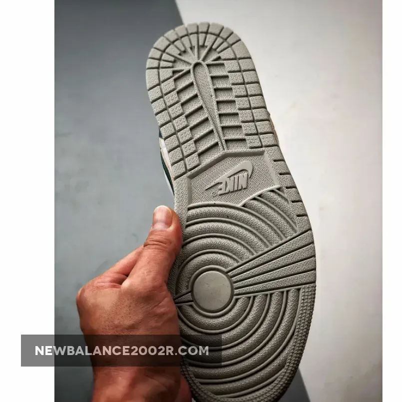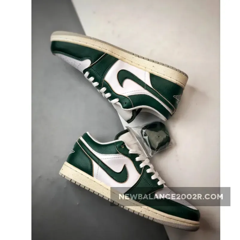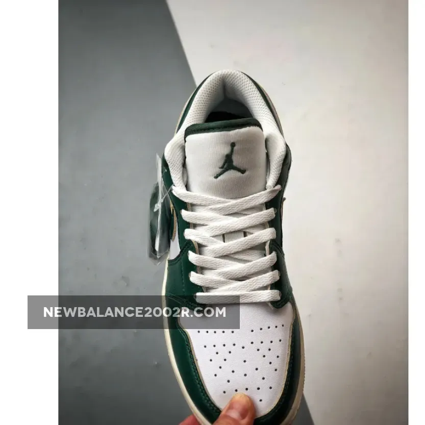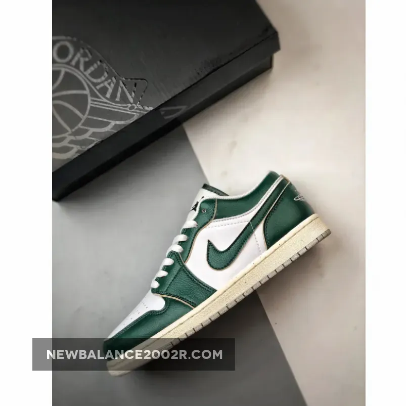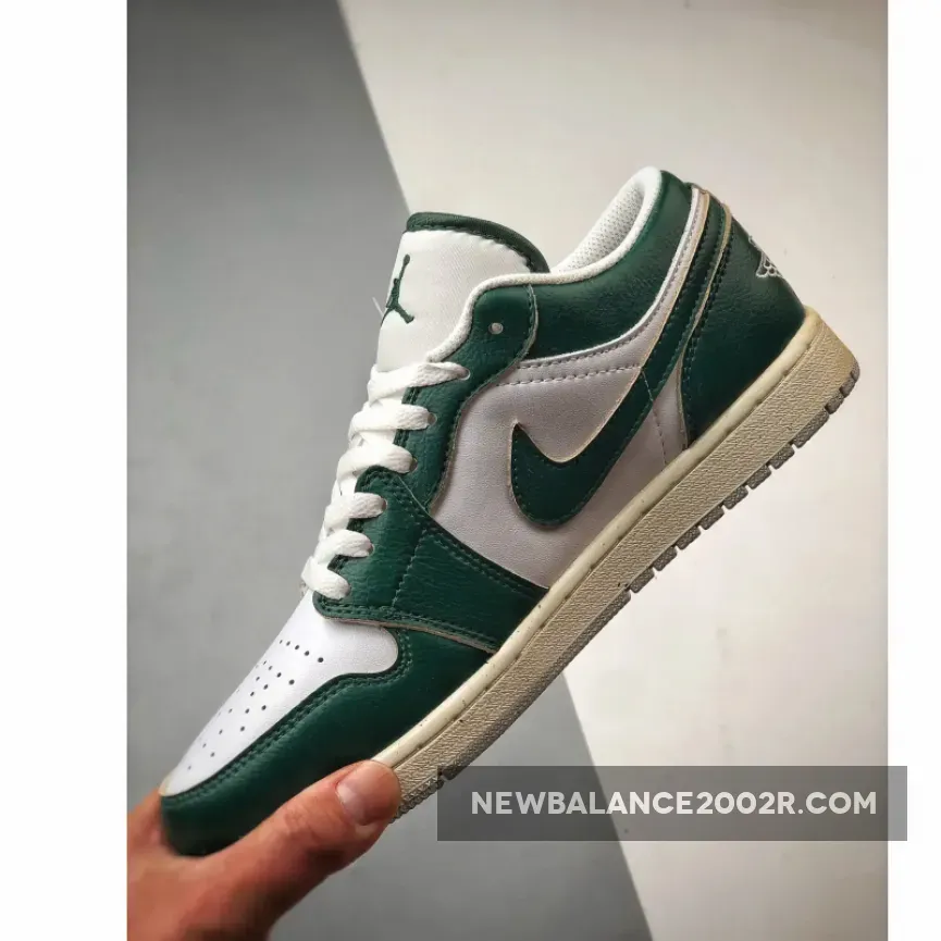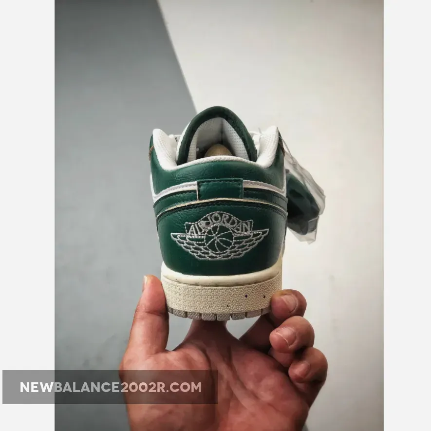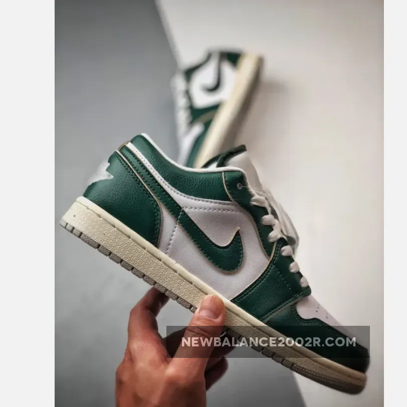The new Air Jordan 1 Low is crafted with a mix of smooth and tumbled leather. It features perforations on the toe box for breathability, along with mesh tongues and inner lining. The shoe sports a White base with Oxidized Green Swoosh logos, overlays, and Jumpman branding on the tongue. Accents in the same Oxidized Green appear in various areas. A speckled Sail midsole and Neutral Grey rubber outsole complete the design.