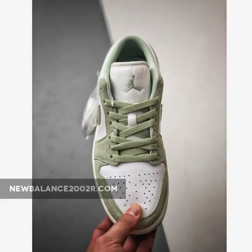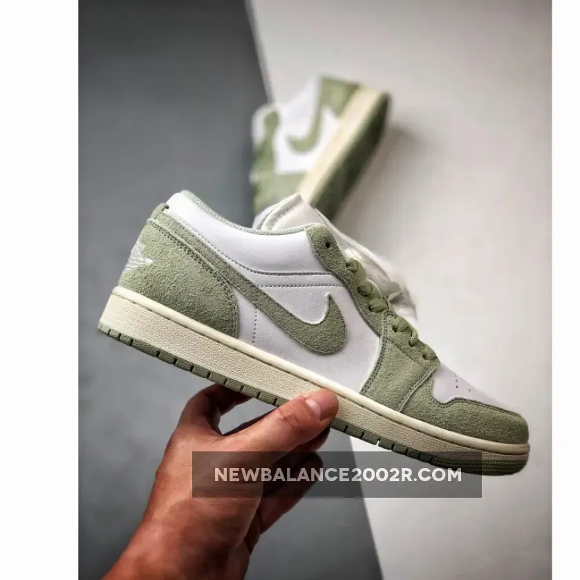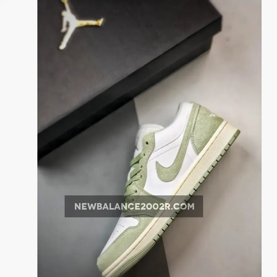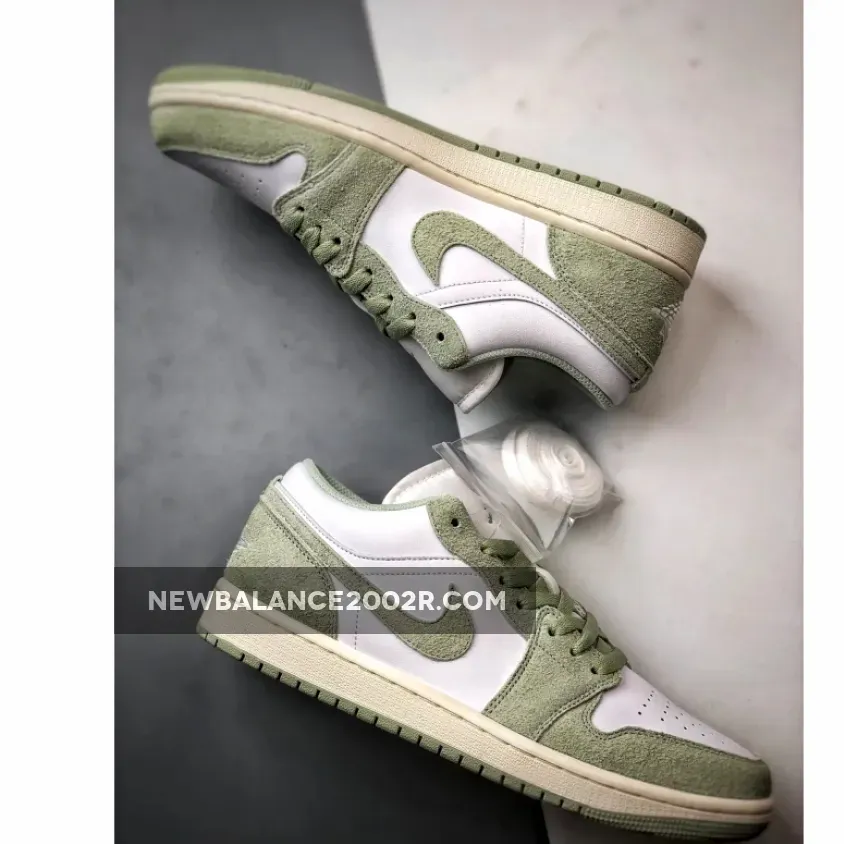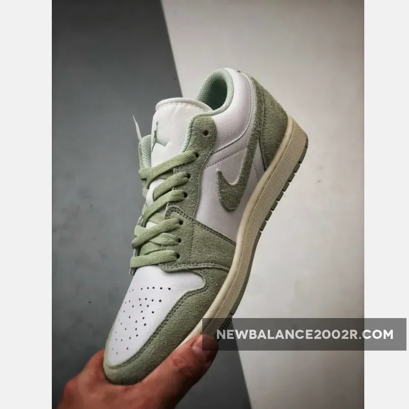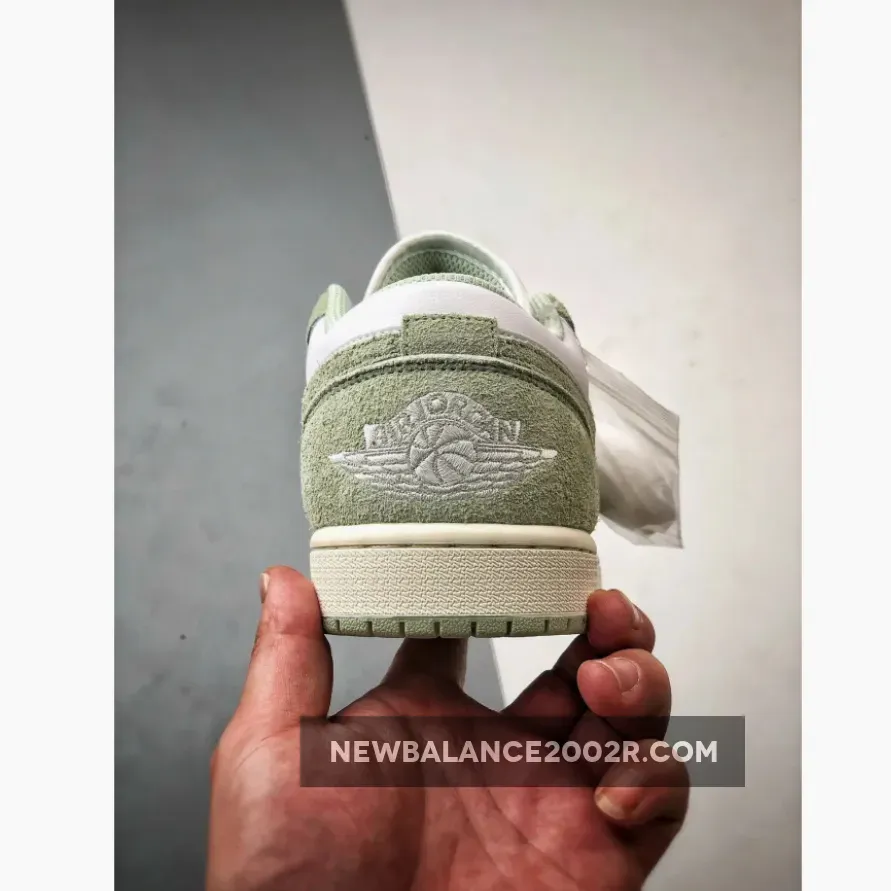 This particular iteration of the Air Jordan 1 Low is characterized by its clean and classic construction. The base of the sneaker is composed of smooth white leather, providing a crisp and versatile canvas that allows the shoe’s standout feature to pop. The titular green suede overlays are the highlight of this design. This lush, hairy light green suede covers every overlay from the heel to the toe, offering a textural contrast that is both visually striking and tactilely pleasing.