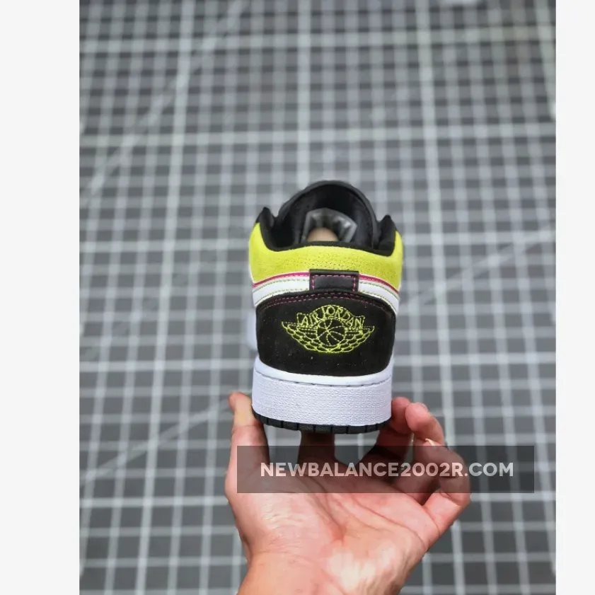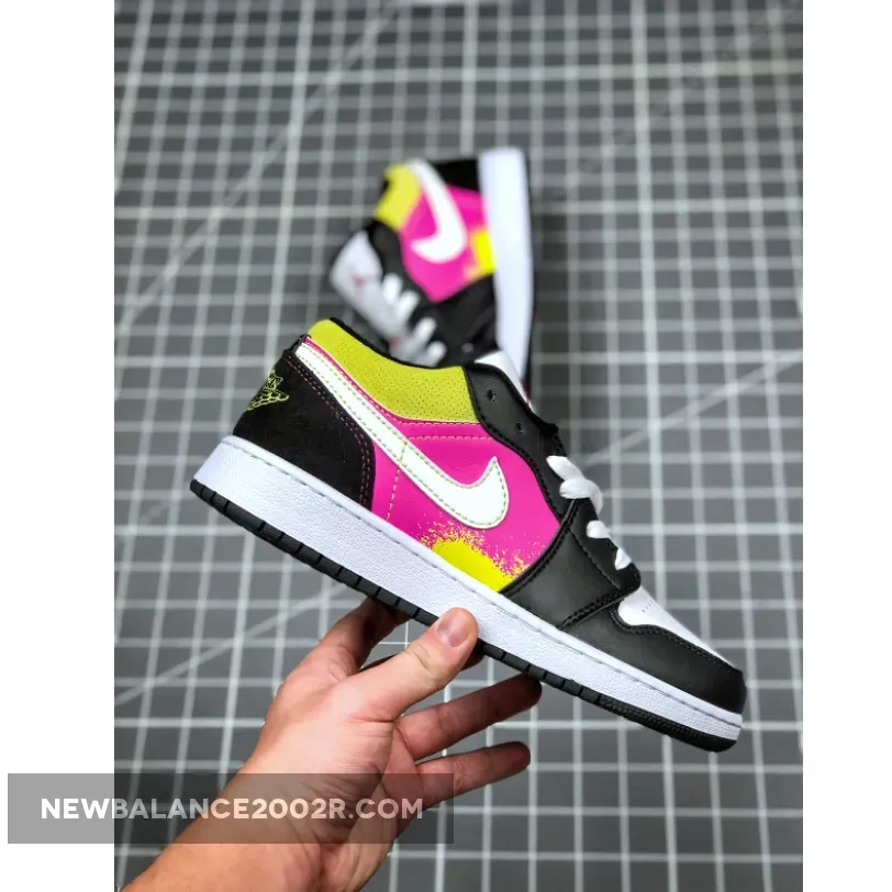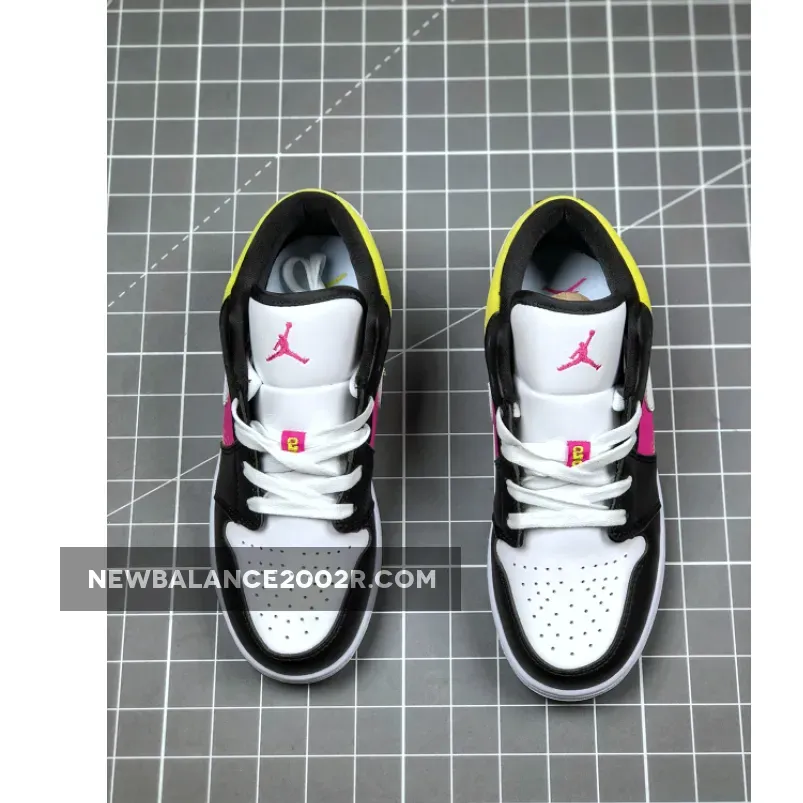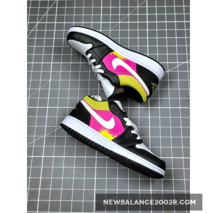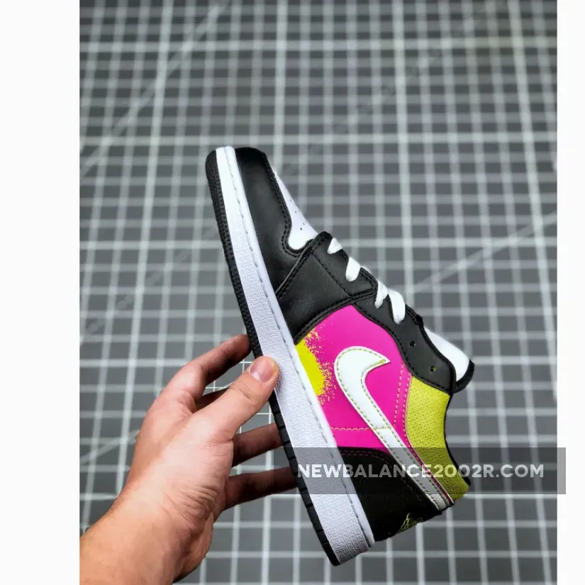 the latest pair of Air Jordan 1 Lows constructs of a relatively ordinary base and accents extremely quietly with spray paint splatter. Seen only across the lowermost side profile, the pair blocks much of the neon yellow treatment with glossy black overlays, details that extend frontwards across the toe cap and back along both the eye stay and heel wrap. Pink hits then switch up the white base coat seen at the vamp and tongue, wrapping around with bright swooshes atop and perforated yellow suedes just adjacent.