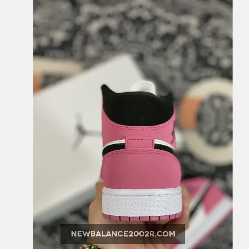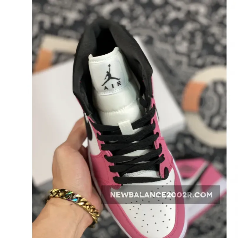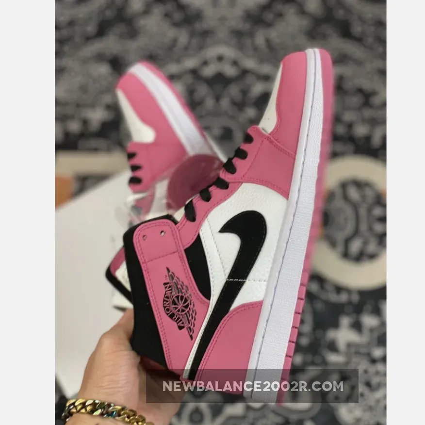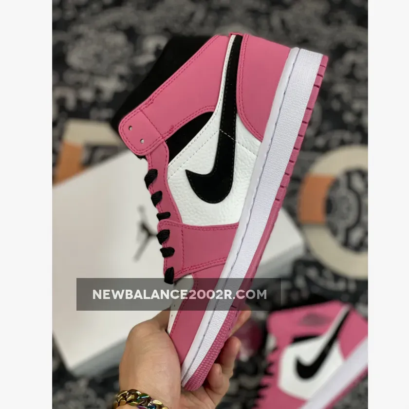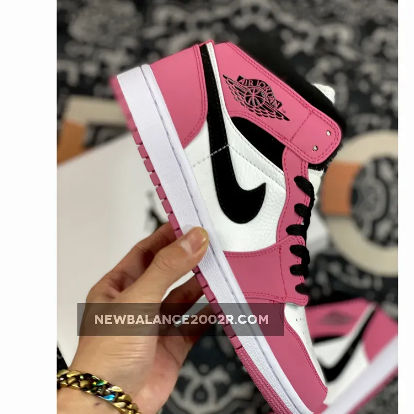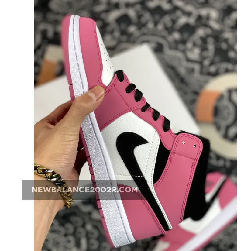 The Air Jordan 1 Mid Light Mulberry features a white grained leather base. A fushia pink nubuck overlay covers the entire upper. Branding such as the Swoosh and Wings logos are finished in black and match perfectly with the collar and laces. A White midsole and Purple outsole completes the design.