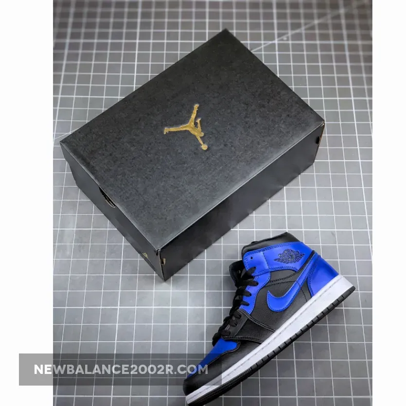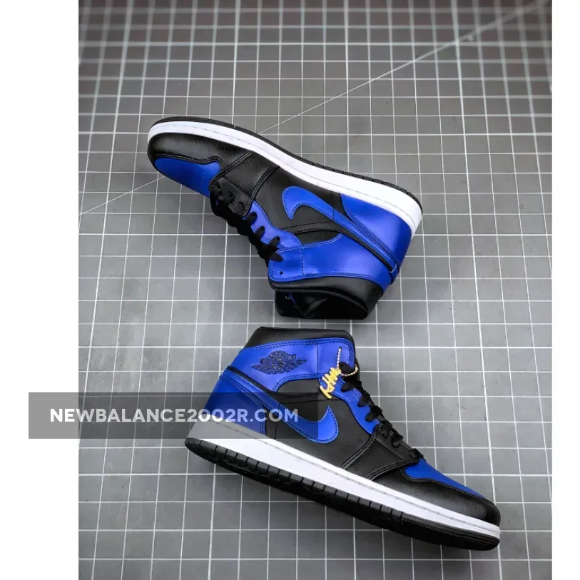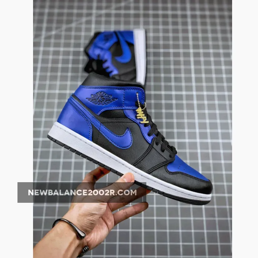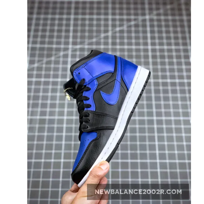 Firstly, this mid-top Air Jordan 1 features a Black, Hyper Royal, and White color combination. Constructed in all leather, Black tumbled leather wraps the toe, hits the panels and ankle. Adding pop is the use of Hyper Royal on the Swoosh, ankle overlay, heel, tongue branding, and toe. In addition, Black is also seen on the tongue, laces, and rubber outsole. Lastly, we have a White midsole.