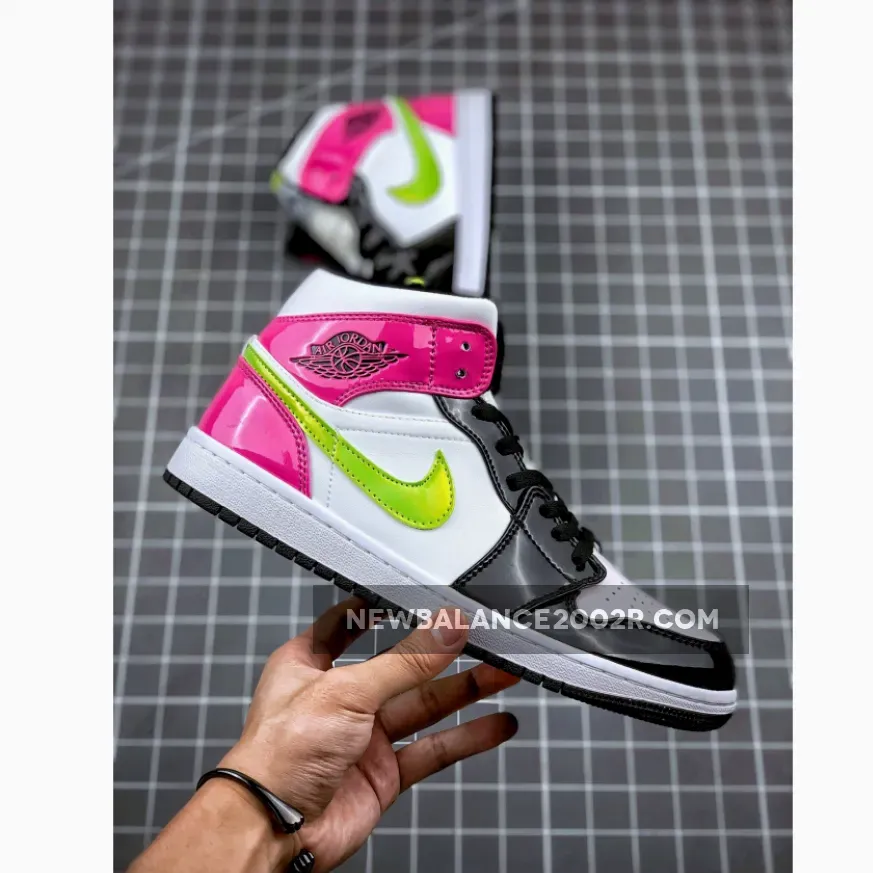 Loving the sleek design of the Air Jordan 1 Mid Black Pink Patent Leather! ? The combo of classic vibes & vibrant colors just works. ? The patent leather elevates the whole experience, & I’m obsessed with the green-yellow Swoosh! ? #AJ1Mid #PatentLeather #SneakerGoals