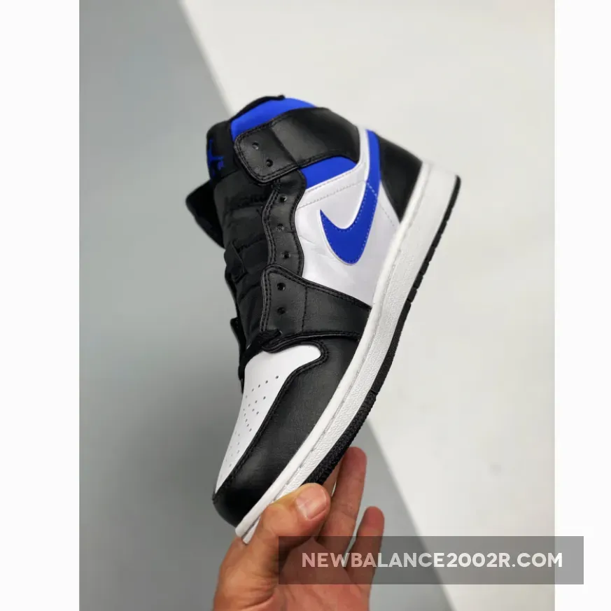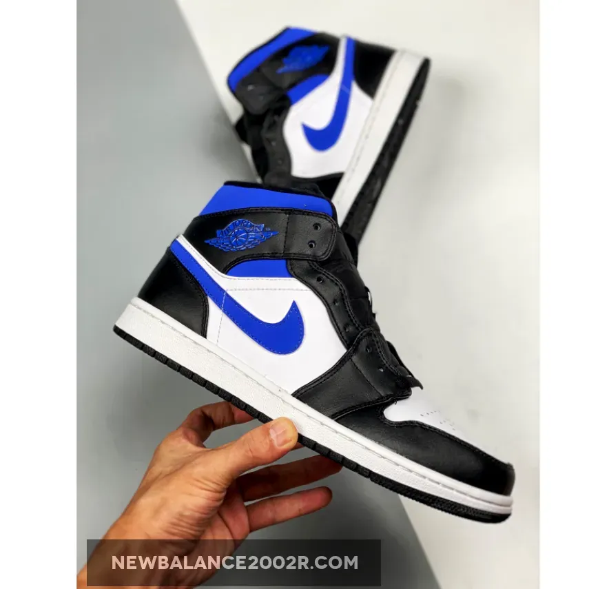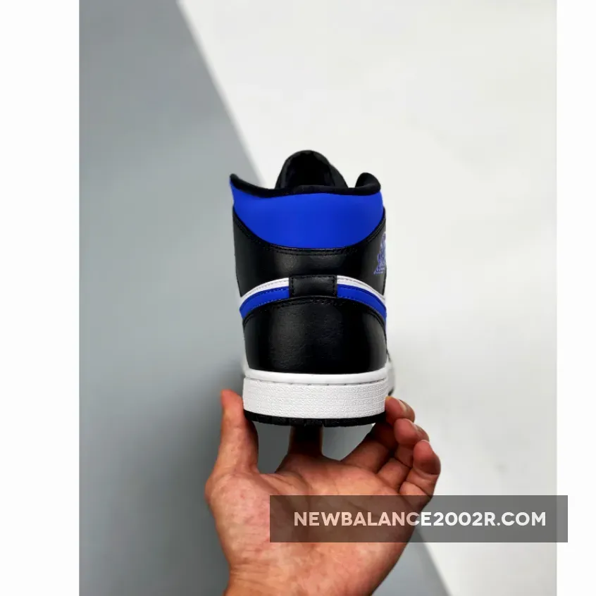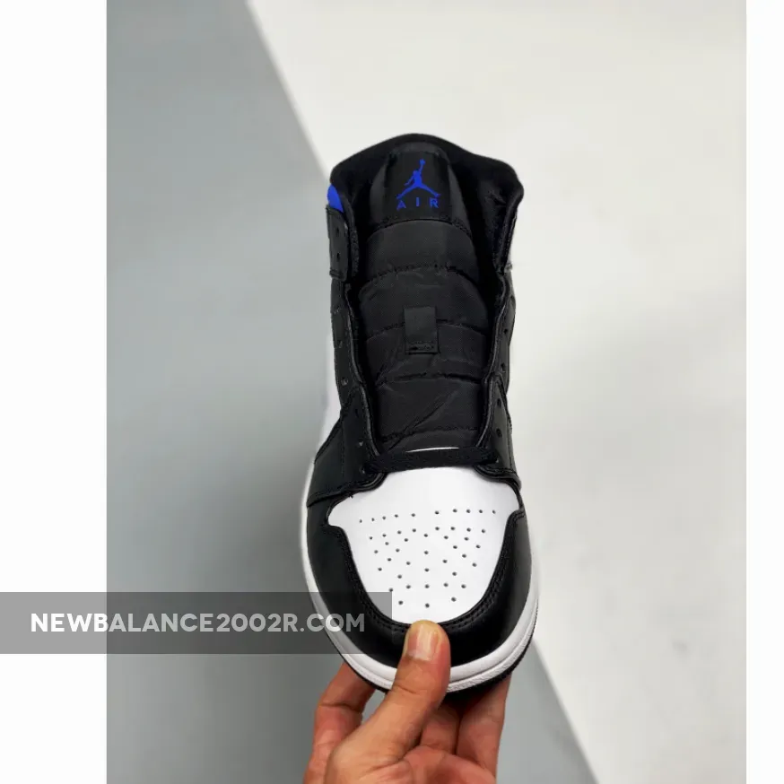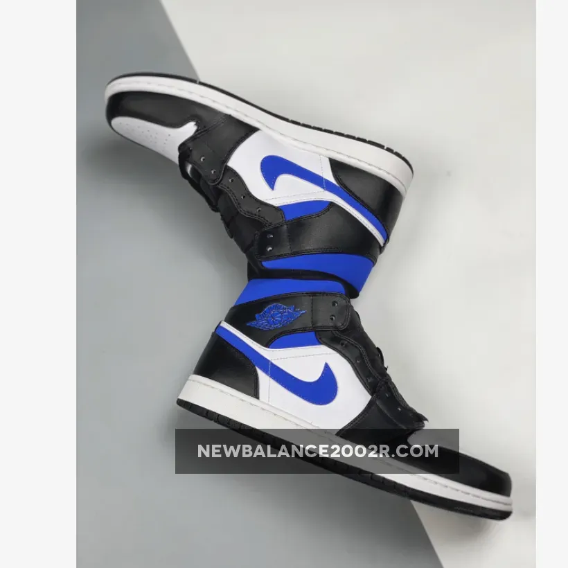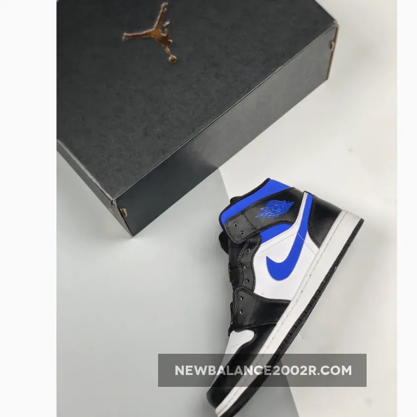 Dressed in a White, Black, and Racer Blue color scheme. This offering fo the mid-top Air Jordan 1 features a White leather base with Black overlays, laces, tongues, liner and rubber outsole. Highlighting the shoe are Royal Blue contrasting accents riding atop a White midsole.