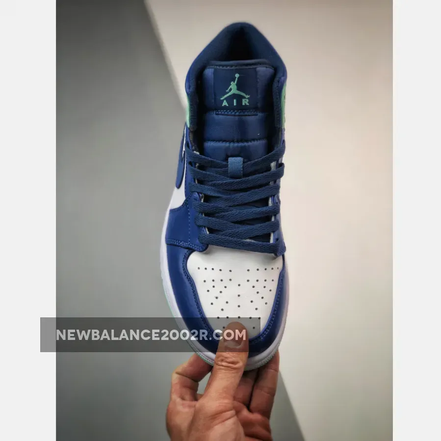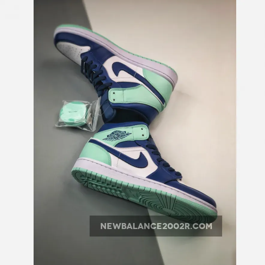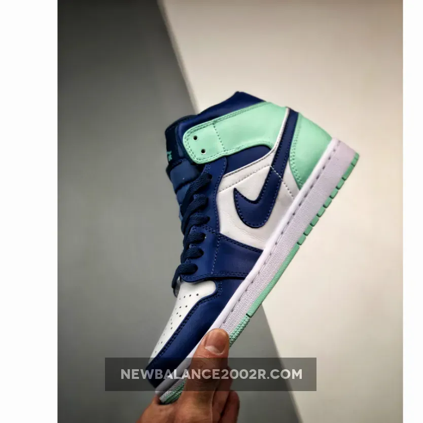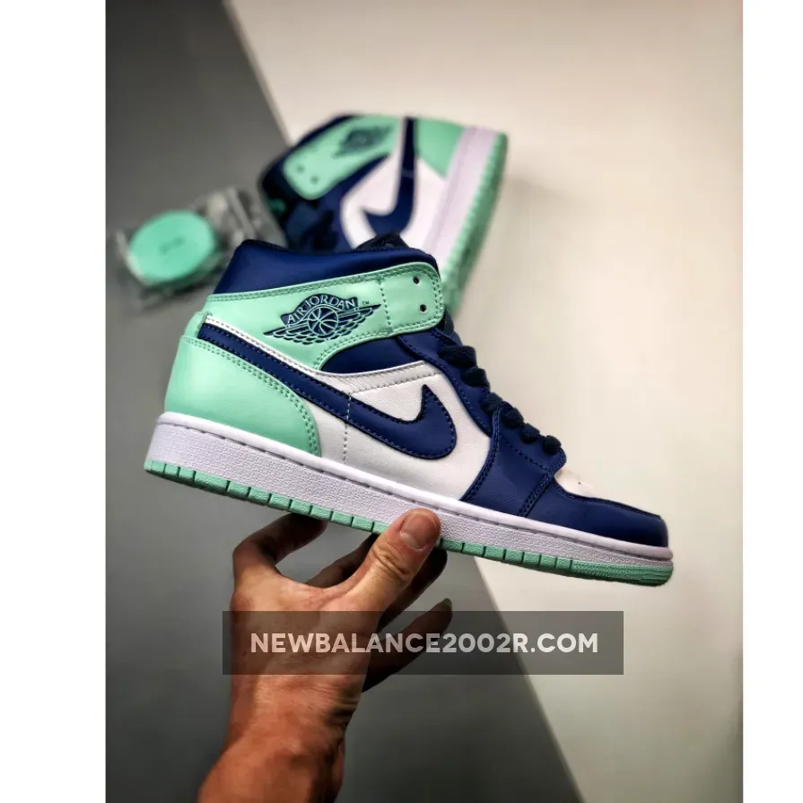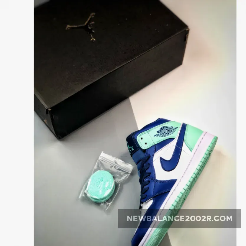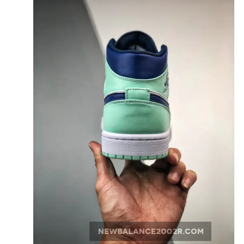 This offering of the Air Jordan 1 Mid features White leather base with Navy Blue overlays, Swooshes, Wings logo, collar, tongues, laces, and lining. Other details includes Mint Green overlays in the rear and rubber outsole atop a White midsole completes the design.
