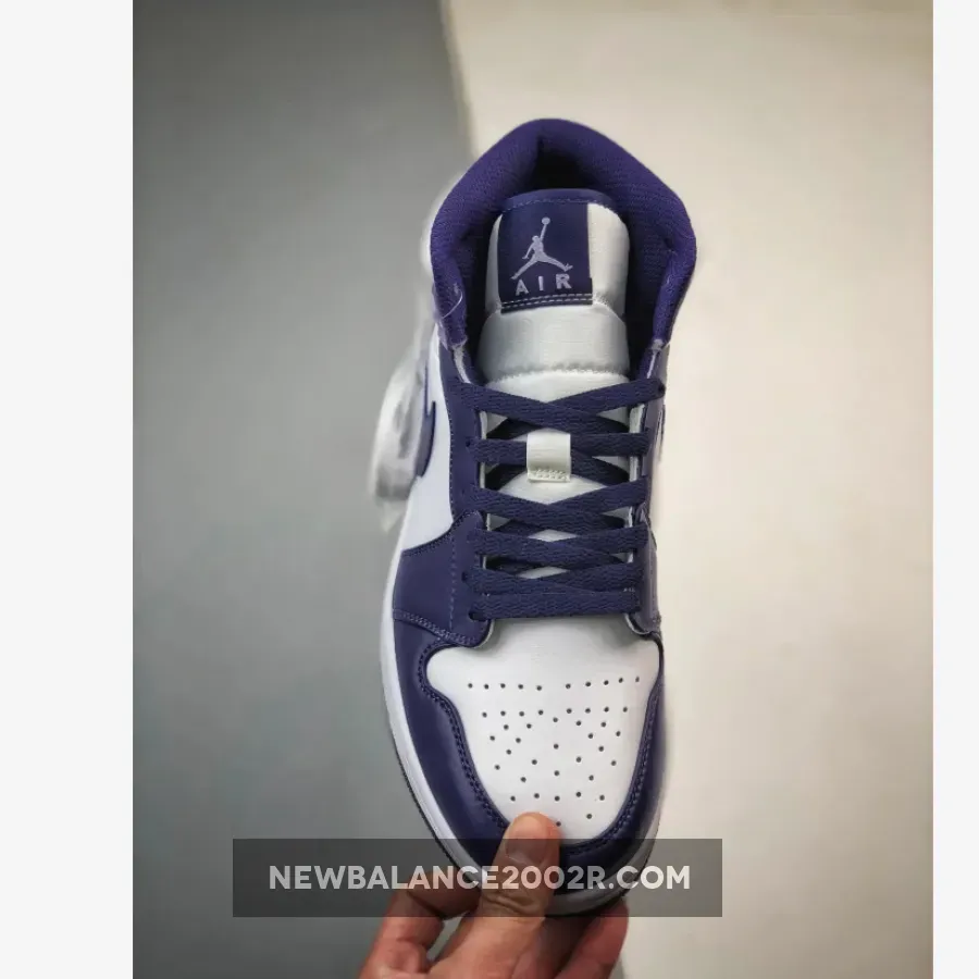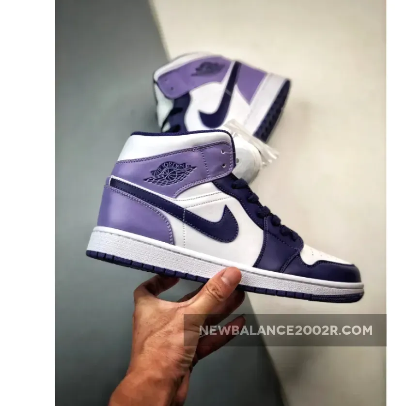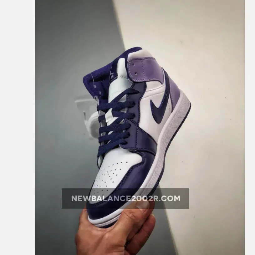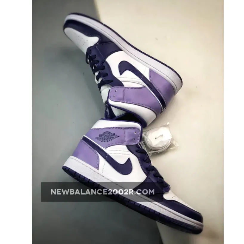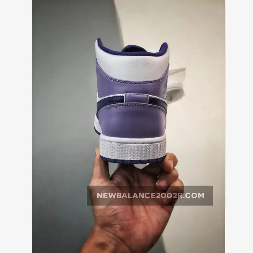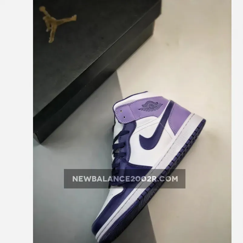 This offering of the Air Jordan 1 Mid features a full leather build on the upper with White serving as the base hue and two different shades of purple seen on the overlays.