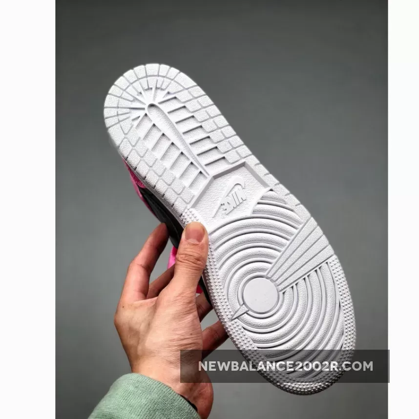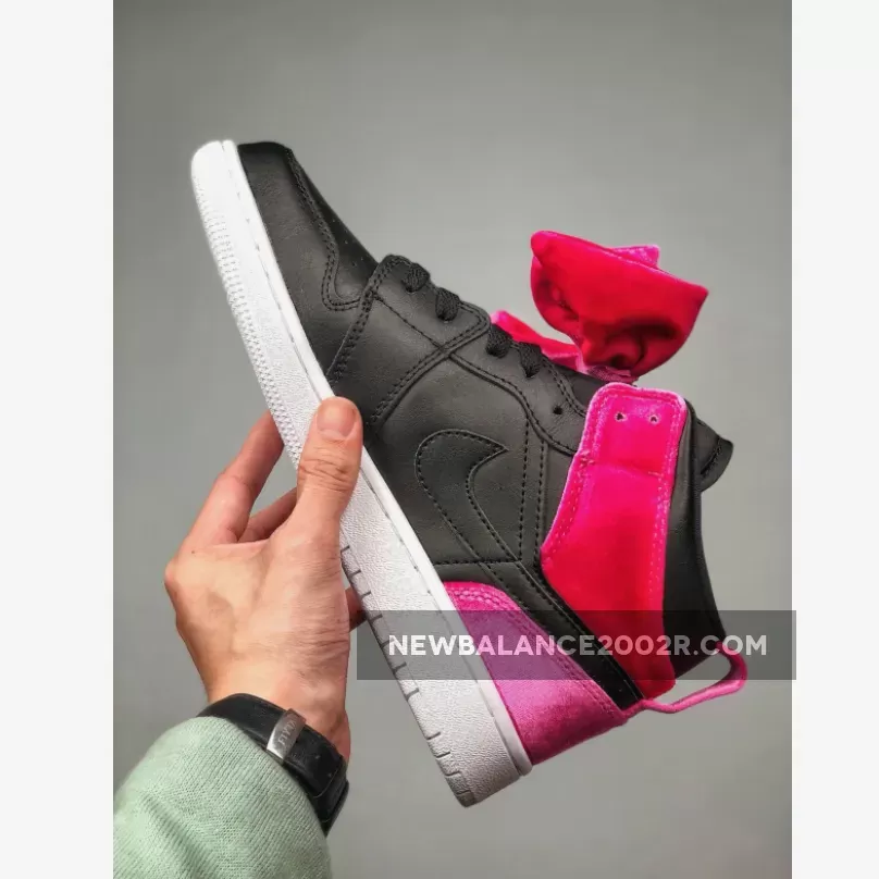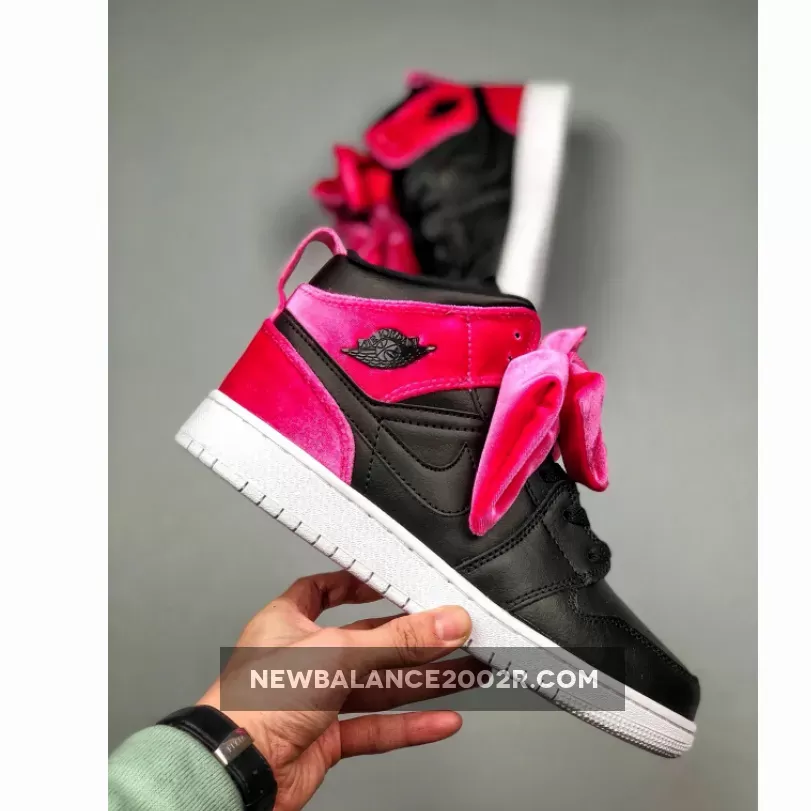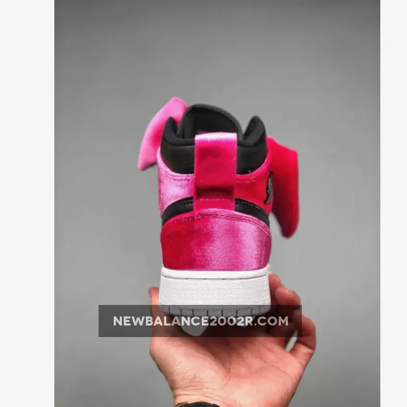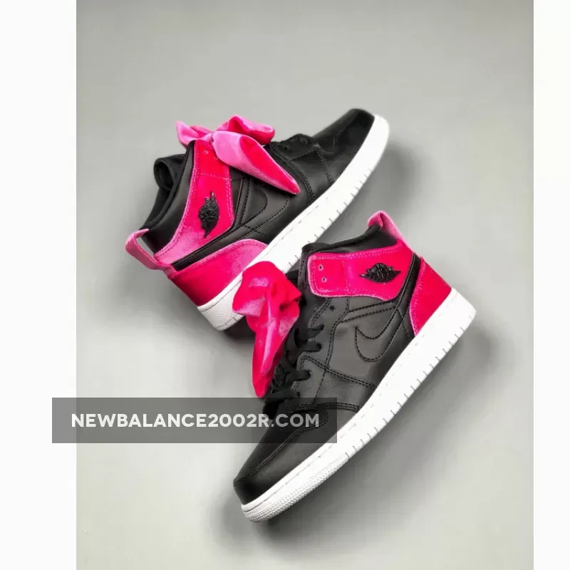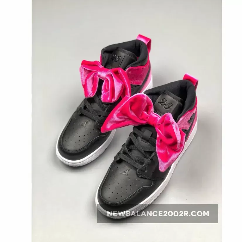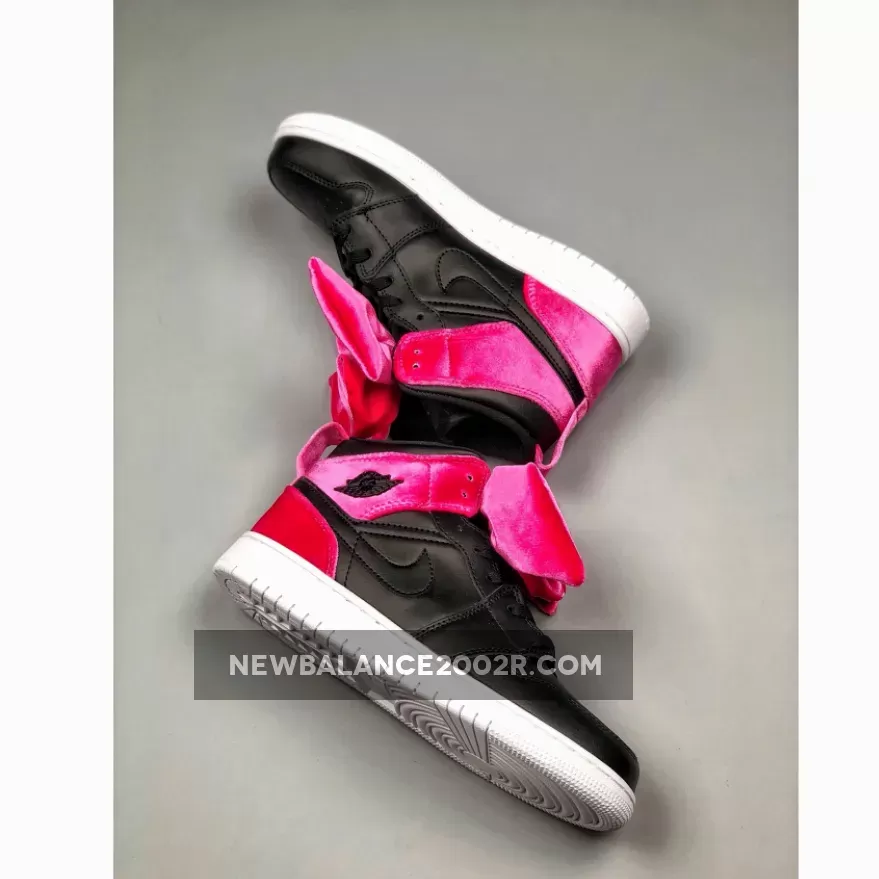 Dressed in a Black and Noble Red color scheme. This mid-top Air Jordan 1 features a Black leather upper paired with velvet-like Pink overlays rapping around the heel. Highlighting the shoe is its giant bow tie clipped onto the laces.
