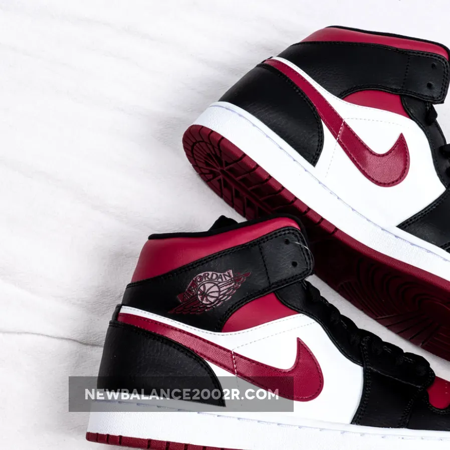 This offering of the mid-top Air Jordan 1 features White leather on the sides and Black leather overlays. Highlighting the shoe are Red hues on the toe, Swoosh logos, ankle collar, Wings logo, and rubber outsole.