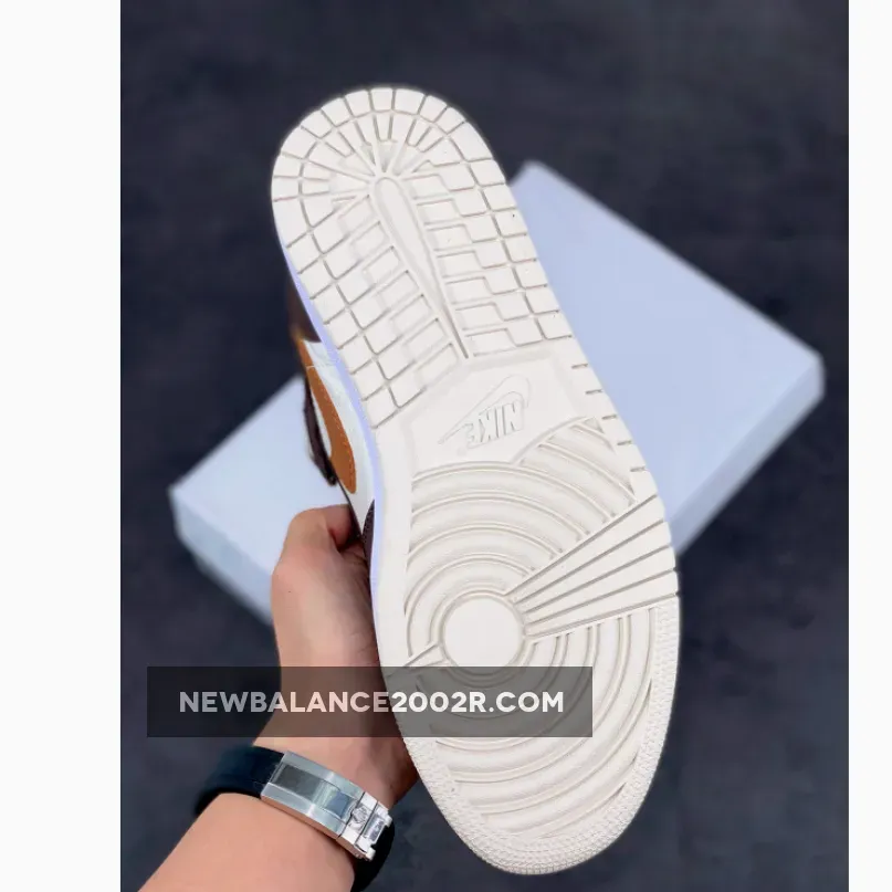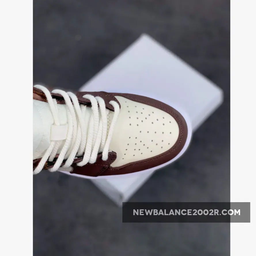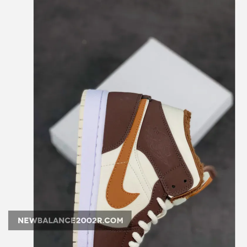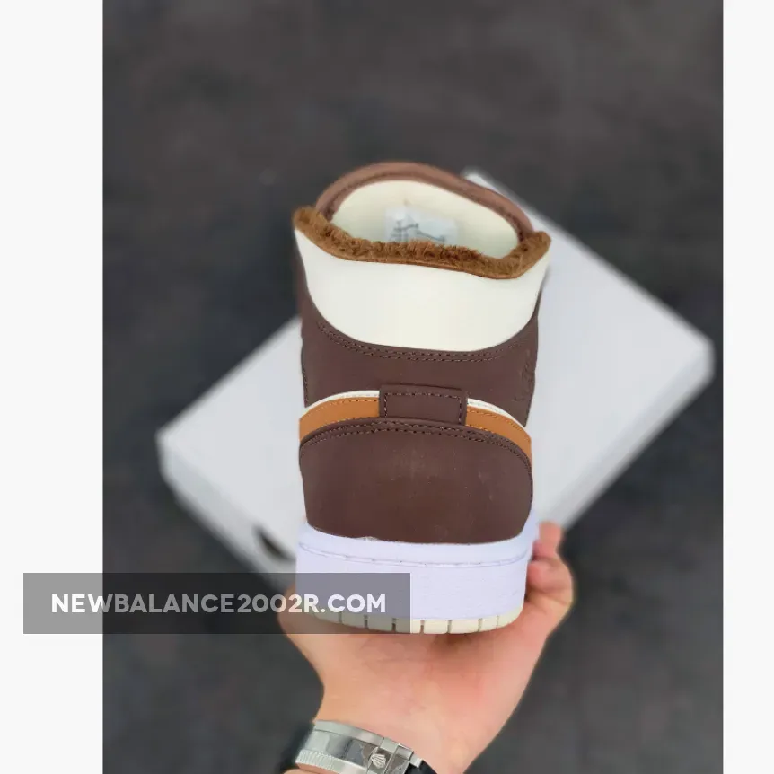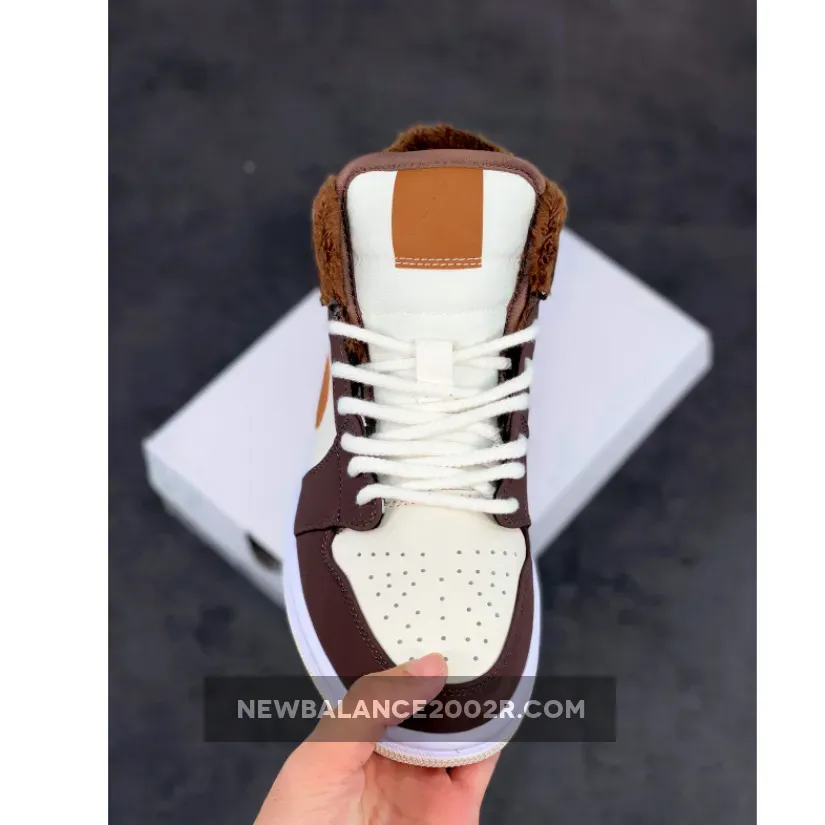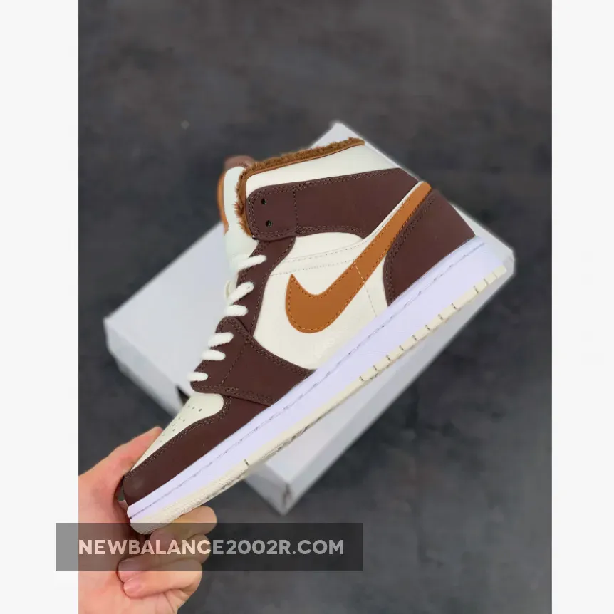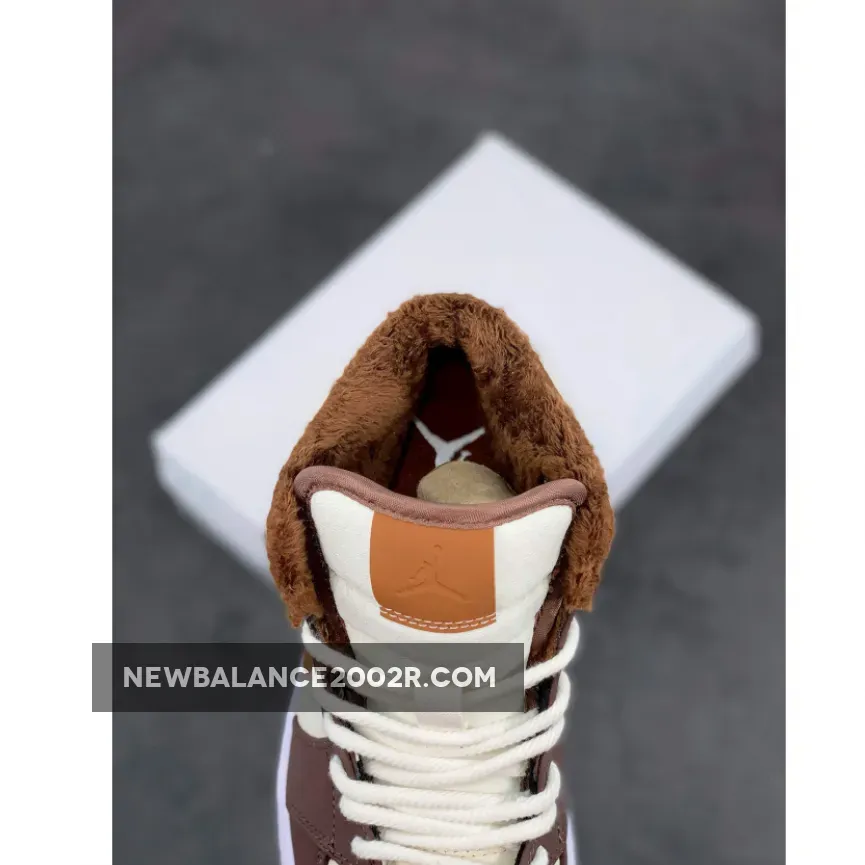 This offering of the mid-top Air Jordan 1 features Cream tumbled leather upper paired with Dark Chocolate nubuck overlays, Brown leather Swooshes and tongue tags. Additional details includes fur liners, ribbed rope laces atop a White midsole and Cream-colored rubber outsole.