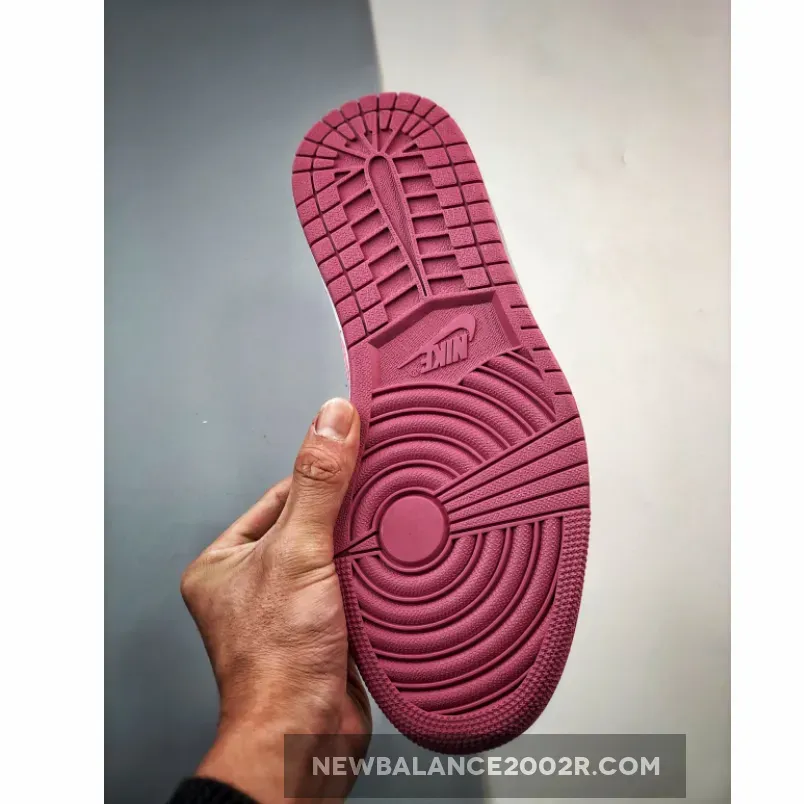 The shoe features a white leather upper with perforated detailing on the toe box in classic Air Jordan 1 fashion. It also has pink overlays around the midfoot, lace eyelets and around the ankle and heel with stitching all around the upper and midsole synonymous with most shoes on the silhouette. The Swoosh appears in an even darker shade of pink, providing a cool contrasting effect that also extends to the outsole. Branding details on the shoe include the Air Jordan Wings logo on the outer side of ankle and the Jumpman logo with Air branding on the tongue.