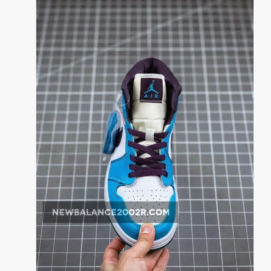 Dressed in a Blue Lagoon, Grand Purple and White color scheme. This Air Jordan 1 features White leather upper with Teal overlays and Purple contrasting accents. A clean White midsole and a two-tone rubber outsole completes the Hornets theme.