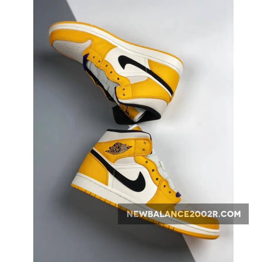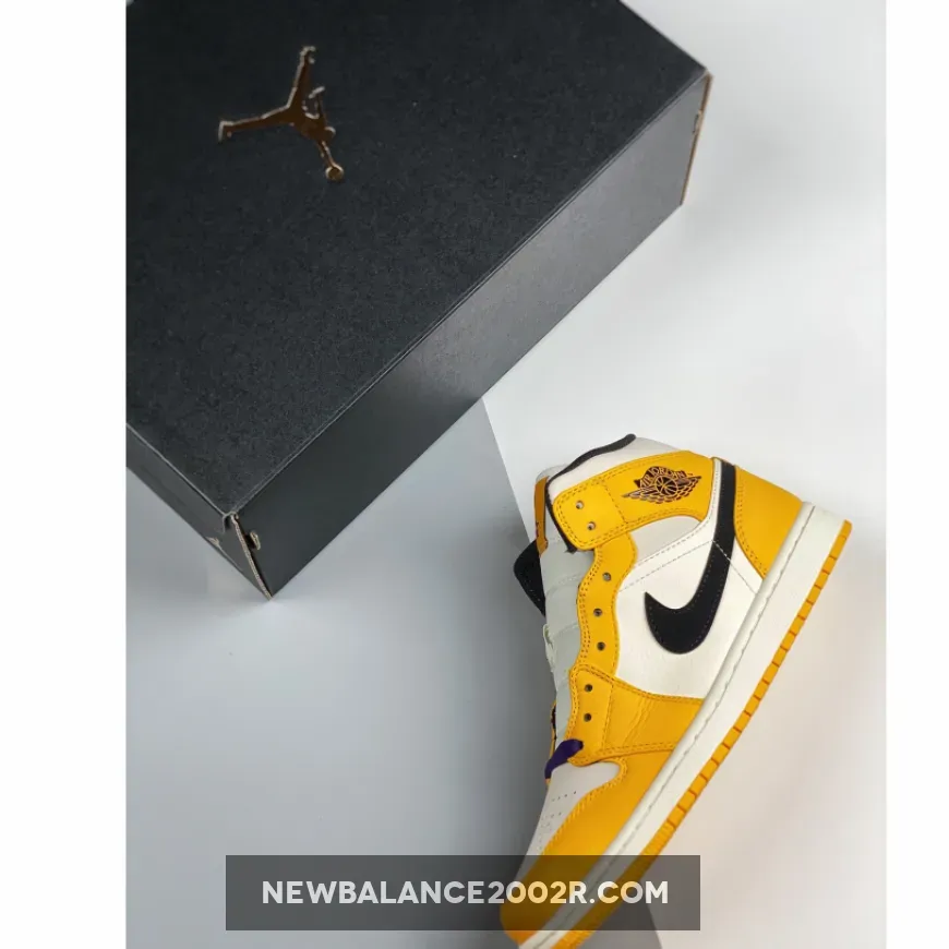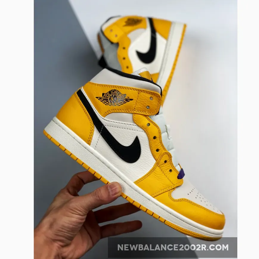 This mid-top iteration of the Air Jordan 1 features a Sail leather underlay with Yellow tumbled leather overlays. Additional details includes a Black Swoosh logo on the sides completed with Purple laces and insoles for that LA Lakers vibe.
