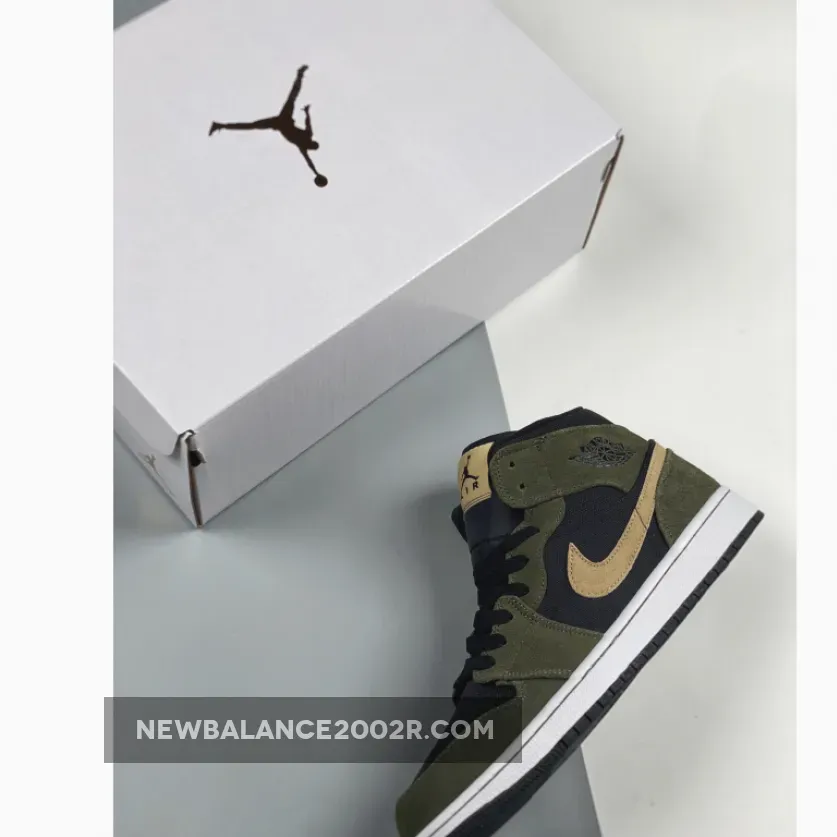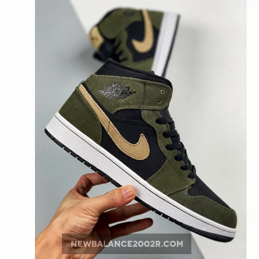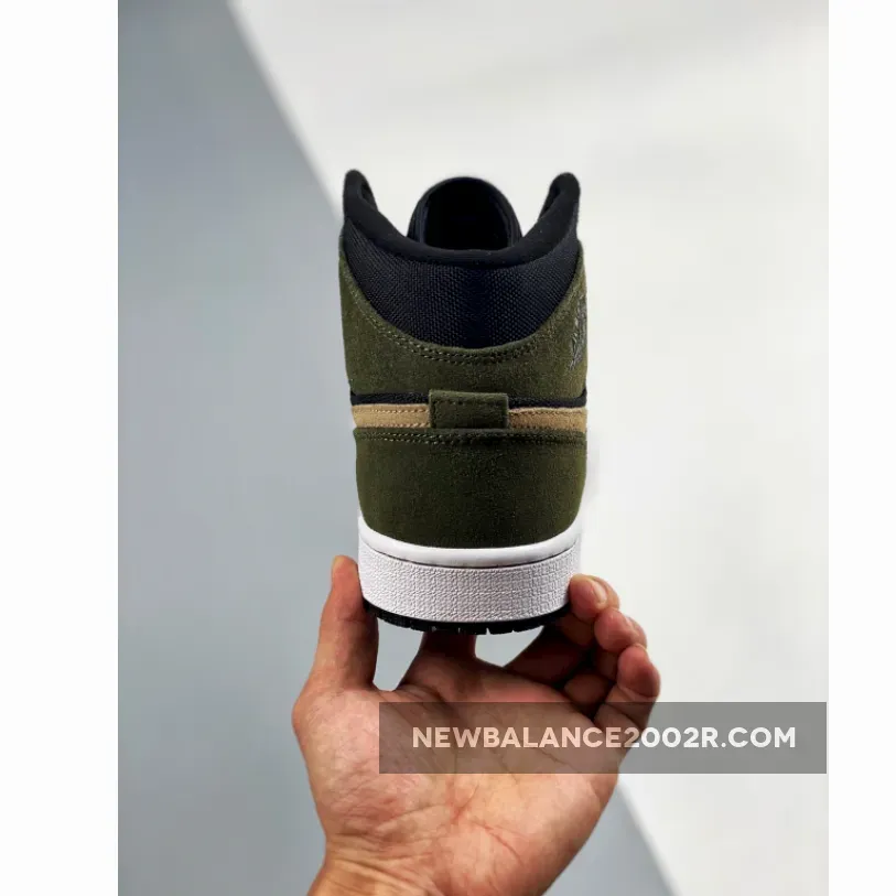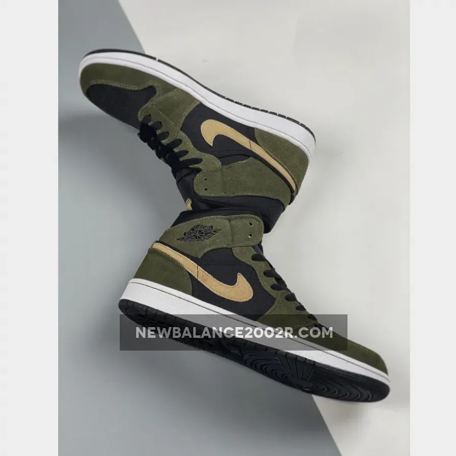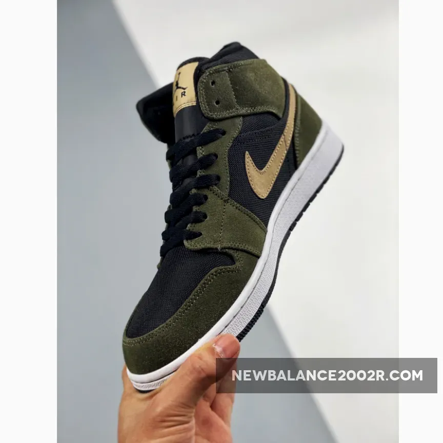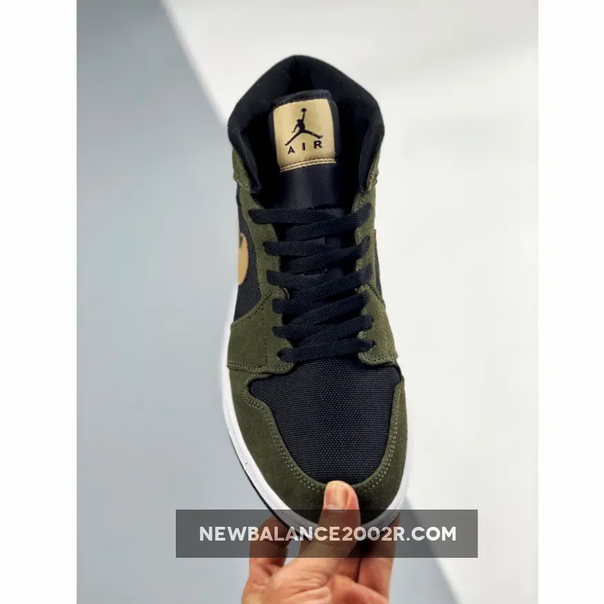 This offering of the mid-top Air Jordan 1 features a Black ballistic mesh upper with Olive suede overlays.