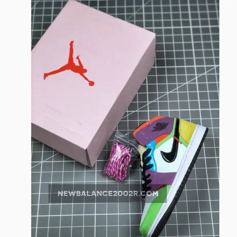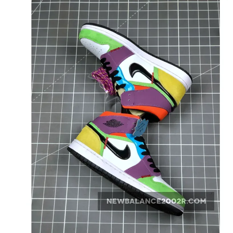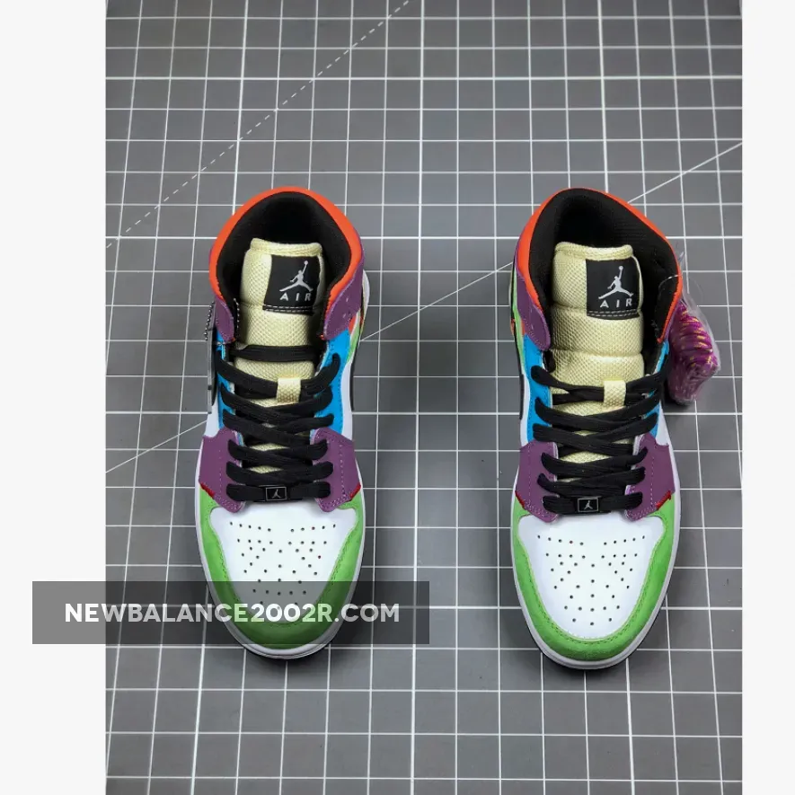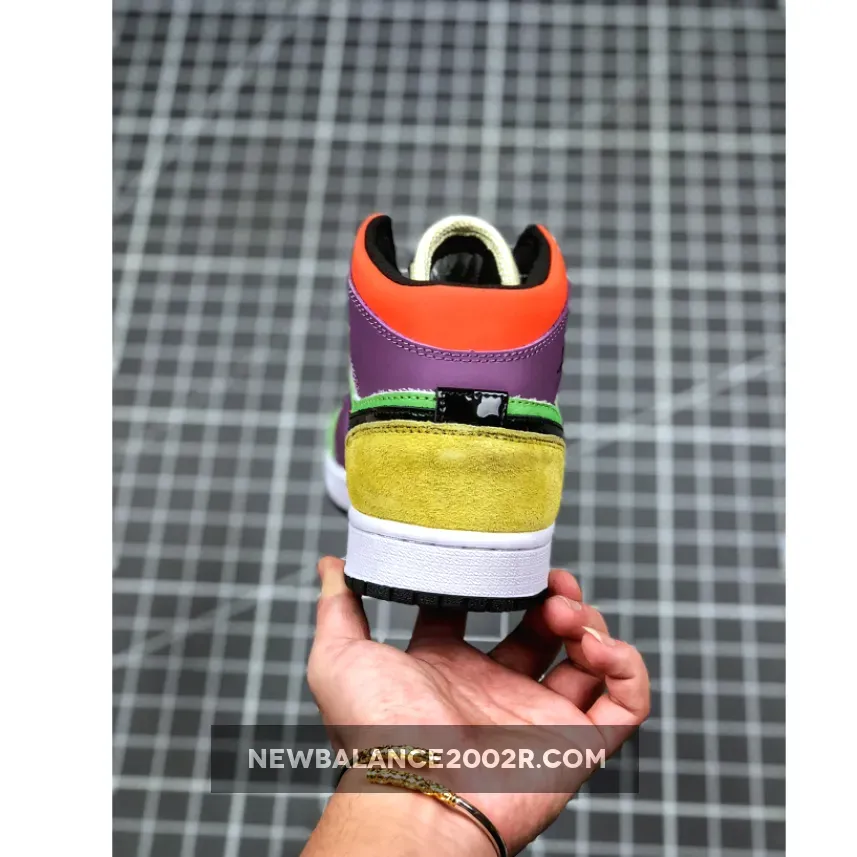 This upcoming Air Jordan 1 Mid comes constructed in mix of patent leather, smooth leather, mesh, and suede. It features a mix of Volt-Green, White, Purple, Blue, vibrant Orange, Yellow, and Black. Other details also includes exposed stitching.