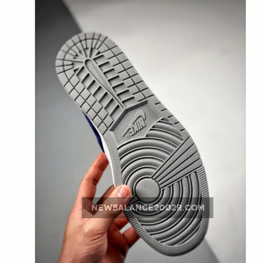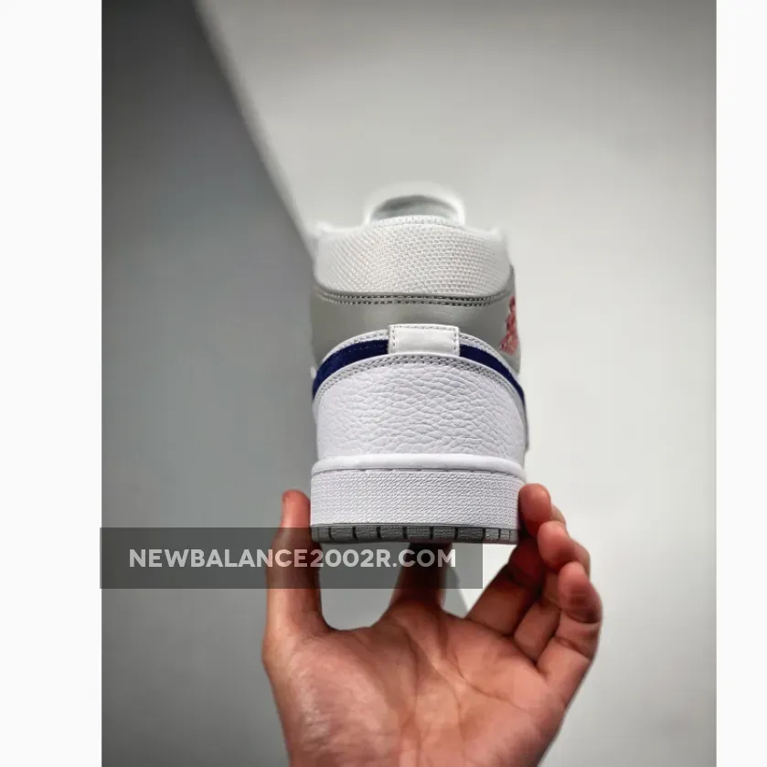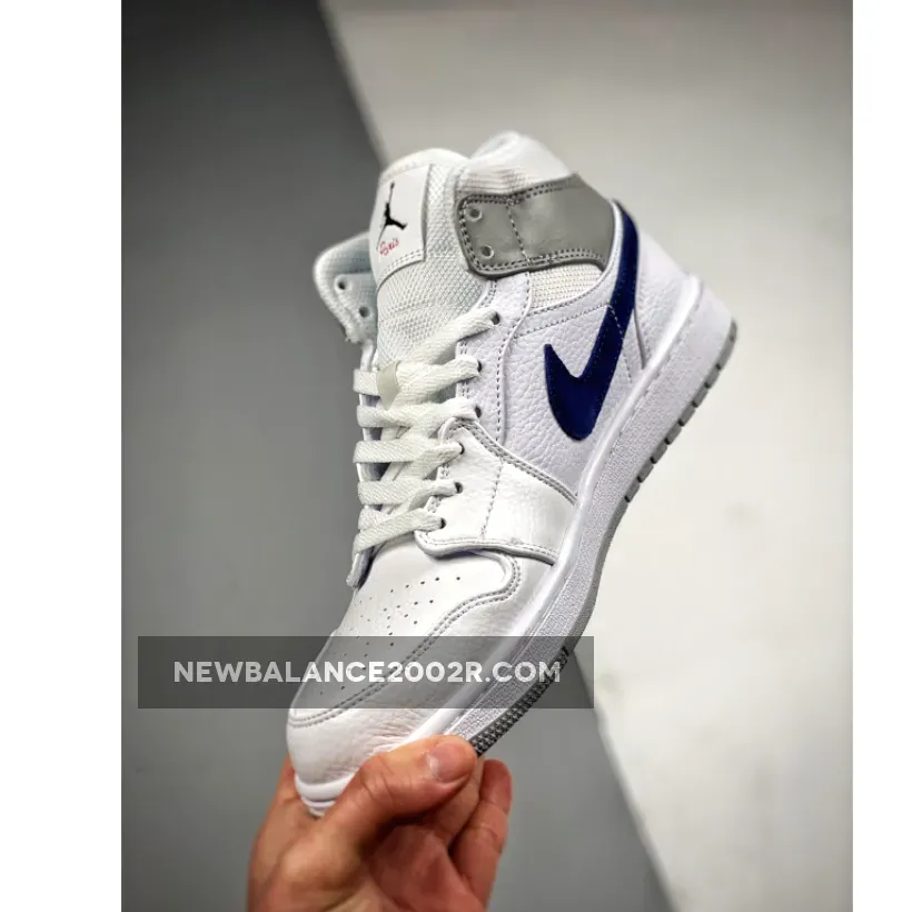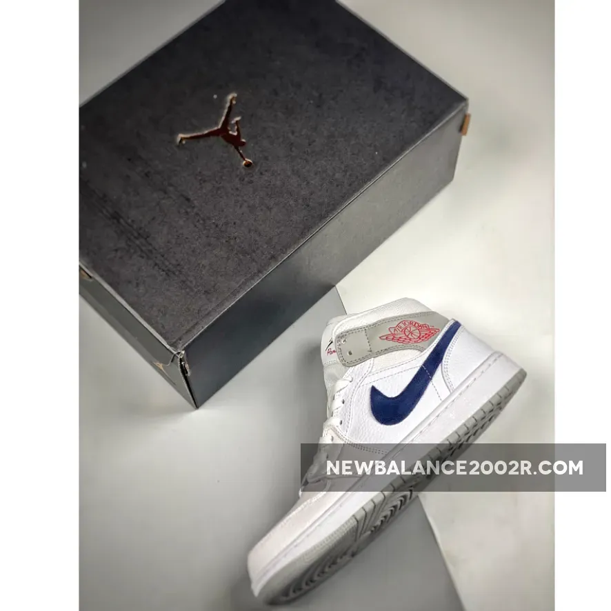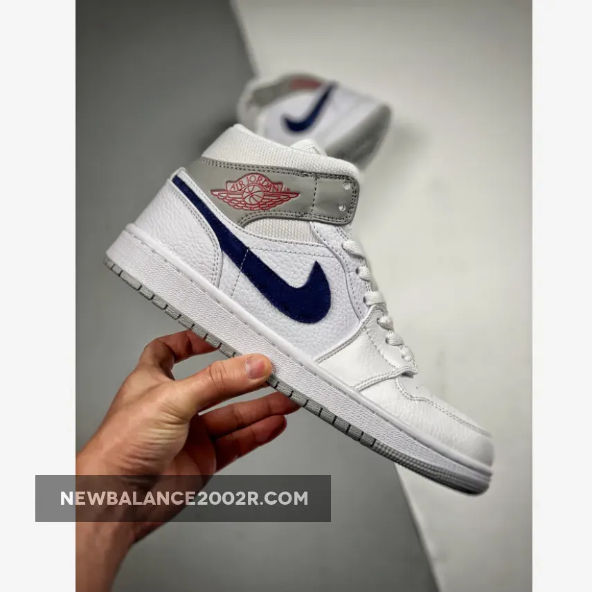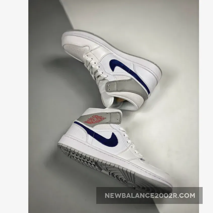 The sneaker uses white tumbled leather on the base and overlays sans the ankle collar and ankle flap with the ankle collar using a white mesh and ankle flap seen in grey nubuck. The Swoosh appears in navy blue suede with the Wings logo debossed on the ankle flap and outlined in red. The Jumpman is seen in navy on the tongue tag and insole with “PARIS” printed underneath in red and a white midsole and grey outsole finish off the sneaker.