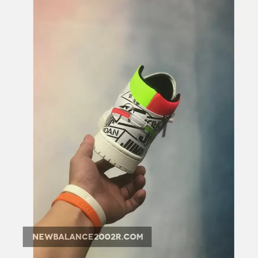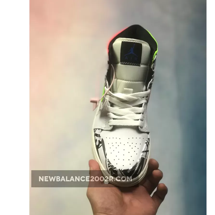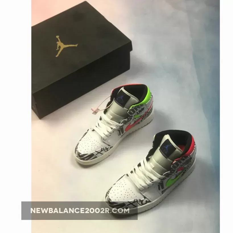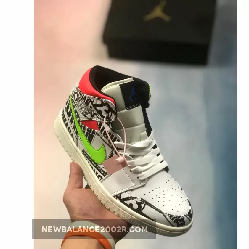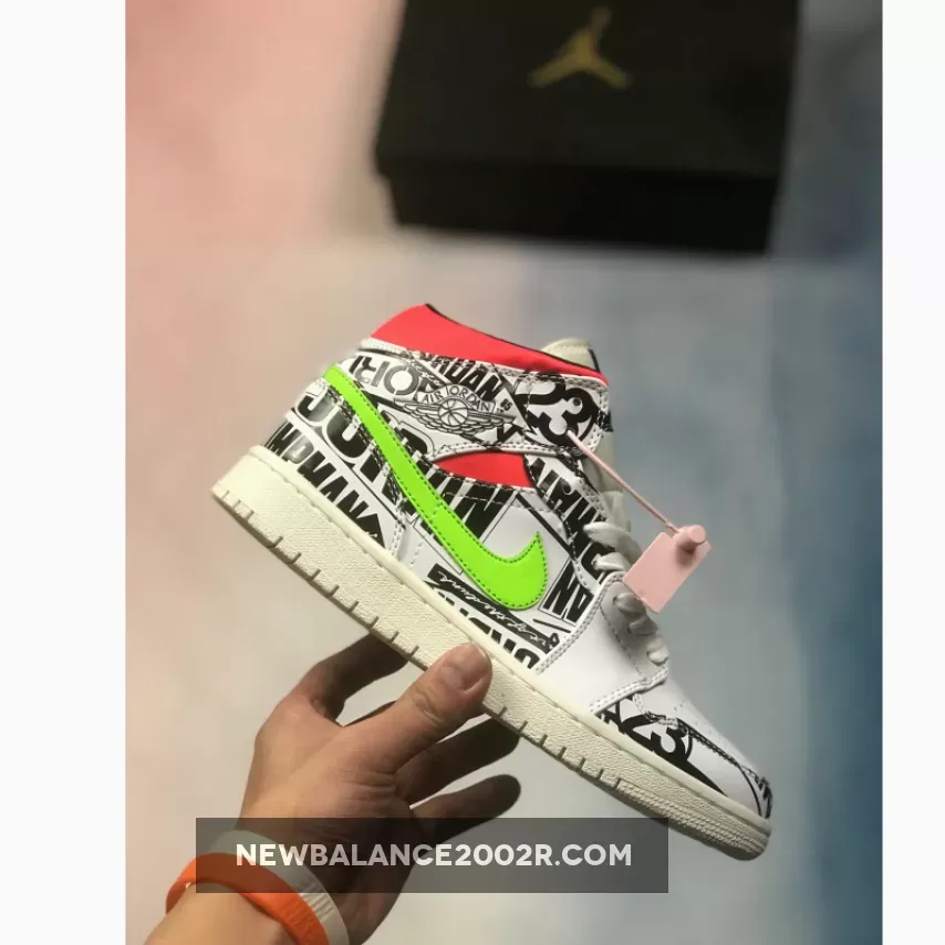 Next up is a brand new printed rendition of the silhouette. This Air Jordan 1 Mid features a White leather upper covered in various of Jordan branding in Black. Adding a bit of contrast are a two-tone Swoosh logo and heel collar, which are done in Lime Green and Crimson Red. A solid White rubber sole completes this unique design.