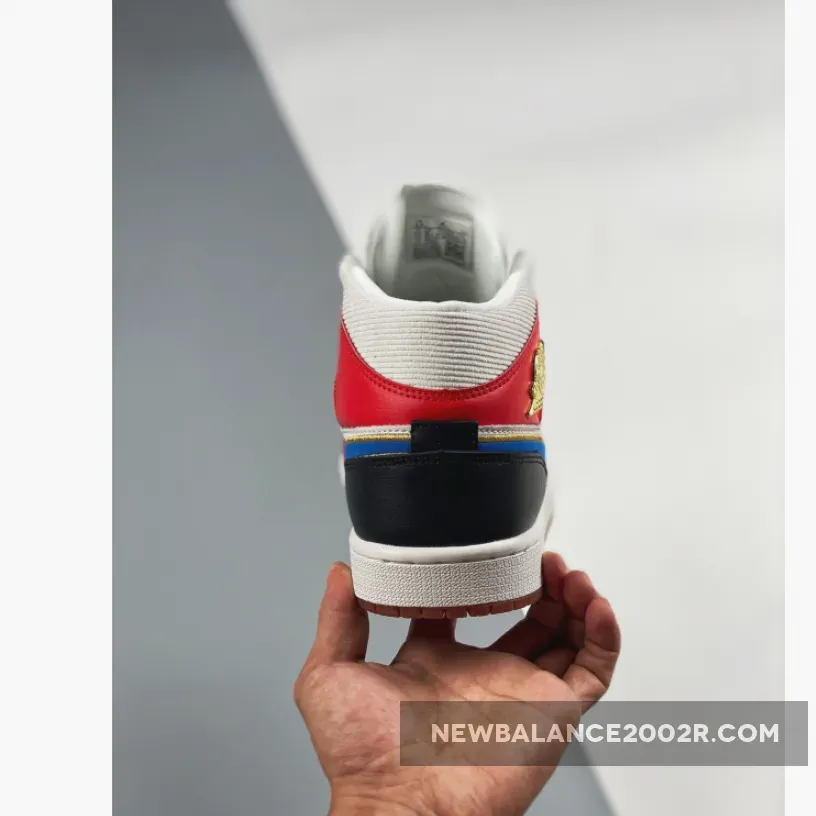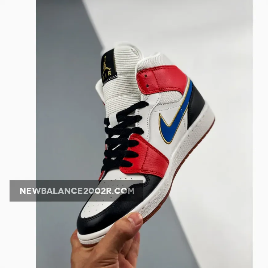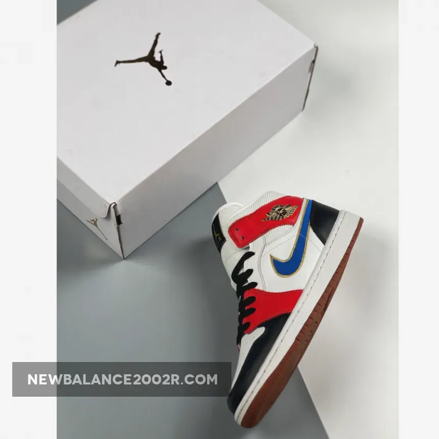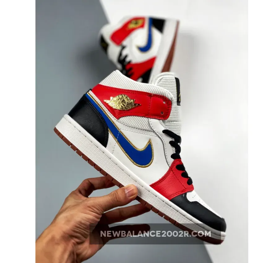 This special version of the Air Jordan 1 Mid features premium leathers, filled out with a corduroy-like collar and tongue. The felted Swoosh is outlined with Metallic Gold thread that matches the tongue label Jumpman and Gold-colored metal Wings logo.