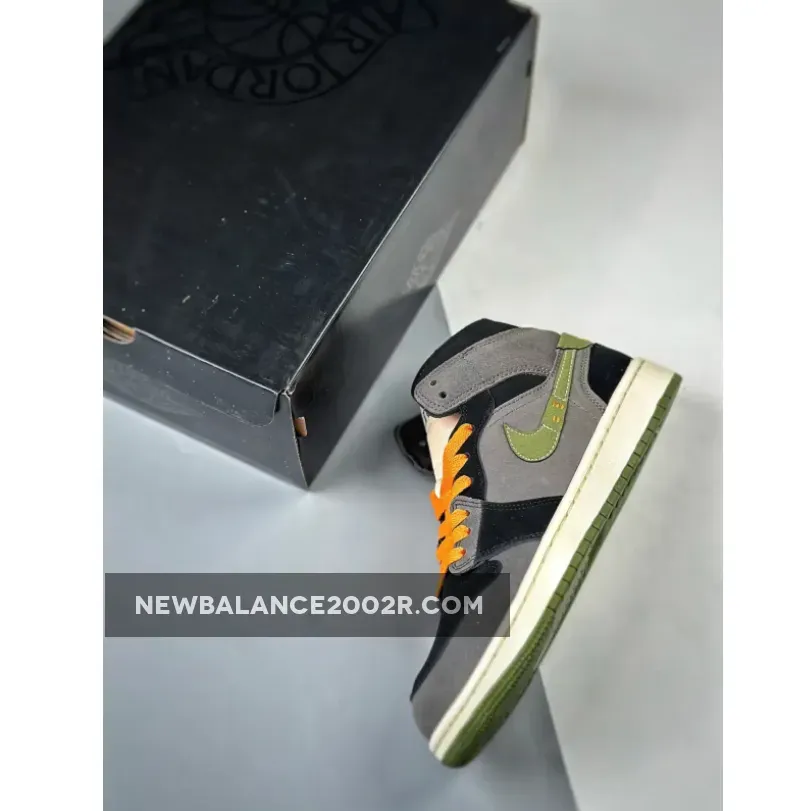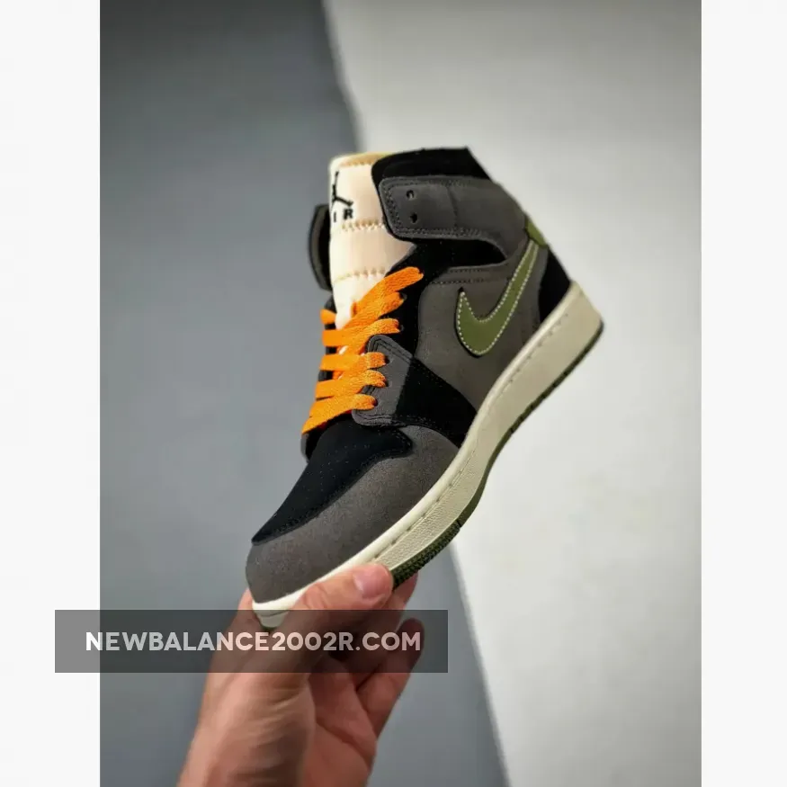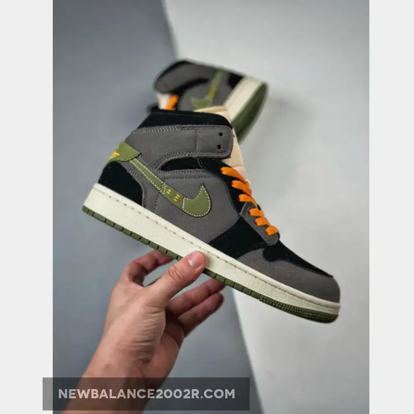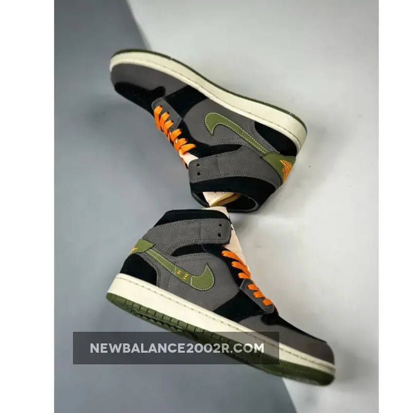 Exploring a pitch-dark composition illuminated by jack-o-lantern hues, the suede and nubuck dominant upper extends jet-black and dark grey panels throughout. Light Olive takes center stage on the leather Swooshes, heels, and rubber outsole, providing a striking contrast. Bright Orange laces and a Wings logo in the rear add an extra pop of color.