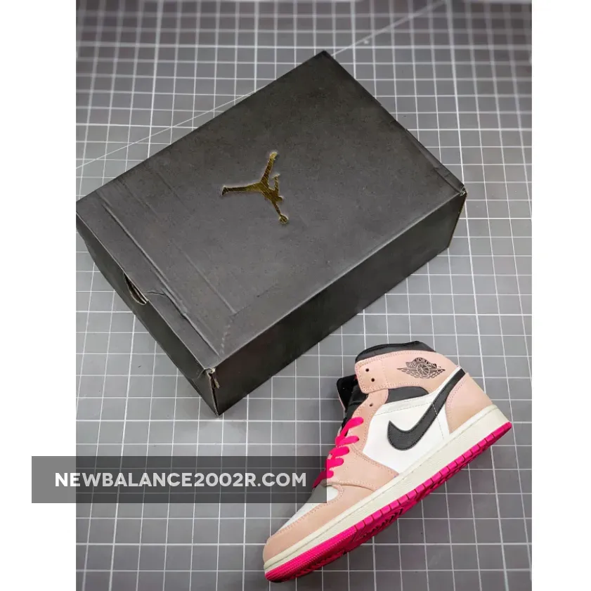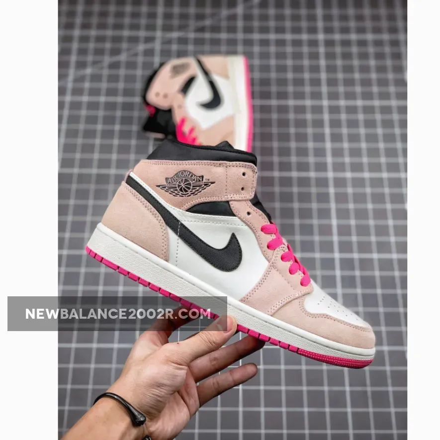 This mid-top Air Jordan 1 features a White leather upper with Pink suede overlays and Black nylon on the Swoosh logo and collar. A darker tone of Pink is used on the laces and outsole to complete the spring aesthetic.