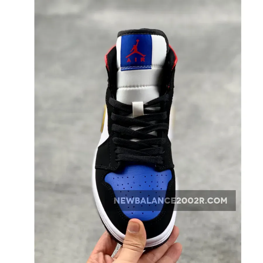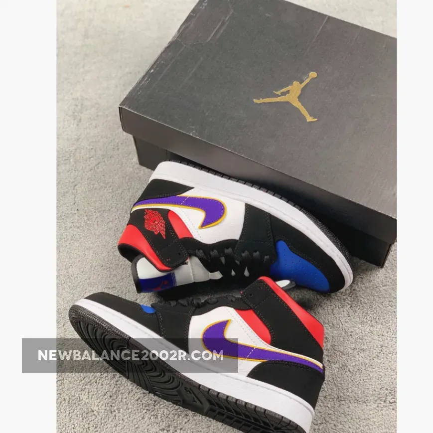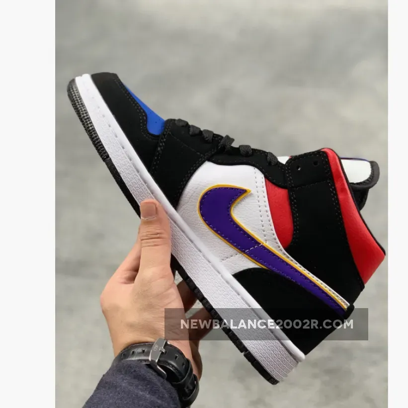 This mid-top Air Jordan 1 features the “Royal” toe box with Swoosh logos that nods to the LA Lakers. White side panels, Black nubuck overlays, Gym Red accents atop a White midsole and Black rubber outsole completes the design.