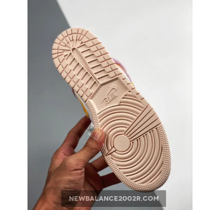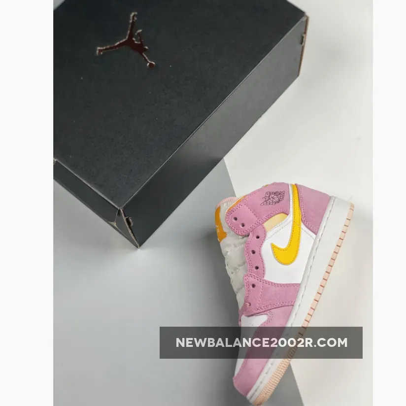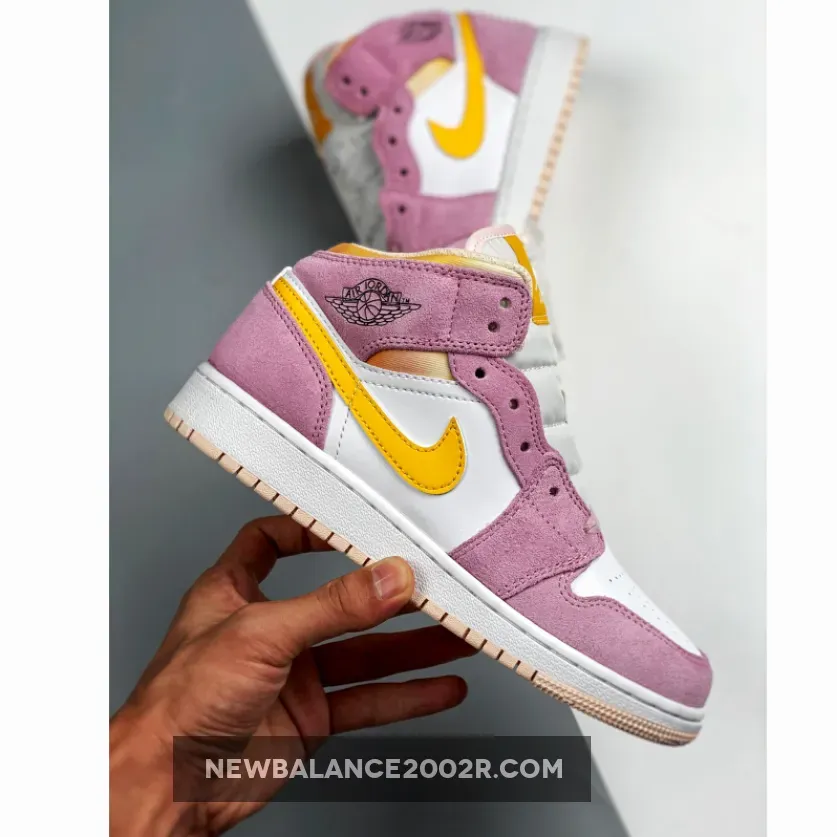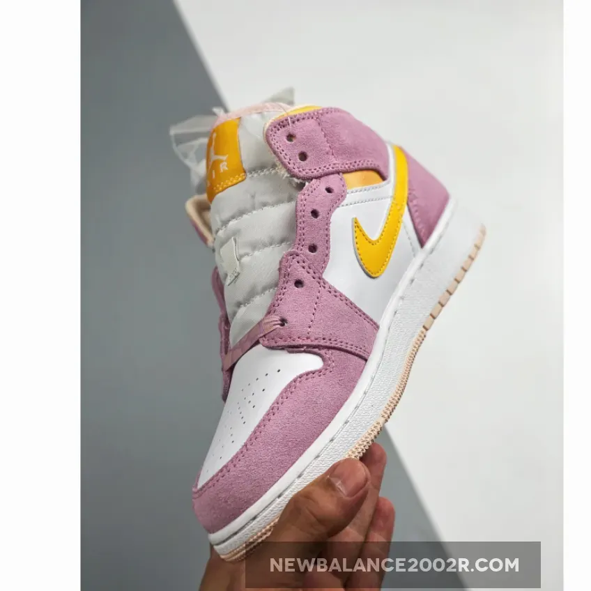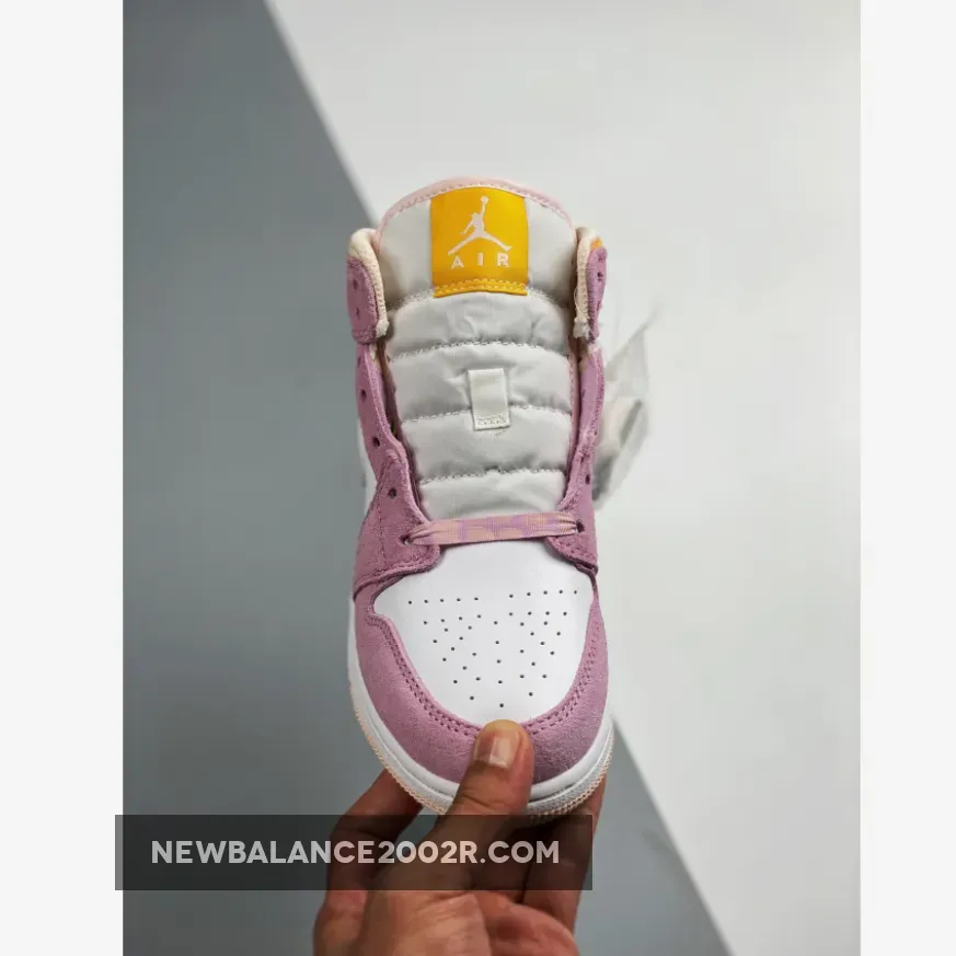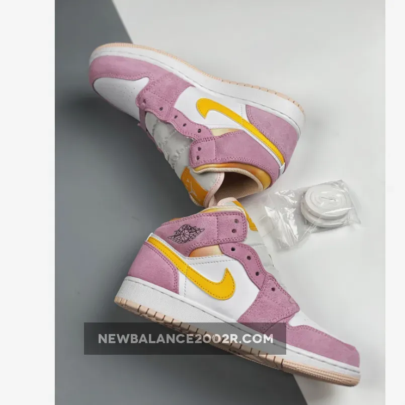 Dressed in a Light Arctic Pink, University Gold, and White color scheme. This mid-top Air Jordan 1 features a White leather base with Arctic Pink suede overlays. A two-tone acid wash textile appears on the collars and laces, white having Gold Swooshes, tongue tags, and insoles. A White midsole atop a Pink rubber outsole completes the design.