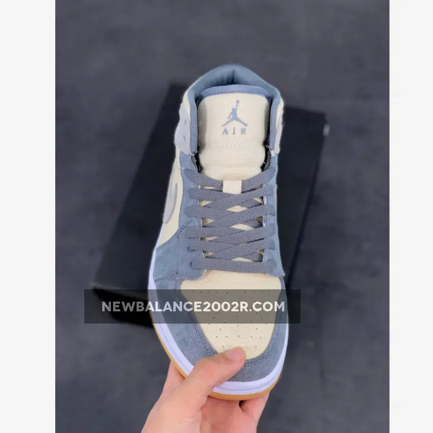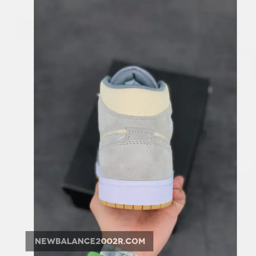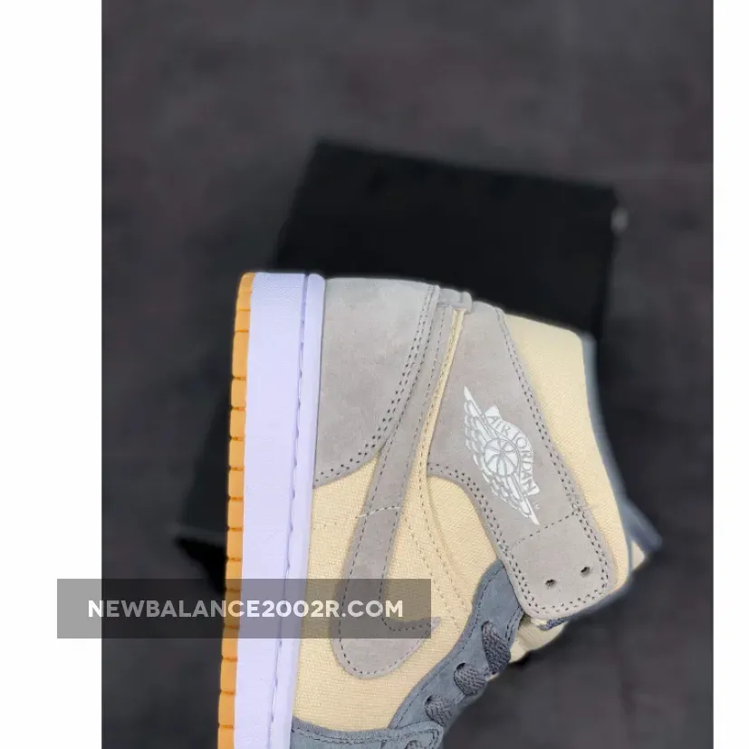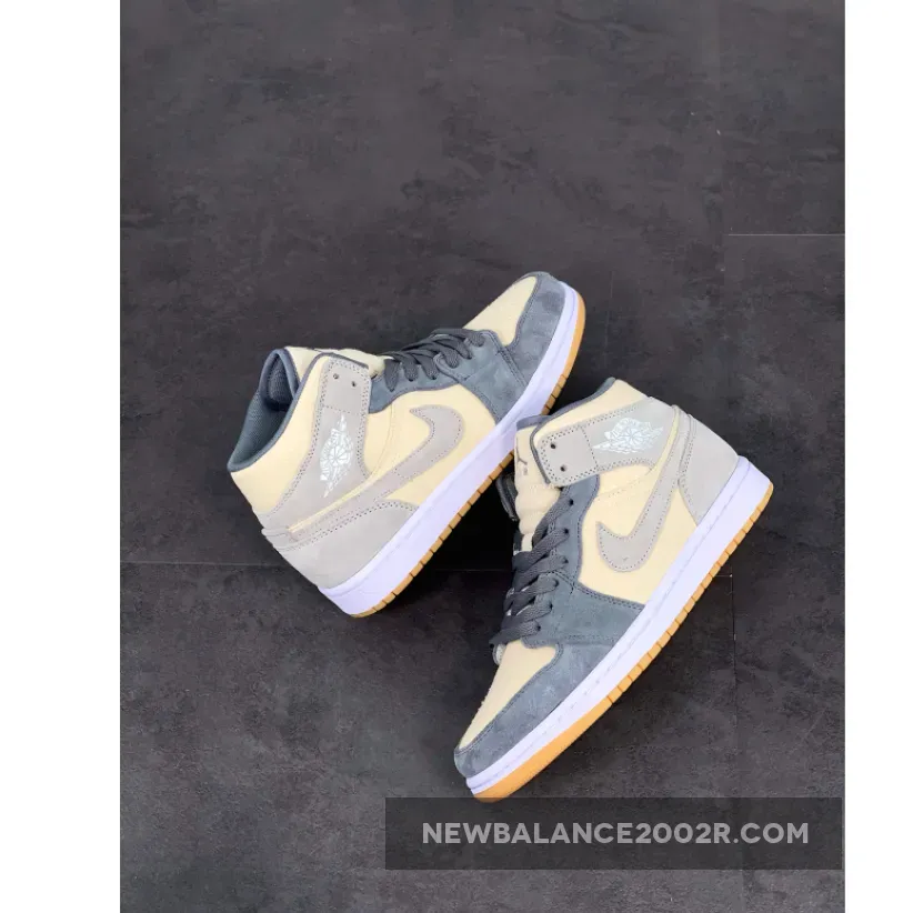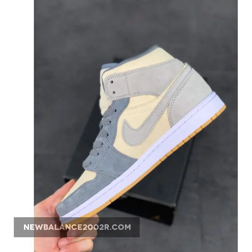 This offering of the mid-top Air Jordan 1 features a Cream canvas base with Grey suede overlays. Grey continues on the tongue branding, laces and lining while the shoe is completed with a White midsole and Gum rubber outsole.
