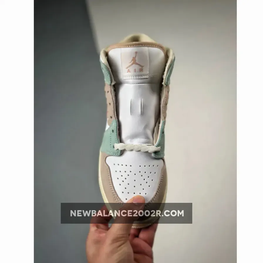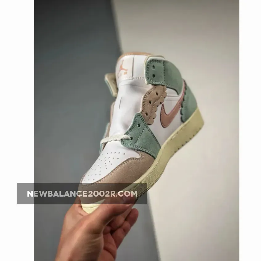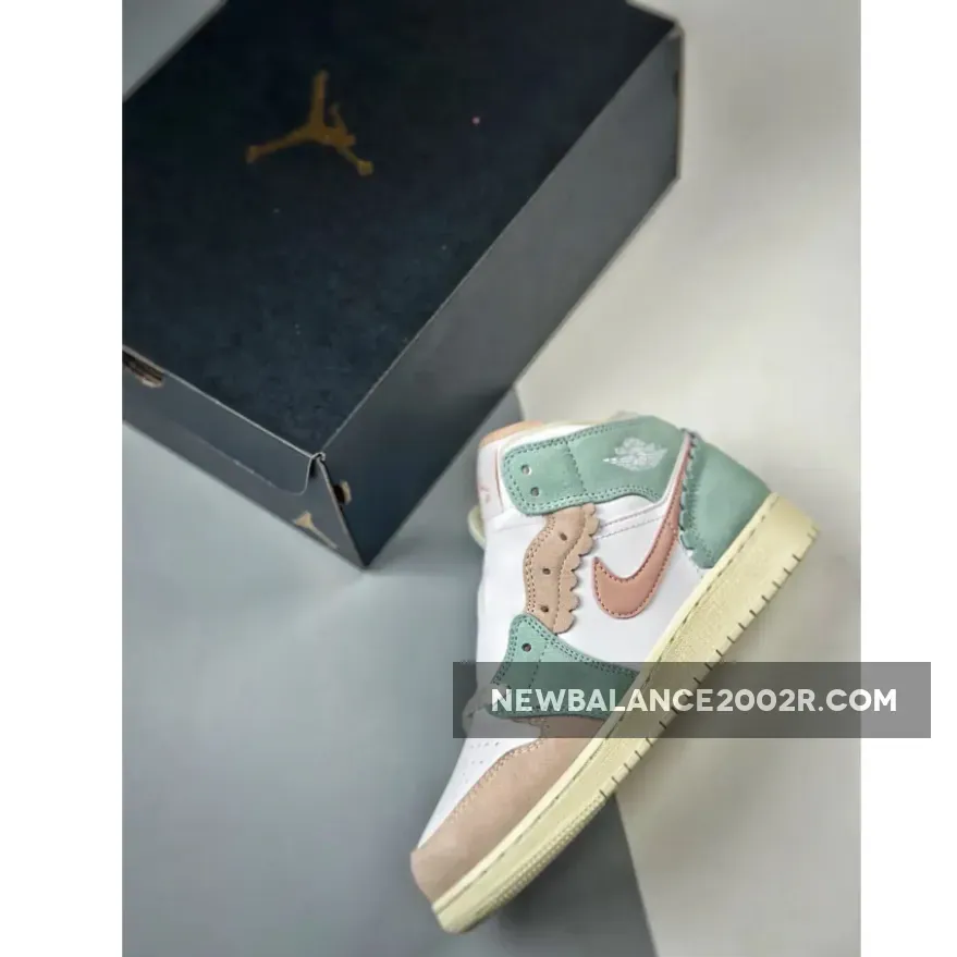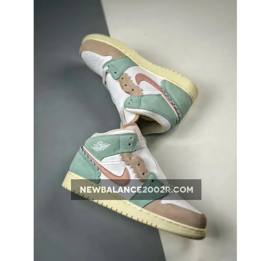 Dressed in a White, Pink Oxford, Jade Ice, Guava Ice, and Coconut Milk color scheme. This offering of the mid-top Air Jordan 1 comes constructed with a White leather base, suede pastel-colored overlays detailed with scalloped edges. Pale orange comes in via the mudguard and upper eye stays, while the lower eye stays, collar overlay and heel panel introduce a soft mint. Branding-wise, you get the signature Swoosh motif partially nestled under one of the scalloped trims for a fun, summery touch. Finally, the gum midsoles introduce a sandy-beige hue and come textured with micro spikes and ridges for traction.