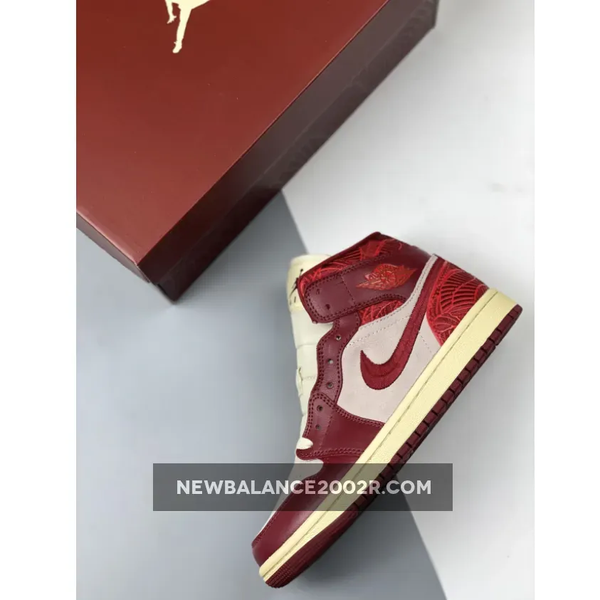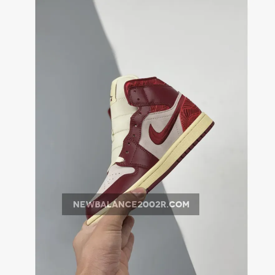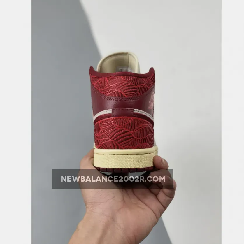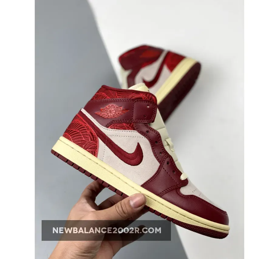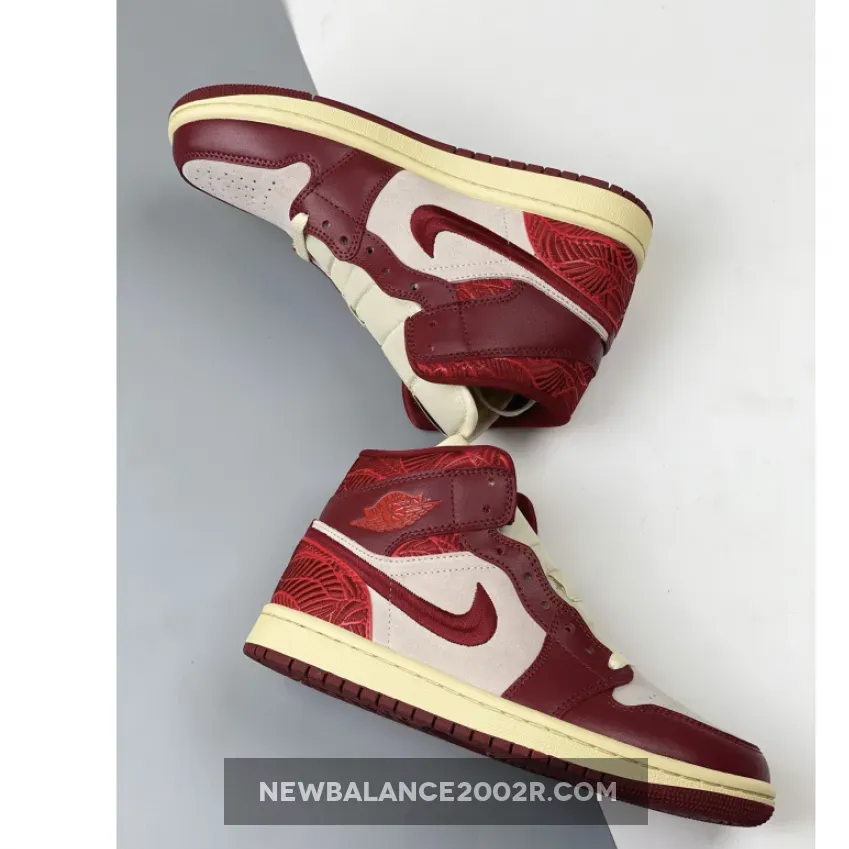 Starting with a mid-top profile, the pair opts for a two-toned upper in light beige and red, almost giving an AJ1 Chicago vibe from 1985. The base features suede material with premium leather overlays.. Intricate leaf embroidery wraps the shoe’s heel and collar and an embroidered Swoosh follows suit.
