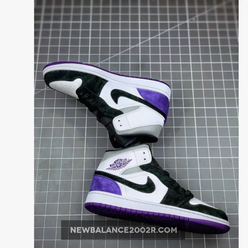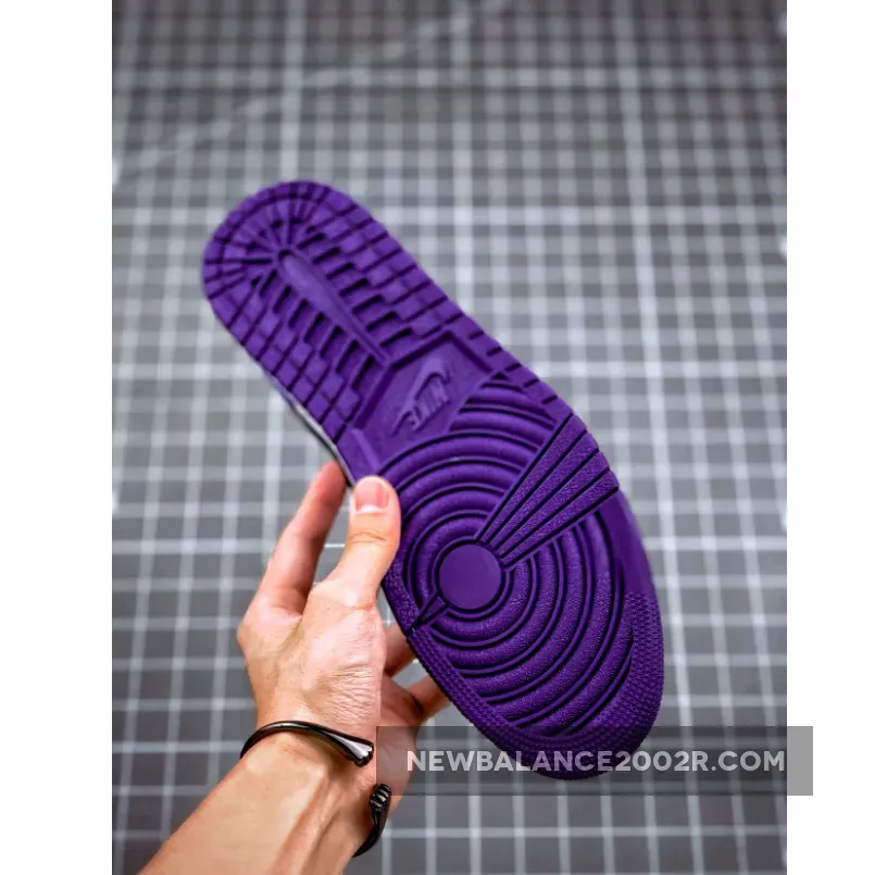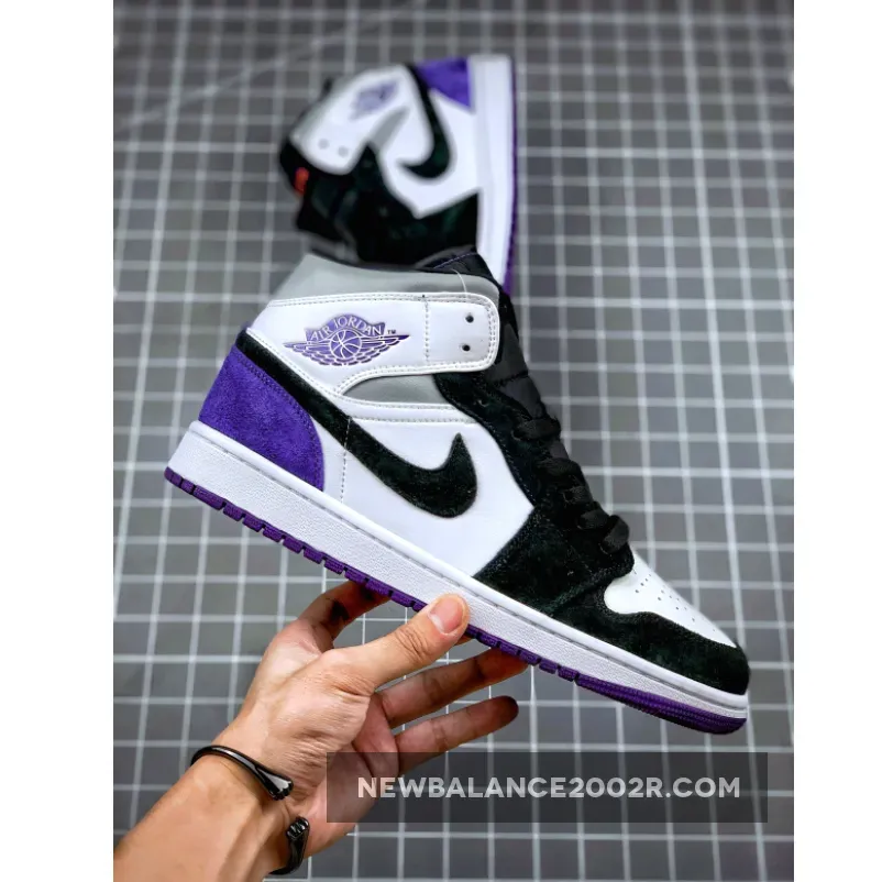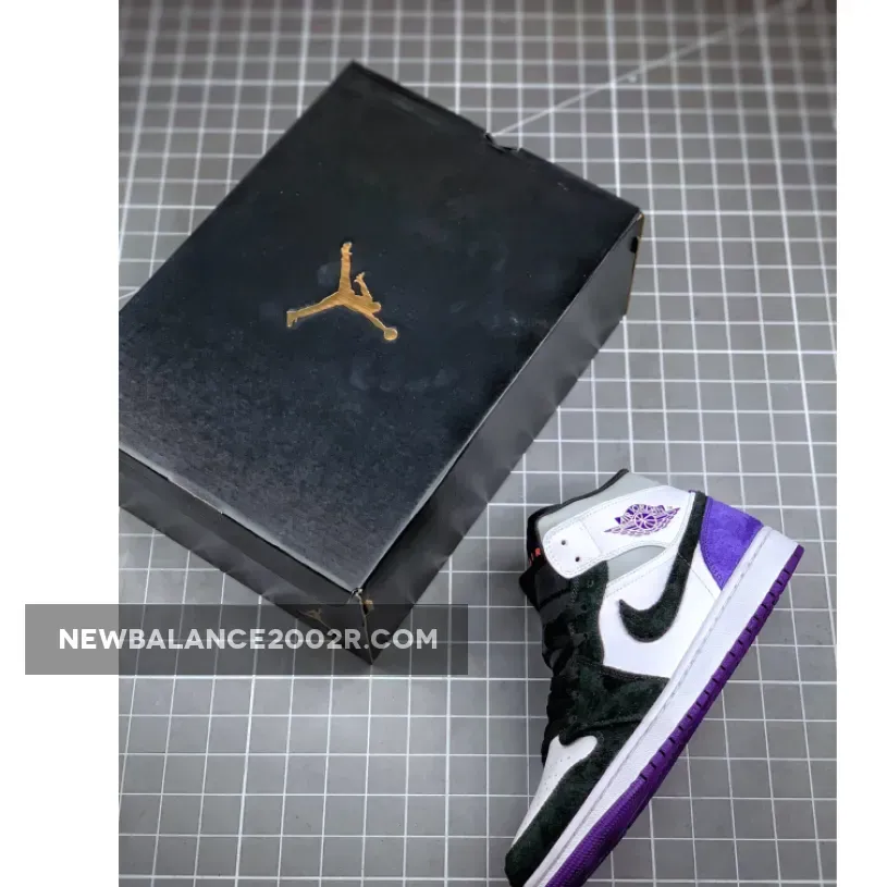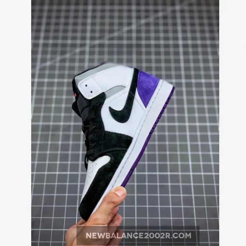 This offering of the mid-top Air Jordan 1 features a White leather base with Grey leather around the collar. Black suede overlays upfront, eyestay and Swoosh logos paired with Purple suede heels. A White midsole atop a Purple rubber outsole completes the design.
