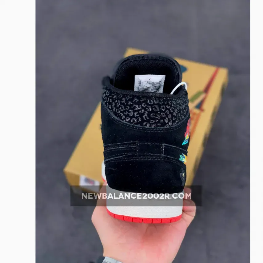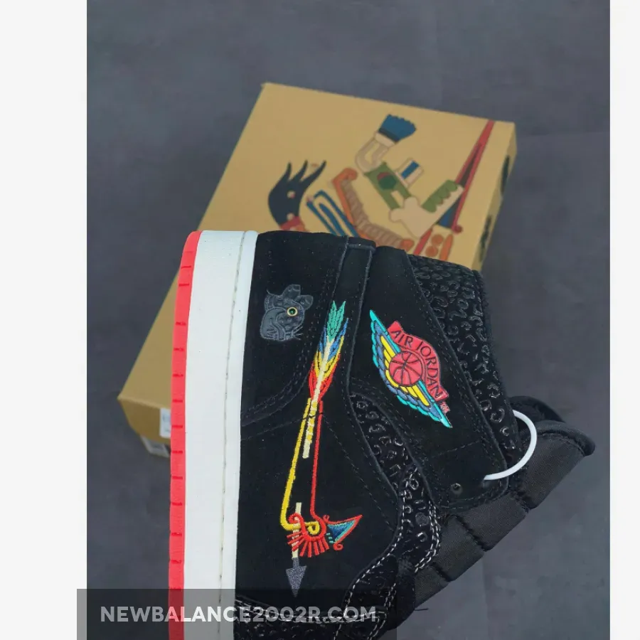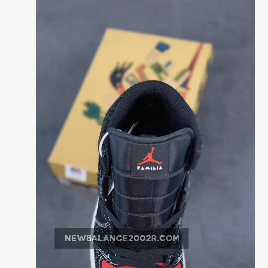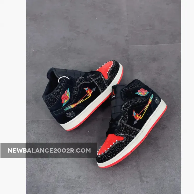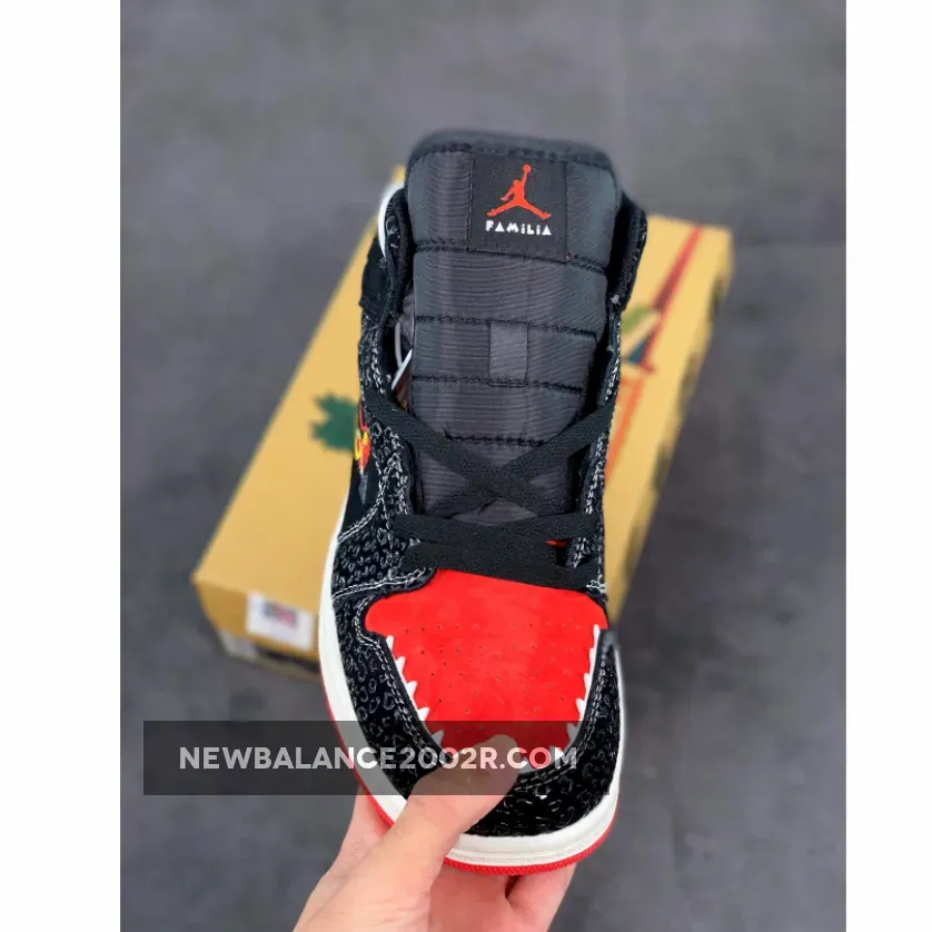 This offering of the Air Jordan 1 Mid sports a Black and Red color blocking covered in decorative details. It features ornamental Swoosh embroidery that nods to Mexican culture with glossy safari-like overlays and a bold Red toe box with spiky teeth. “Familia” branded tongues, colorful Wings logo atop a White midsole and Red rubber outsole completes the design.