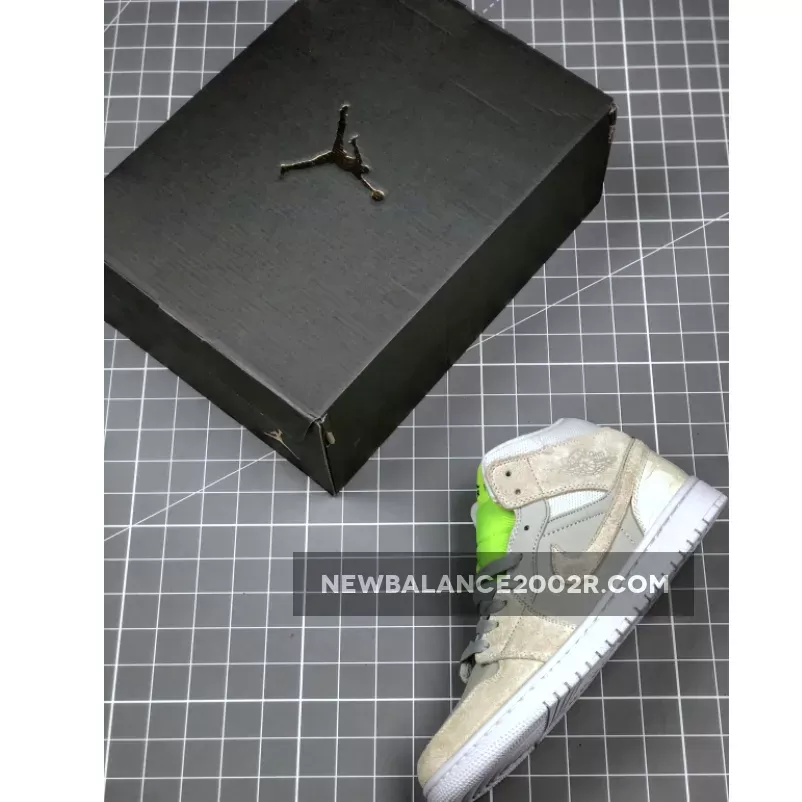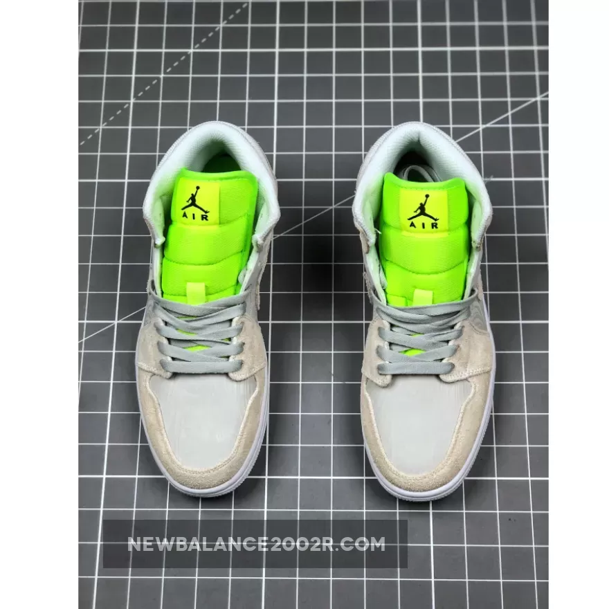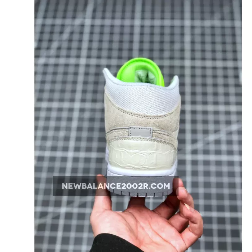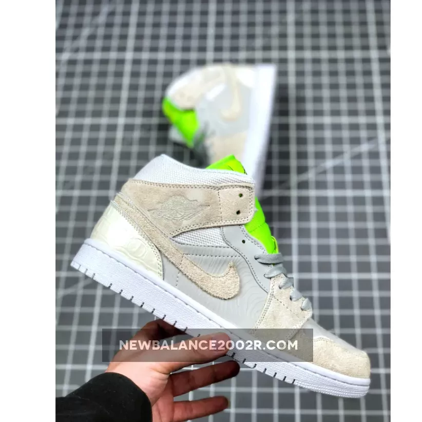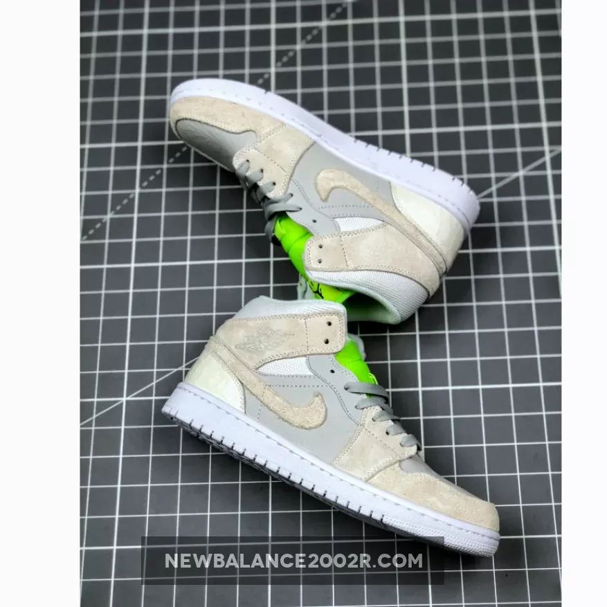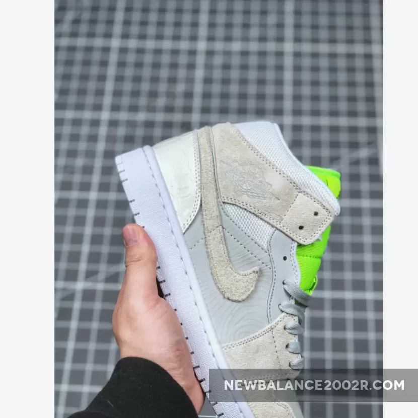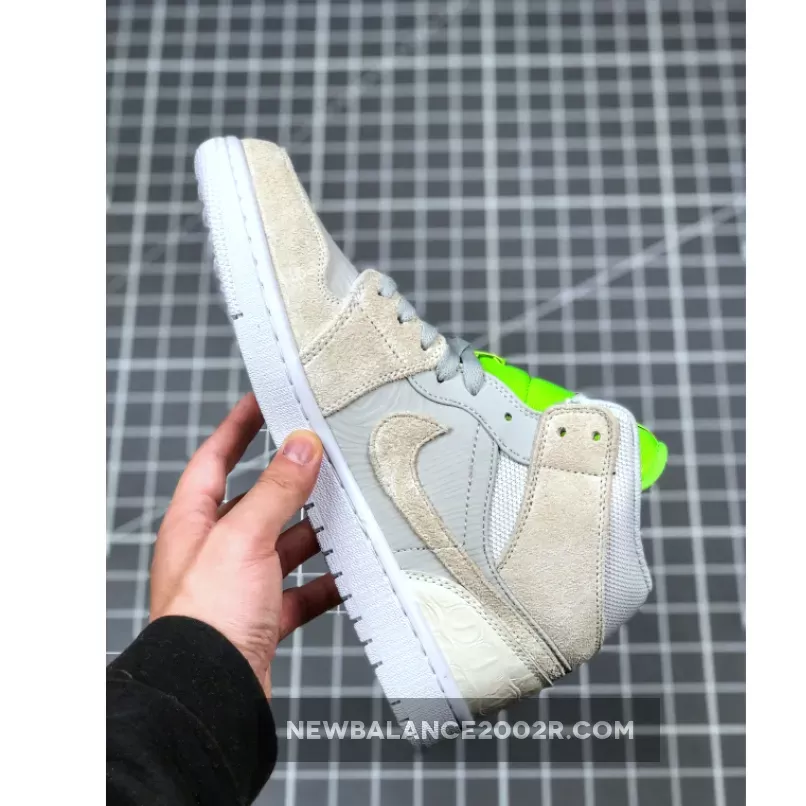 Dressed in a Vast Grey, Ghost Green, and White color scheme. This mid-top Air Jordan 1 features a mix of premium materials including mesh, suede, smooth leather and faux croc all done in its Grey hue. 3M reflective detailing covers the woodgrain-like finish on the side panels and toe, while having a vibrant Green tongue completed with velcro tongue tags. Black detailing, a Swoosh lace dubrae atop a White rubber sole completes the design.