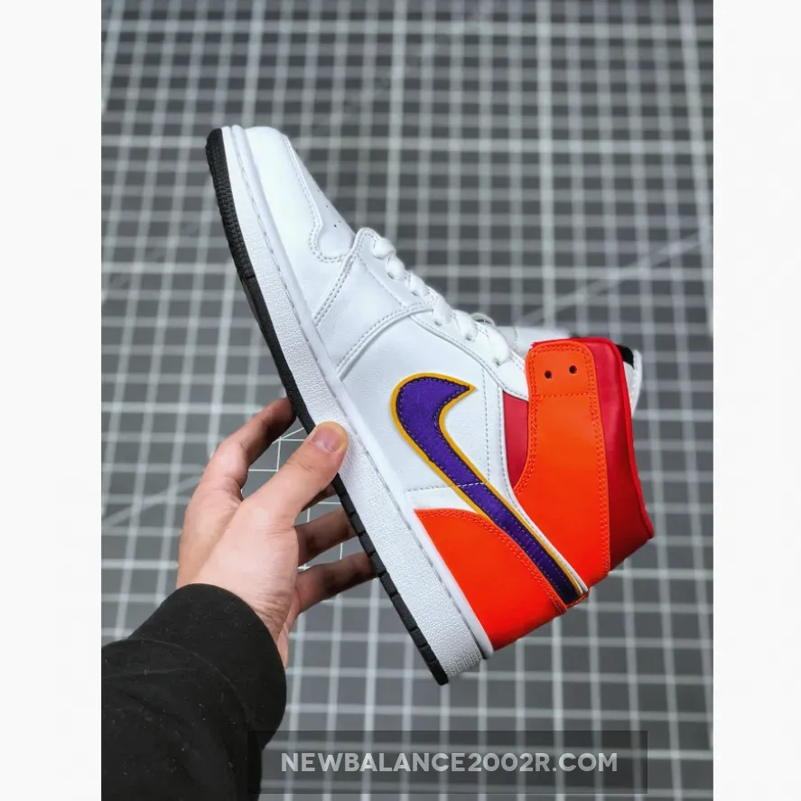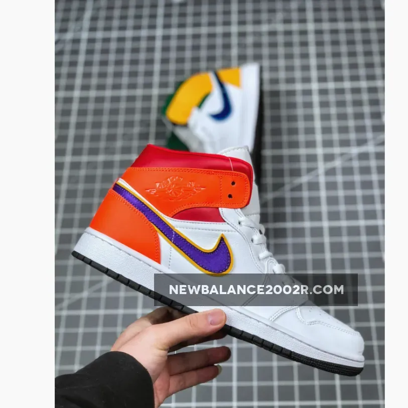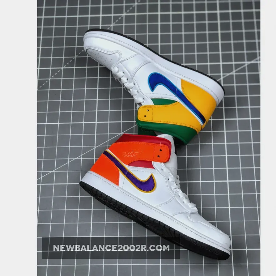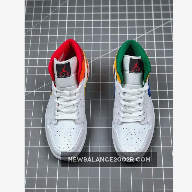This Air Jordan 1 Mid features a clean White leather upper with the left shoe coming with a Green collar and Yellow overlay in the rear, while the right sports a Red collar with Orange in the rear. Both come with Red Jumpman tongue tags and Blue Swoosh logos on the sides outlined in either Light Blue or Yellow on the left and right shoe, respectively. Both are completed with mismatched insoles atop a Black rubber outsole.