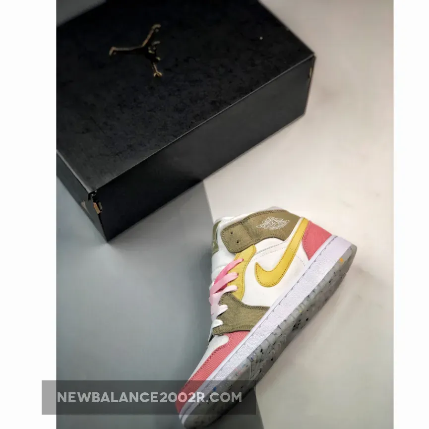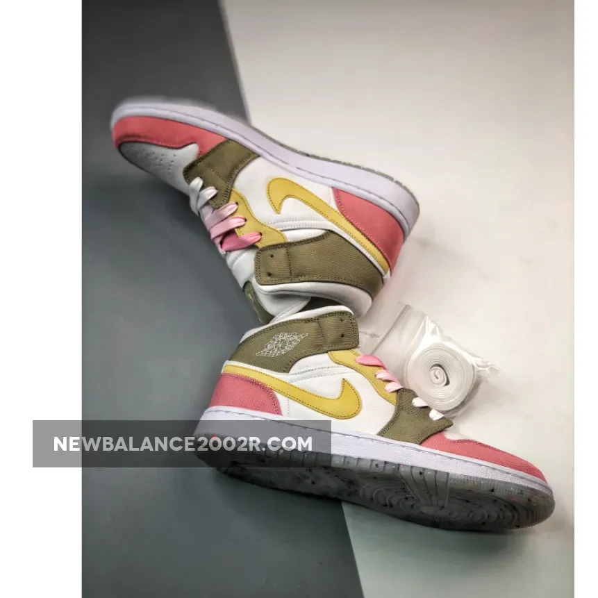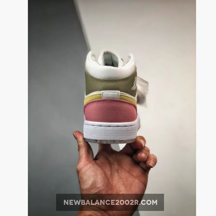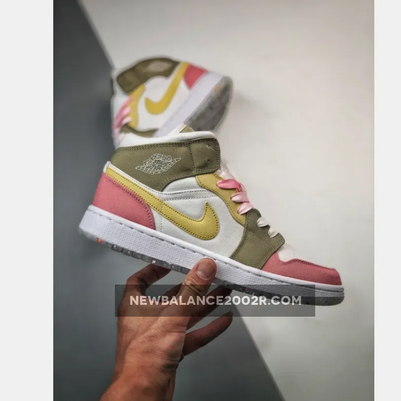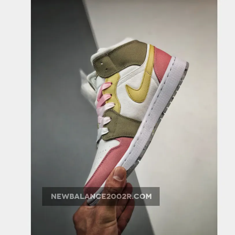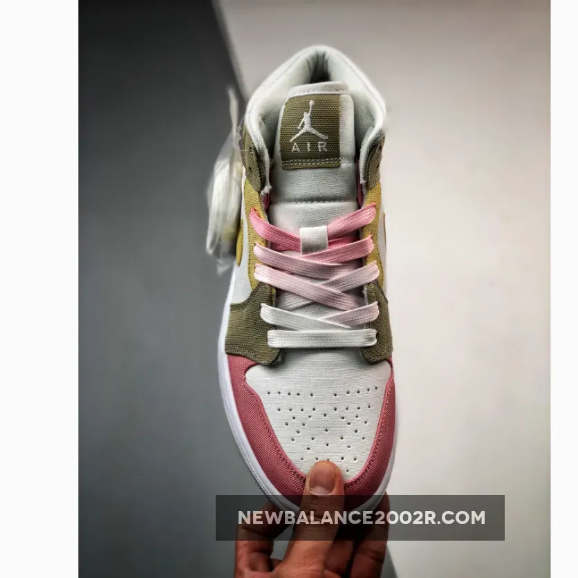 this mid-top Air Jordan 1 comes constructed with canvas on the upper while shades of Pink, Tan, and Yellow adorn the overlays. Next, Lime Green drapes the insoles, and White fills in the midsole. Finally, a translucent Grind rubber outsole finishes the look.