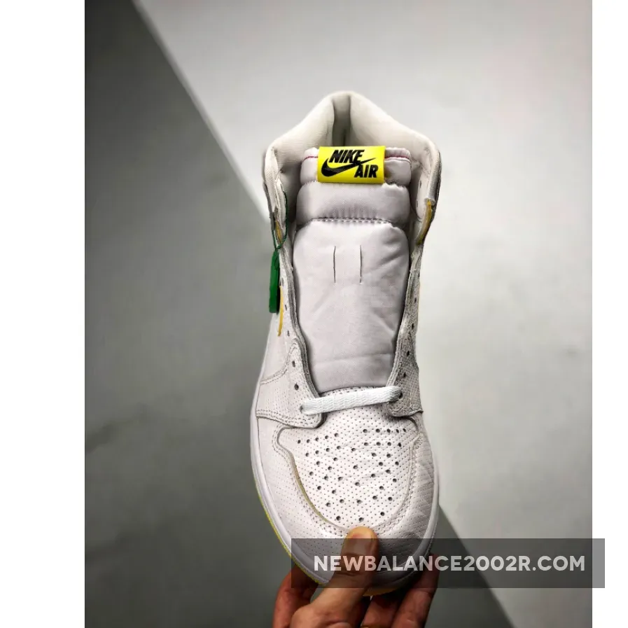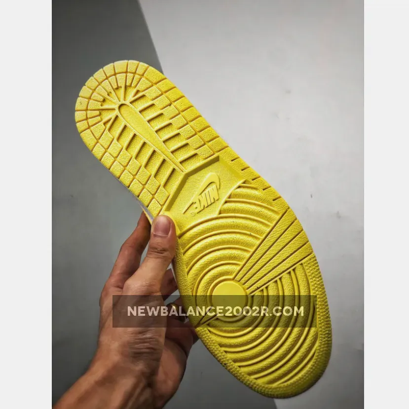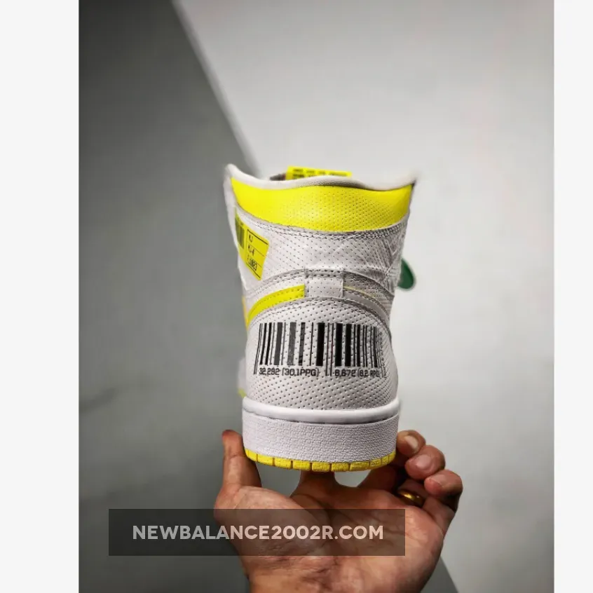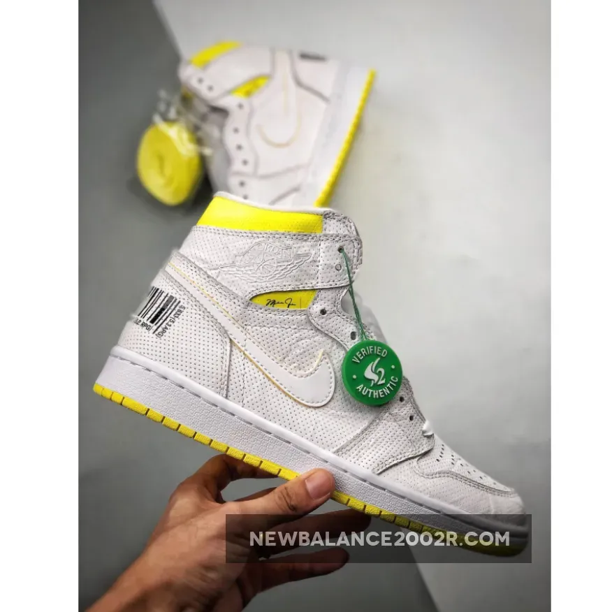 Dressed in a White, Dynamic Yellow, and Black color scheme. This Air Jordan 1 features a White perforated leather upper highlighted with Yellow contrasting accents throughout. Black is used on the special details like UPC barcodes stamped on the lateral ankle – which reads “First Class Flight” and heel, a “23” recycling symbol, along with Michael Jordan’s signature.