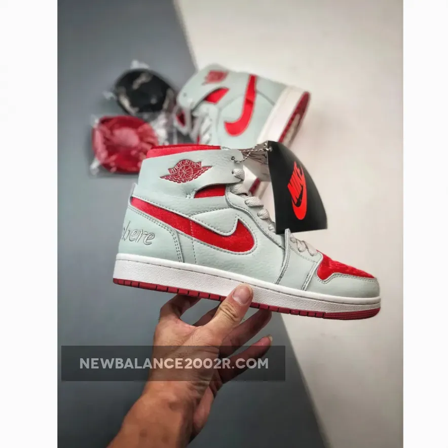 Boasting a reconstructed collar and forefoot tooling, further updates render the tongue’s re-anchoring and the overall ensemble’s added perforations. Casting its tumbled leather overlays in a calm “Cool Grey” tone, a decadent, plush red velvet is denoted along the vamp, upper ankle collar and the recessed midfoot Swoosh. Engaging in a “Sail”-tinted midsole underfoot, “Anytime, Anywhere” comes embroidered along the heel in a color-matched grey whereas pink hearts conjoin with the tongue and insoles Zoom Air branding.