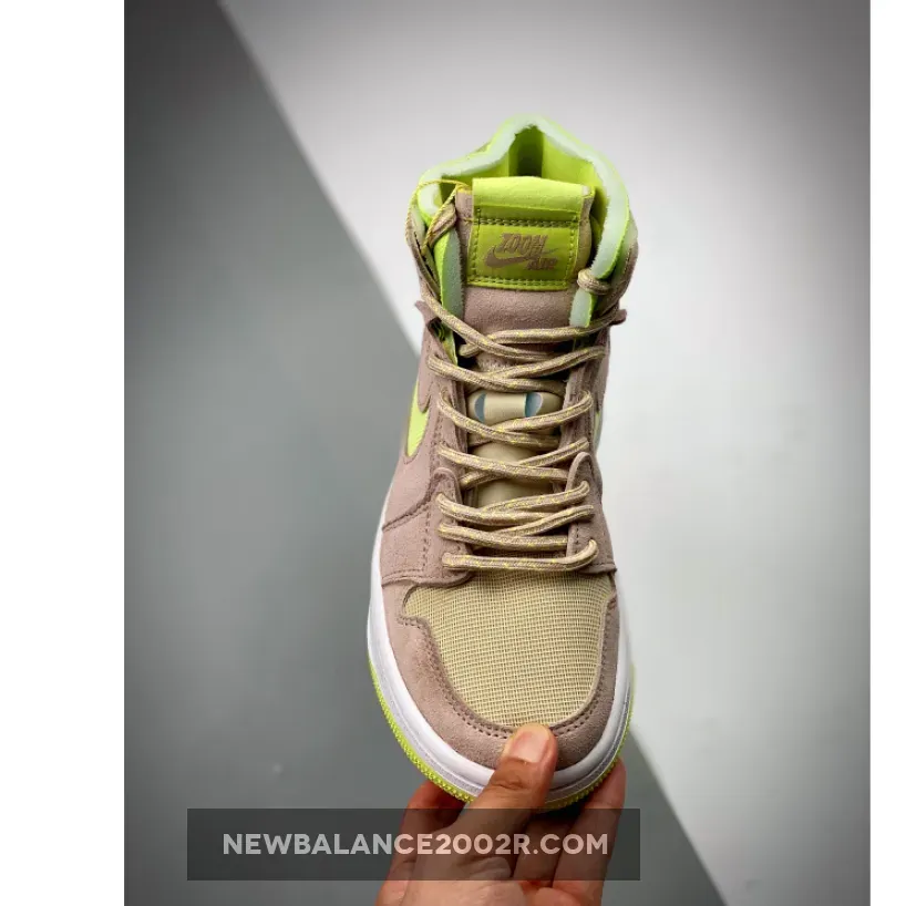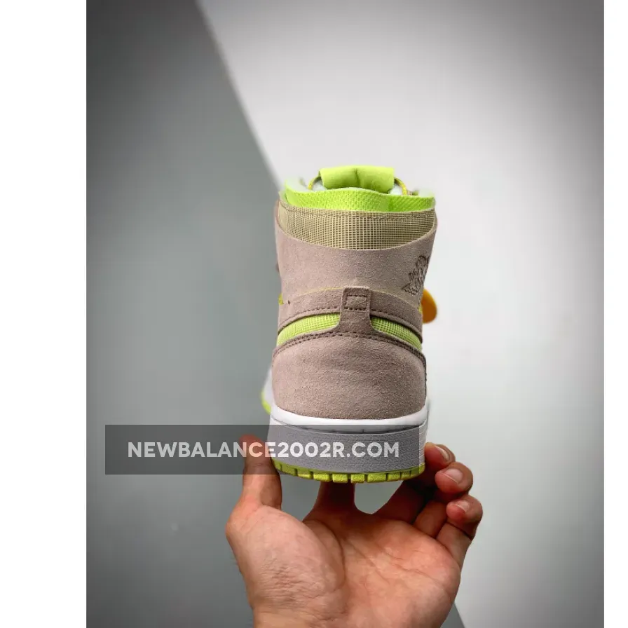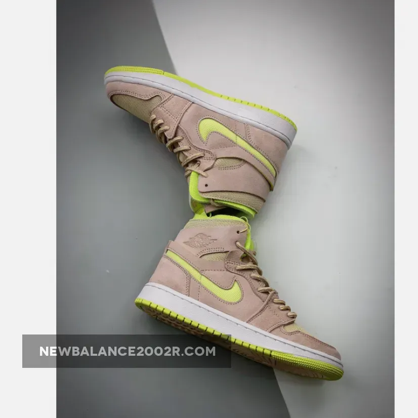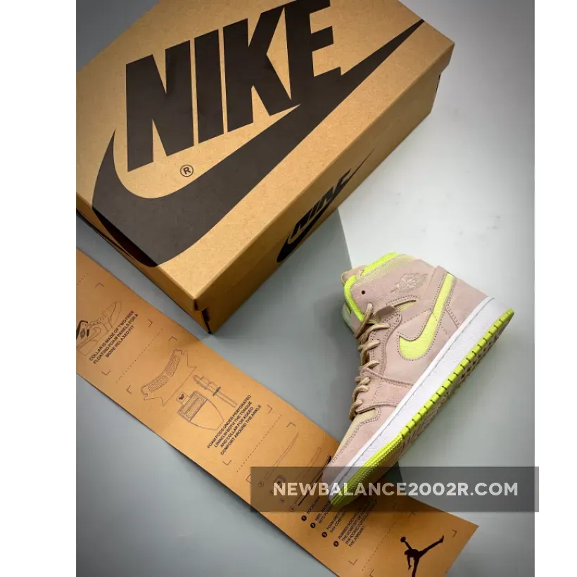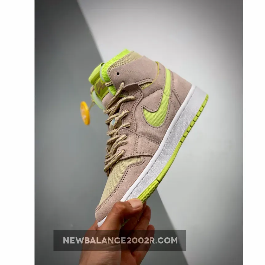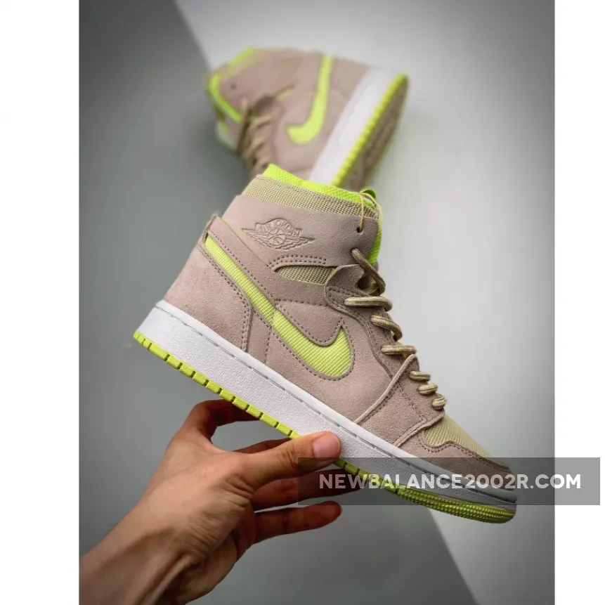 Dressed in a Pearl White, Fossil, Lemon Twist, and White color scheme. This offering of the Air Jordan 1 comes constructed with heavy-duty mesh on the base, cut-out Swooshes, and ankle collar while a suede material is used on the overlay and tongue. A clean White midsole atop a two-tone rubber outsole completes the design.