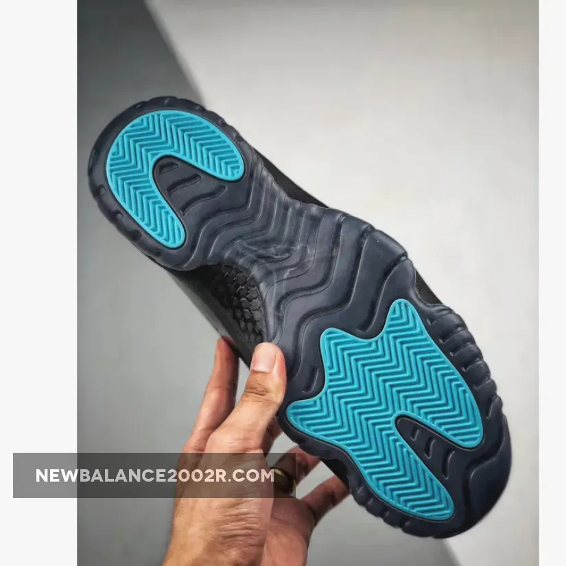 The top of the Retro Gamma Blue has a black finish throughout and is made of a customary combination of ballistic net and slick patent leather. The sneakers branding features include the number “23” engraved in Varsity Maize and a turquoise Jumpman on the heel tab. A top-loaded full-length Air unit is added to the plush Phylon midsole, which is supported by a carbon fiber spring plate. Herringbone suction pods are used on a translucent rubber outsole.