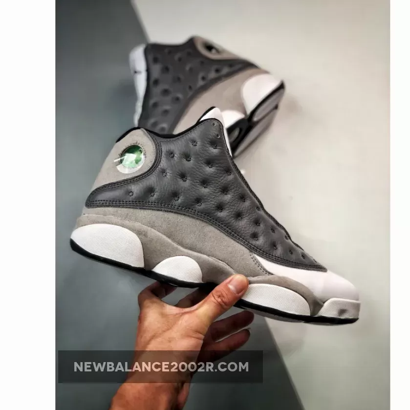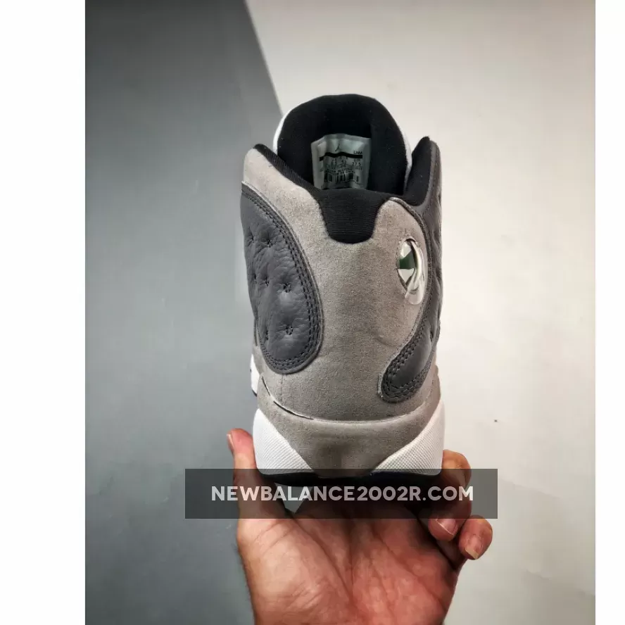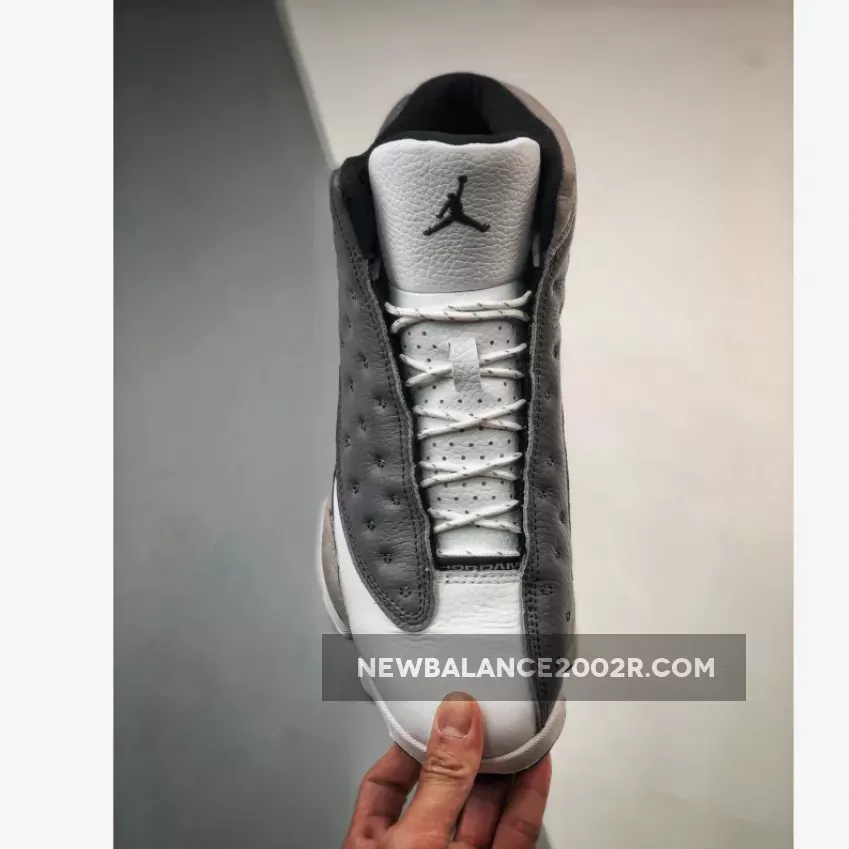 Dressed in a Atmosphere Grey, White, University Red and Black color scheme. This Air Jordan 13 features a Dark Grey leather upper with a lighter shade of Grey on the mudguard and riding up the heel. A White leather toe, Black lining, Red accents and the models signature hologram heel logo completes the design.