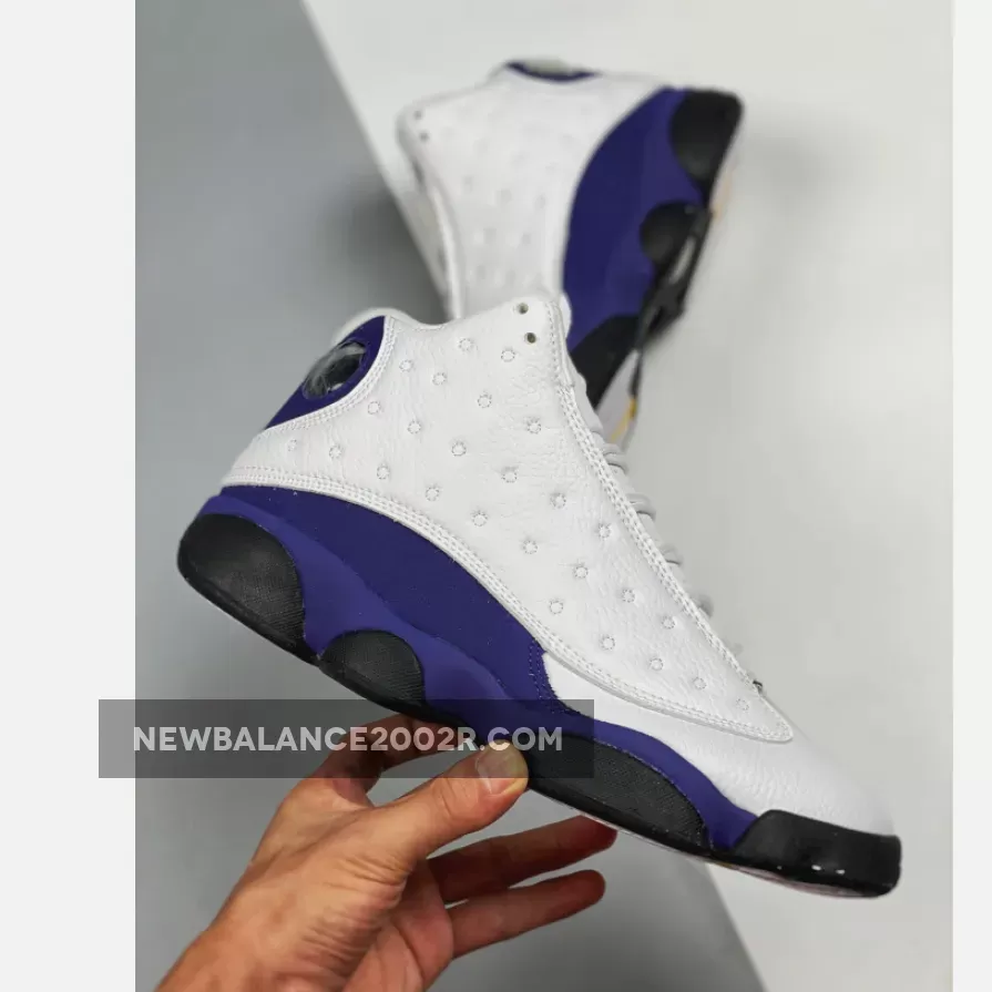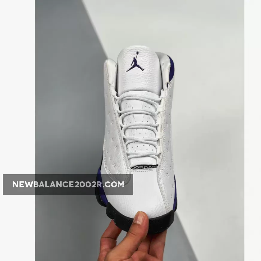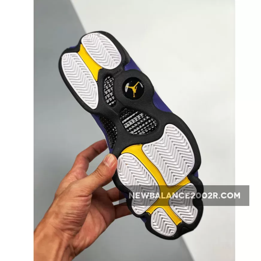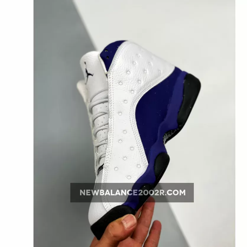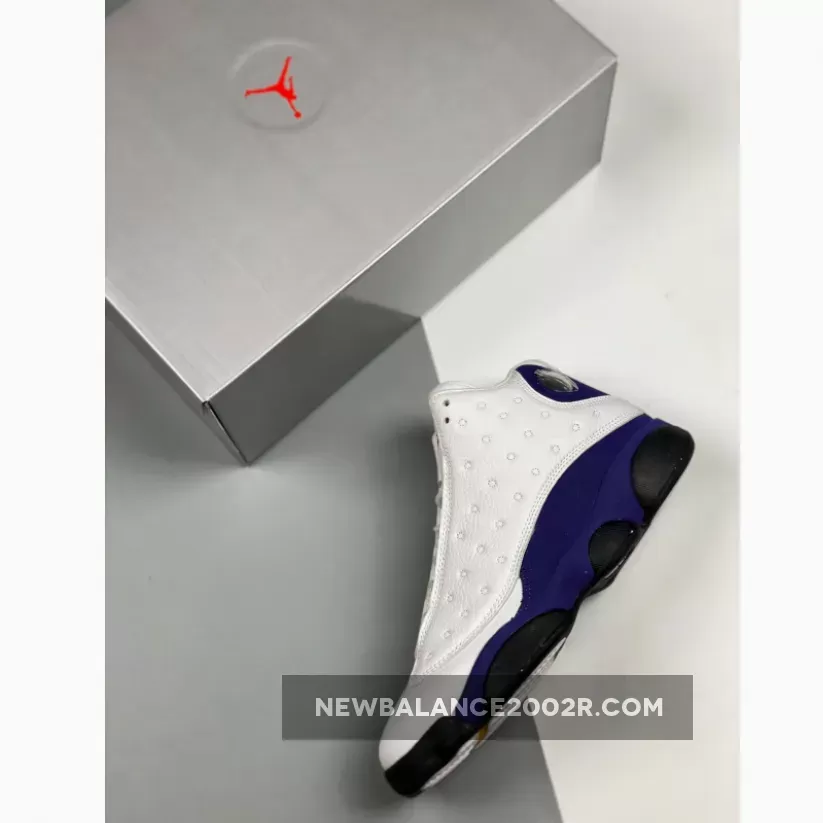 Dressed in a White, Black, Court Purple and University Gold color scheme. This Air Jordan 13 features a White leather upper with Purple overlays atop a Black midsole. Additional details includes University Gold contrasting accents to complete that LA Lakers vibe.